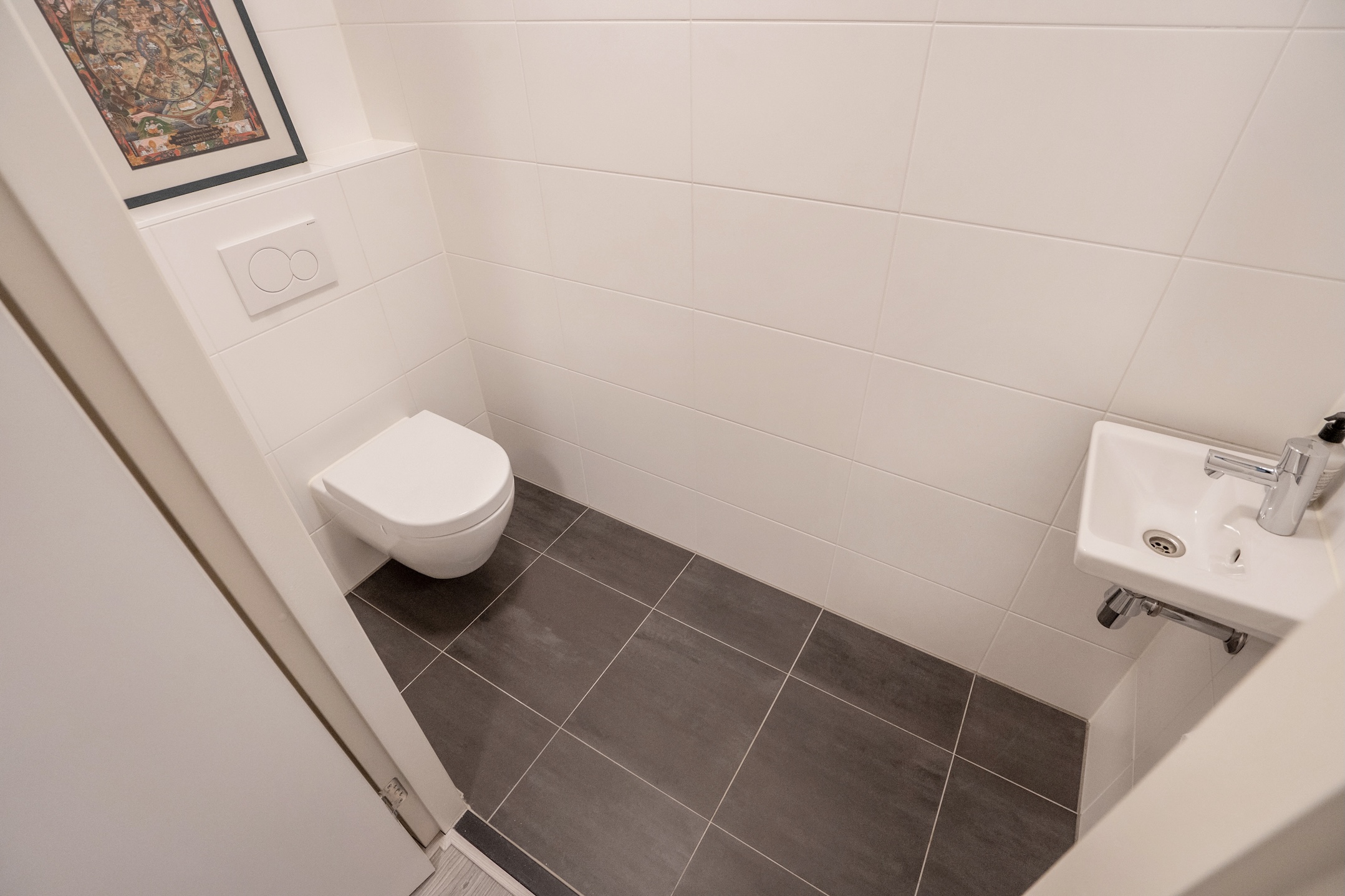 A door in the living room leads you to the hallway with a deep closet that offers plenty of storage space and houses the technical installations out of sight. A modern bathroom, the smaller of the two, with a tiled floor, deep walk-in shower, vanity unit, and toilet.