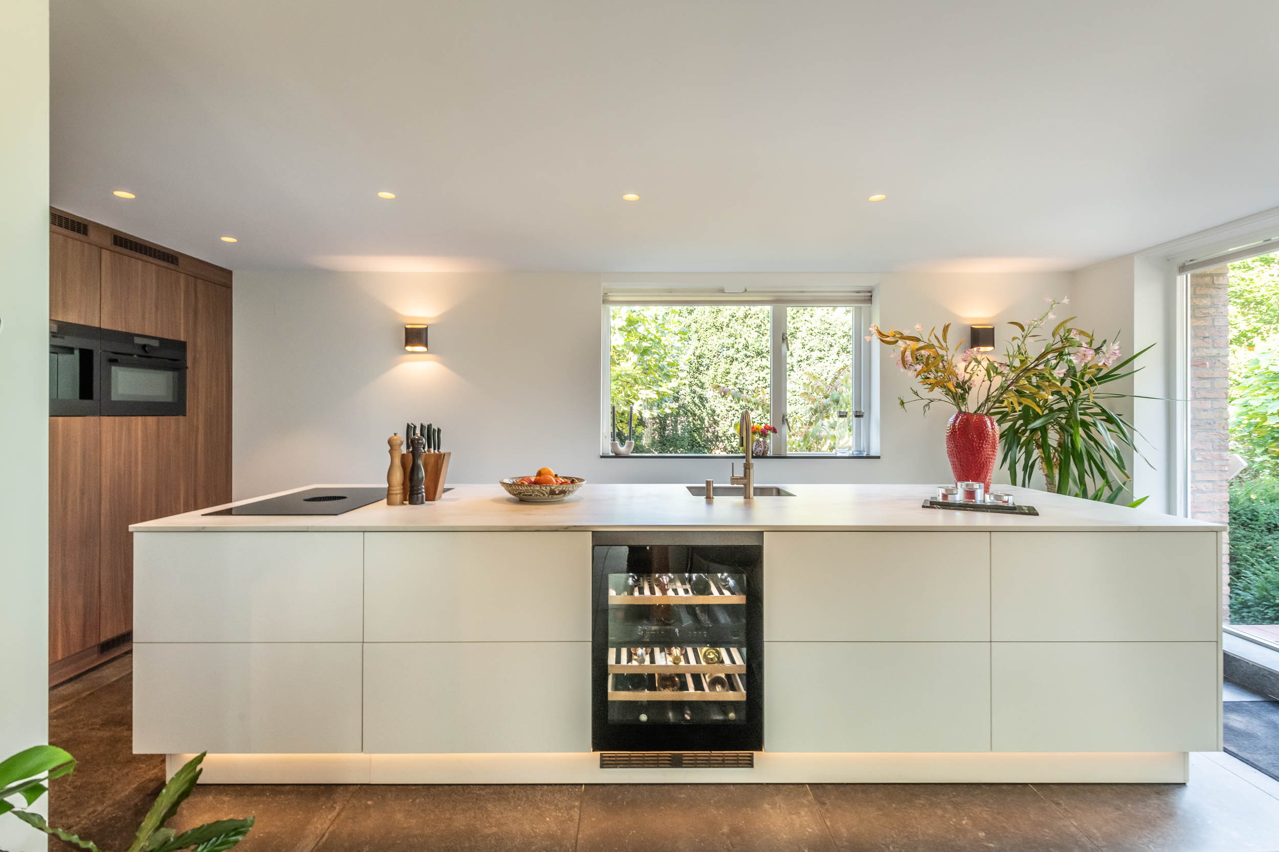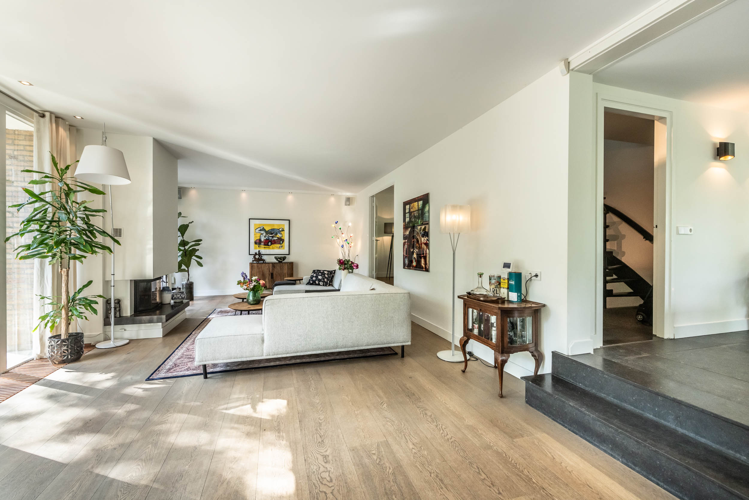 Entrance hall, spacious hallway with toilet and urinal, bright and spacious living room with fireplace, oak flooring and doors to the front terrace. A double door connects to the second living room/TV room with large windows and a view of the back garden. Luxurious, tailor-made kitchen-diner (’t Spant in Heemstede, 2022) featuring underfloor heating, a sink/kitchen island and various built-in appliances: wine climate cabinet, ovens, Quooker with sparkling water feature, coffee machine, Bora electric hob with flex zones and dishwasher. Door to the side garden.