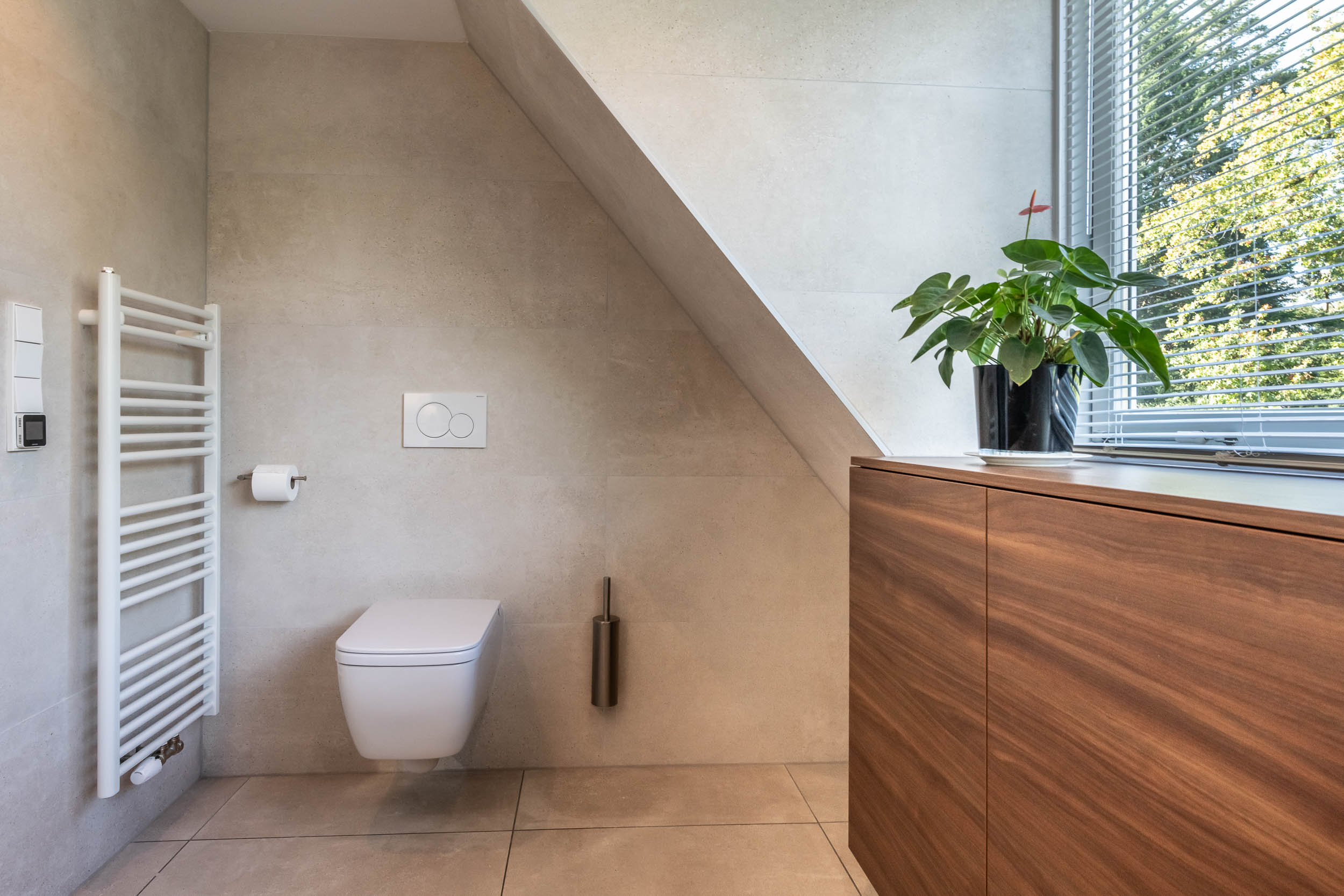Landing, three bedrooms, including the spacious master bedroom (formerly two rooms) with walk-in wardrobes on both sides. Modern, tailor-made bathroom (’t Spant in Heemstede, 2022) with large dormer window, double washbasin unit, toilet, ample cupboard space, underfloor heating, freestanding bathtub, walk-in shower with Sunshower and hand shower.
