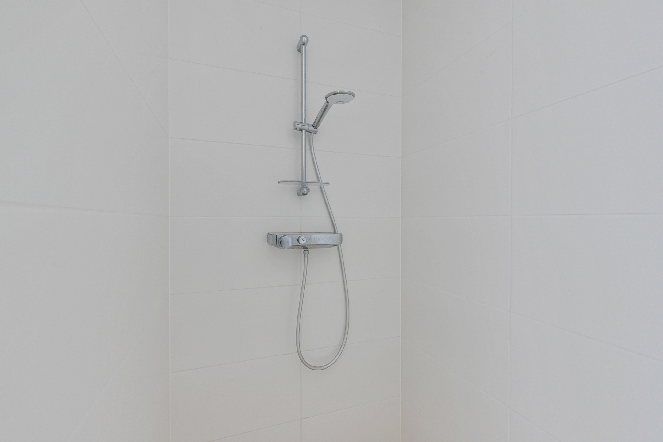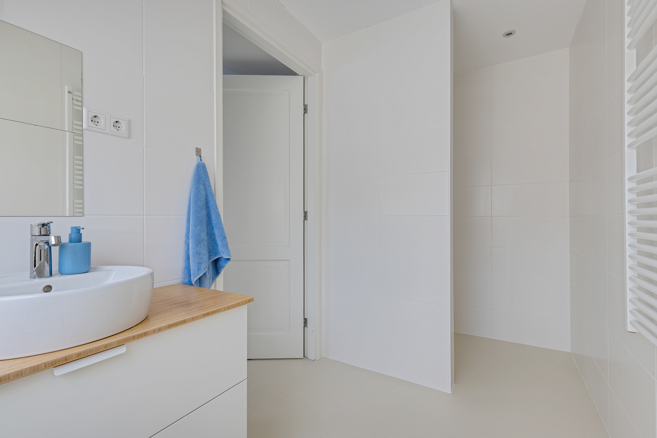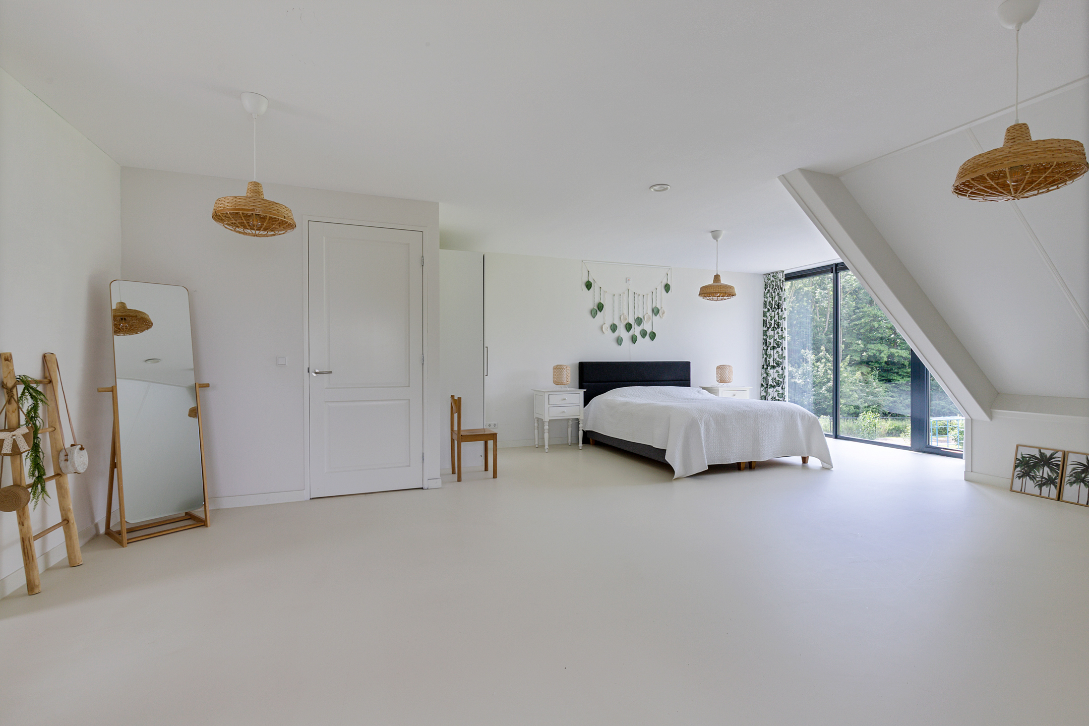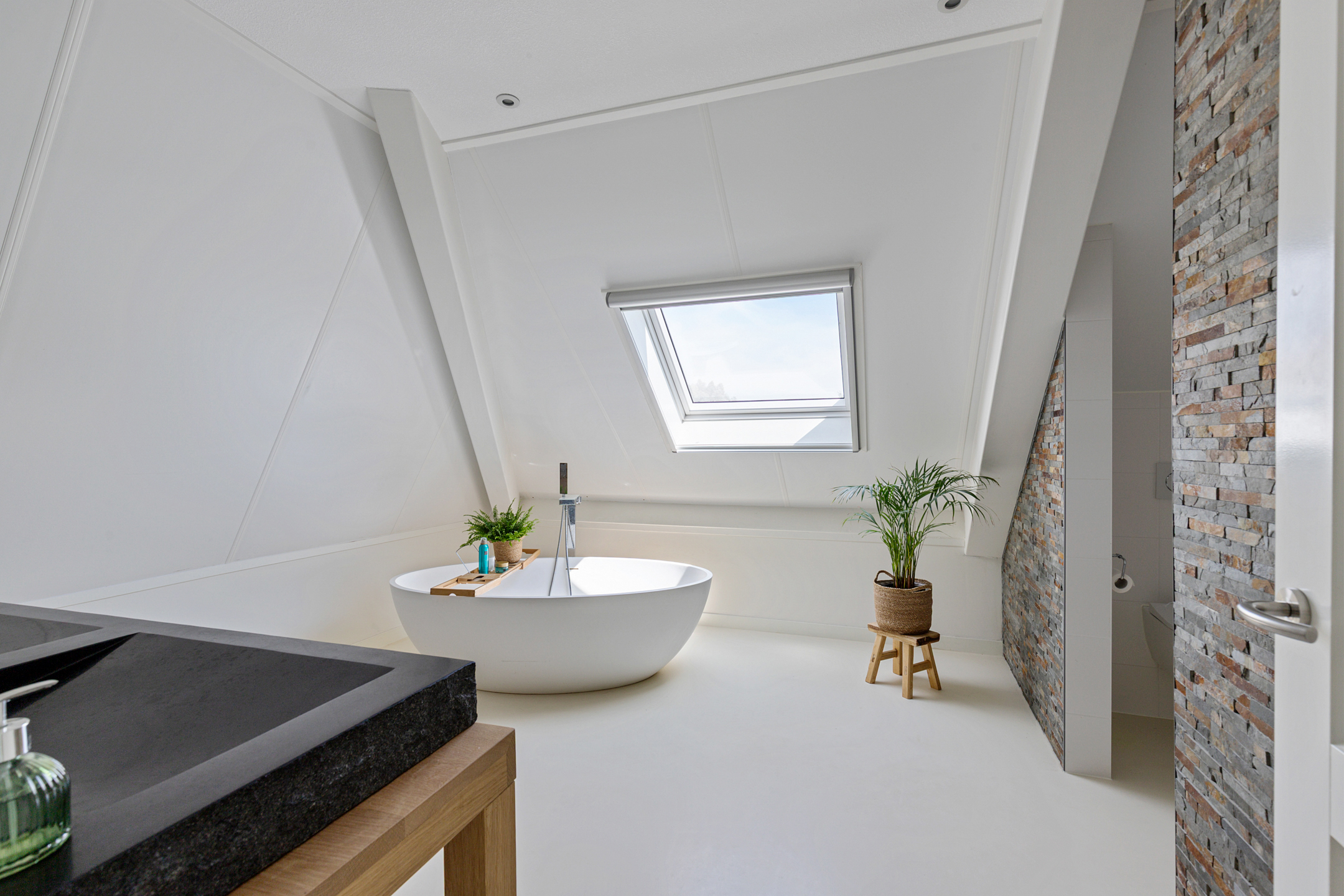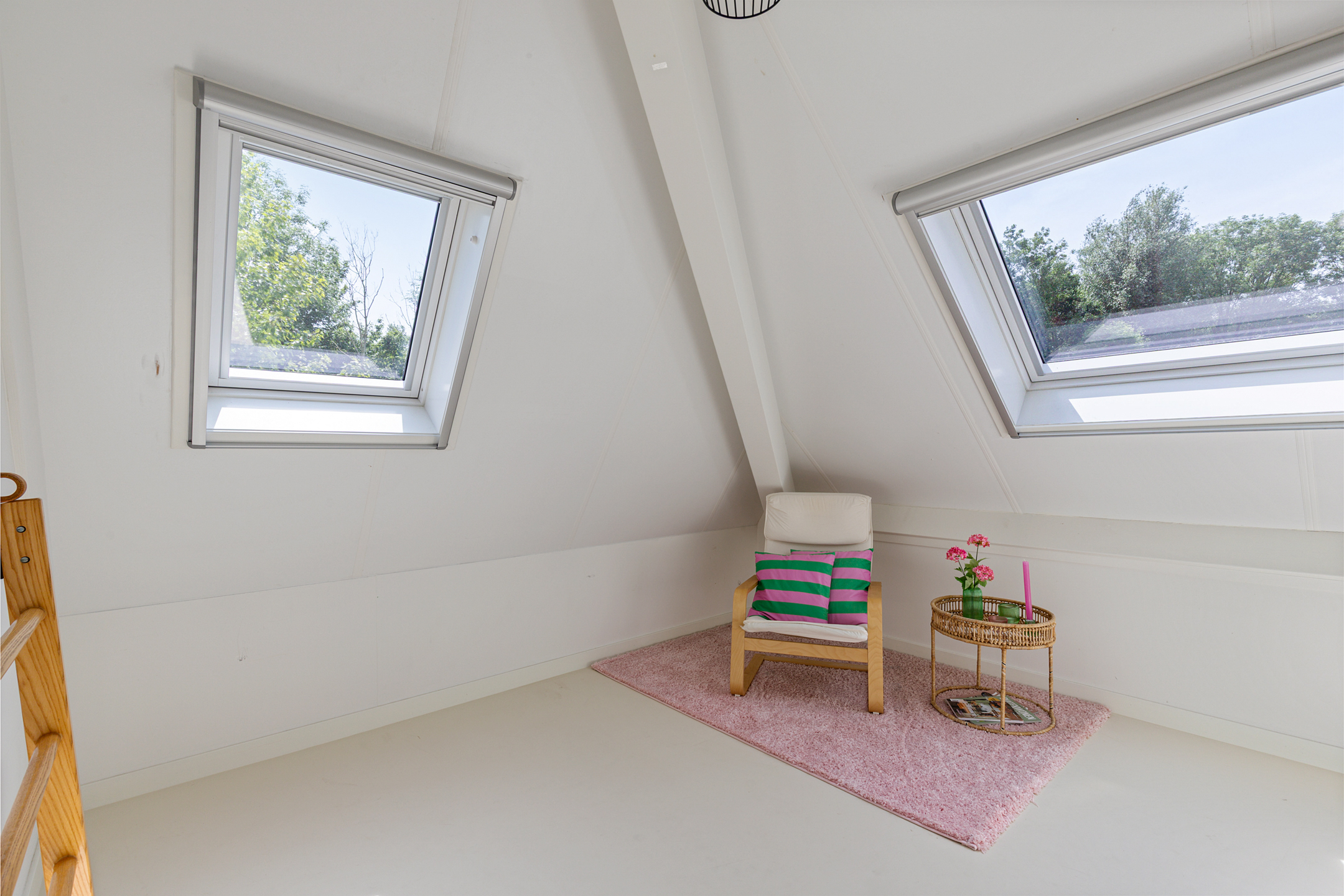 A fixed staircase leads to the fully insulated attic, with full standing height along the length of the house. Industrial steel trusses and rustic wooden beams lend this space character. Three Velux roof windows ensure ample light. Ideal as storage or for conversion into additional living or work areas.