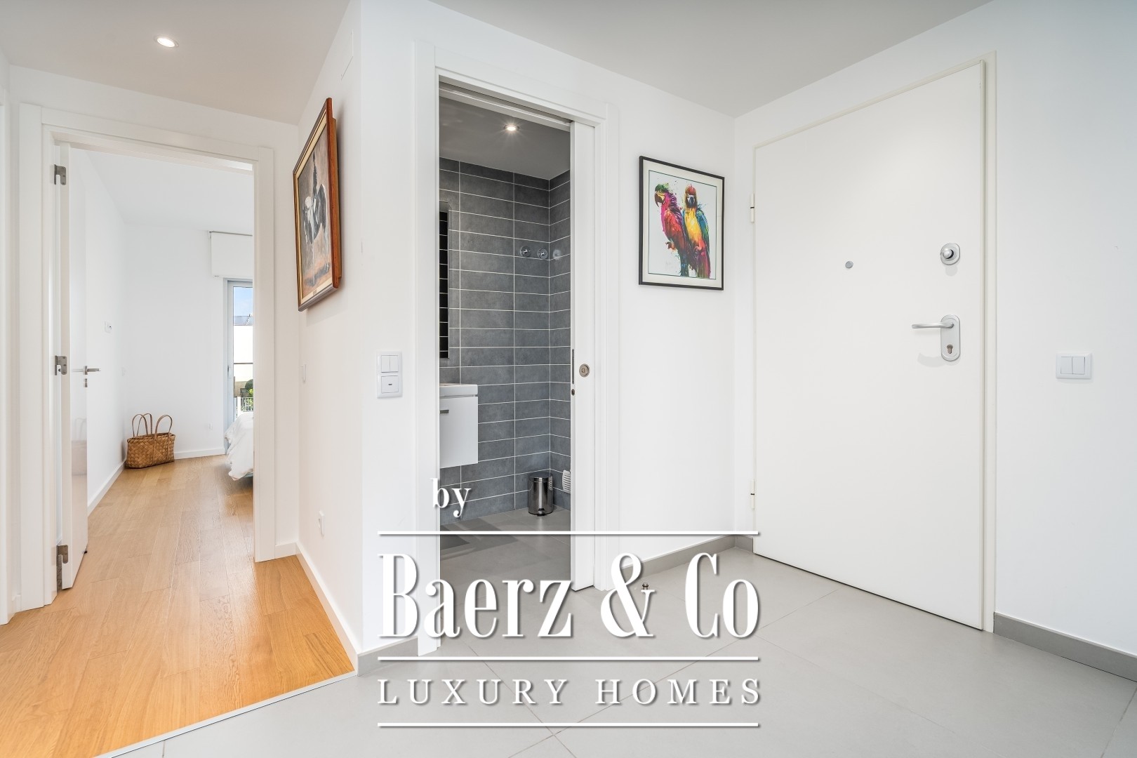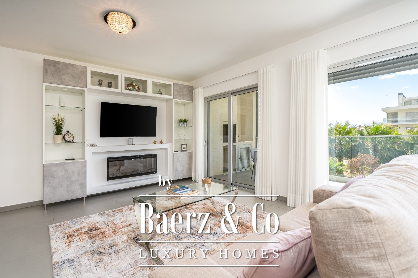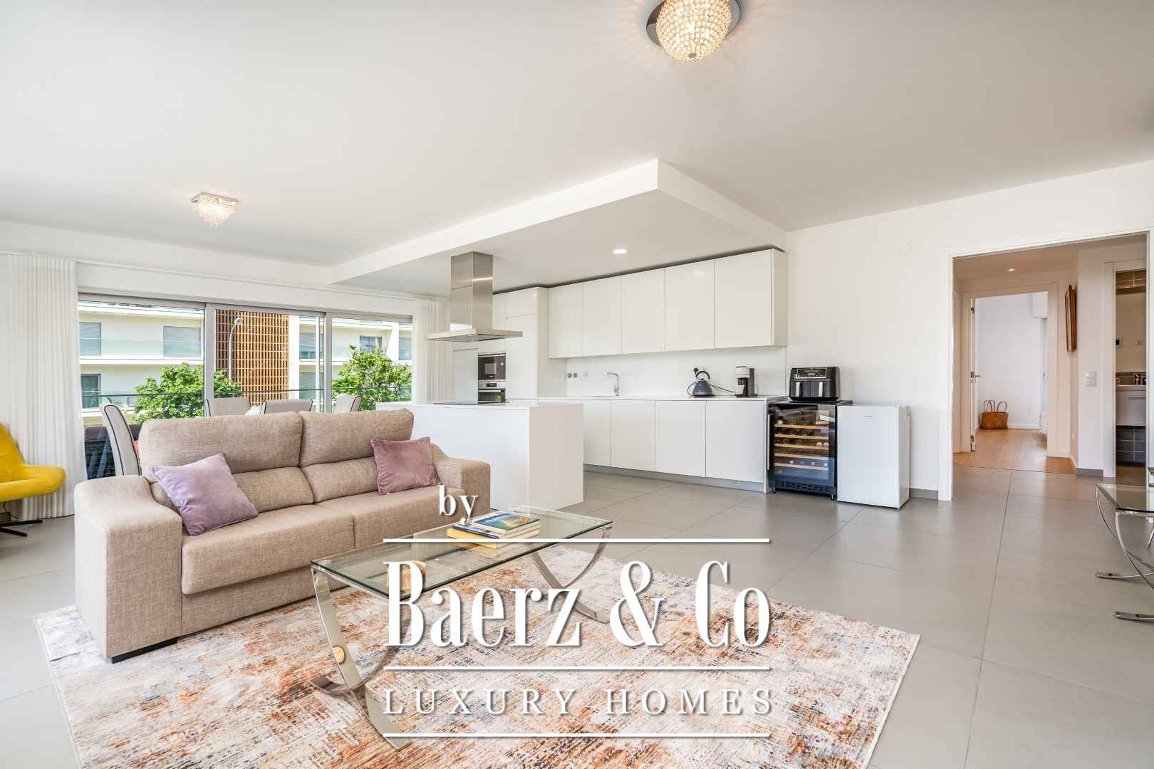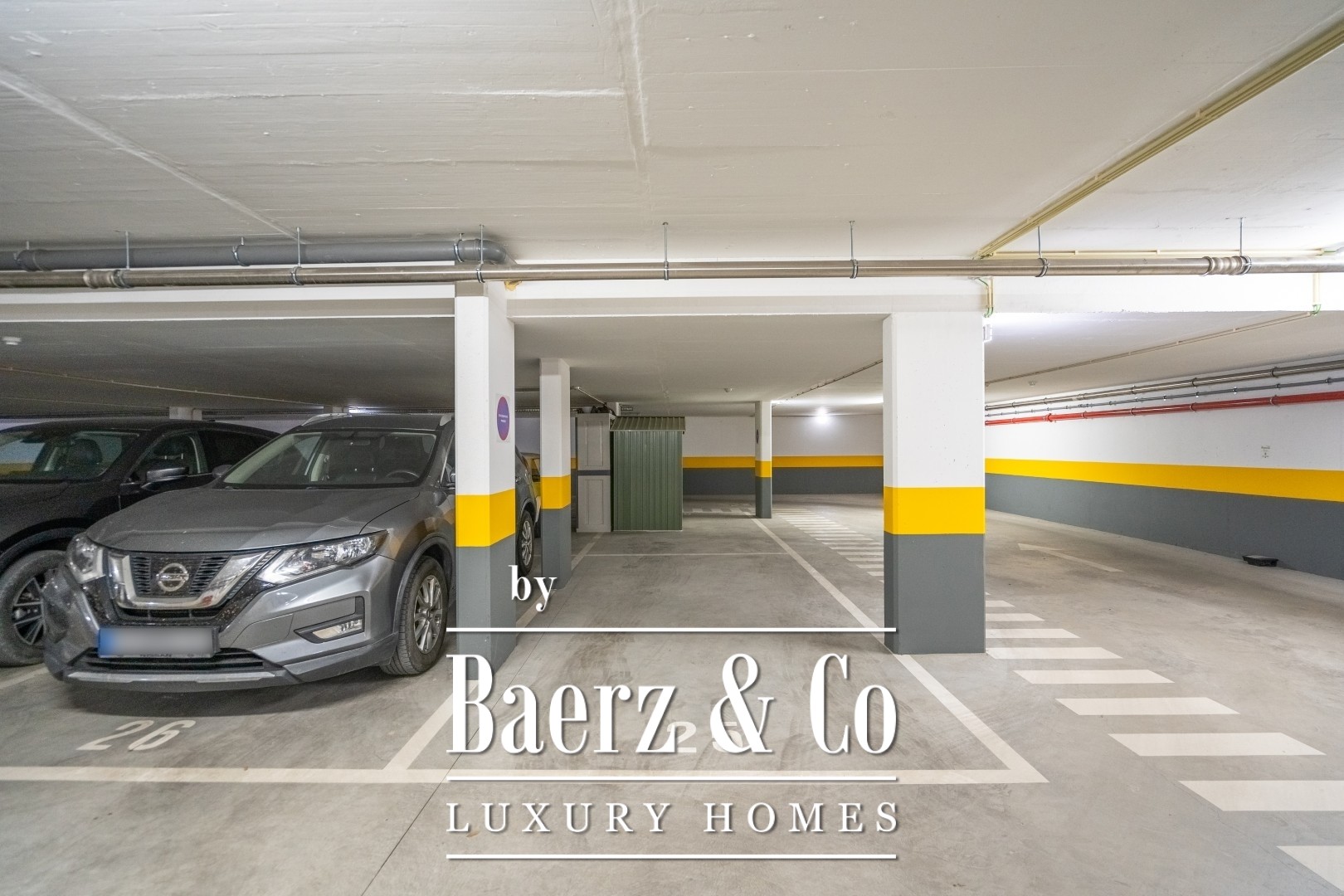 There are three comfortable bedrooms with built-in wardrobes, including one with an en-suite bathroom. The kitchen is fully equipped with quality and sustainable appliances, and the apartment is fitted with electric shutters and reversible air conditioning for year-round comfort. Two private parking spots in the underground garage are included.