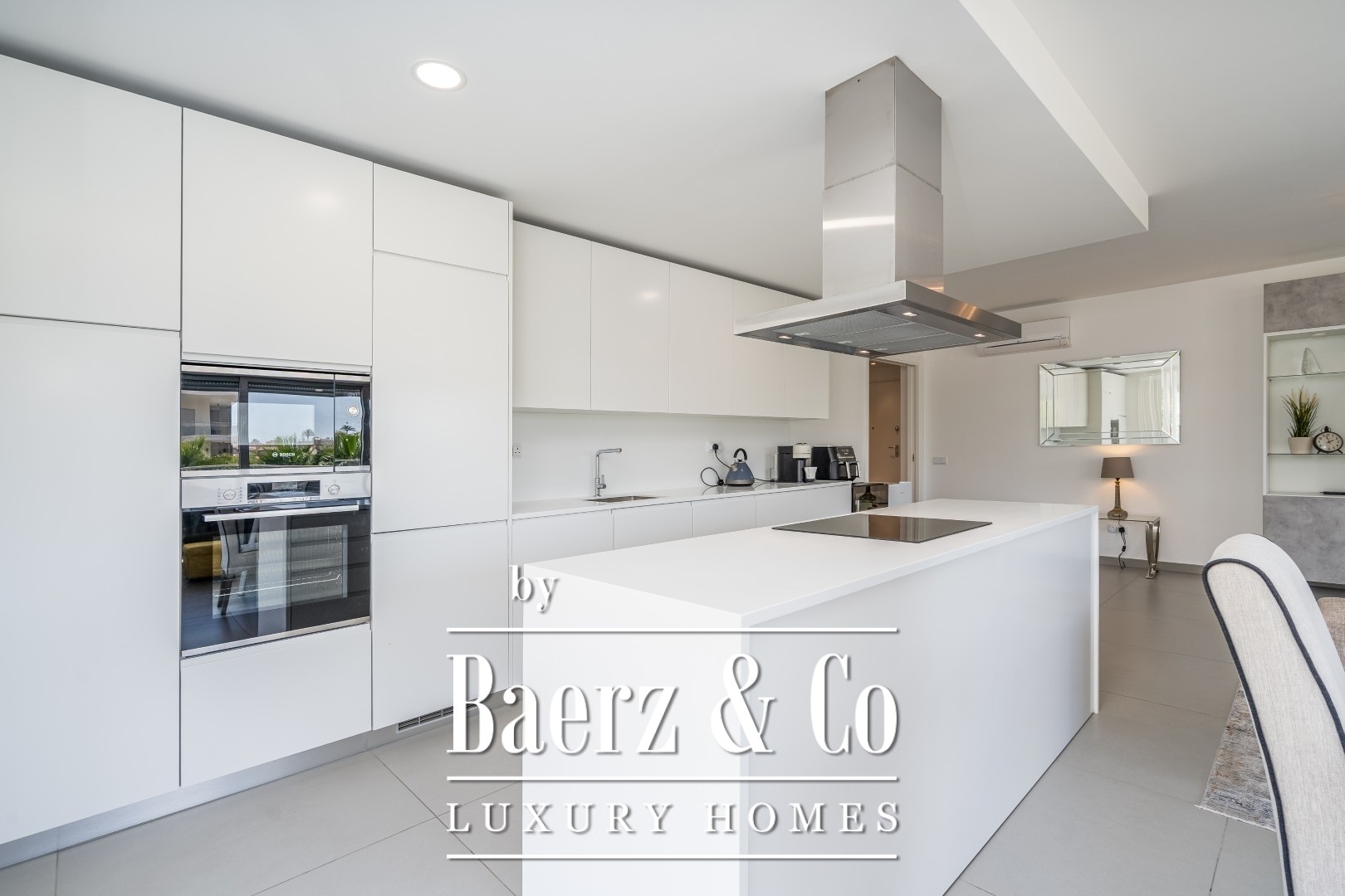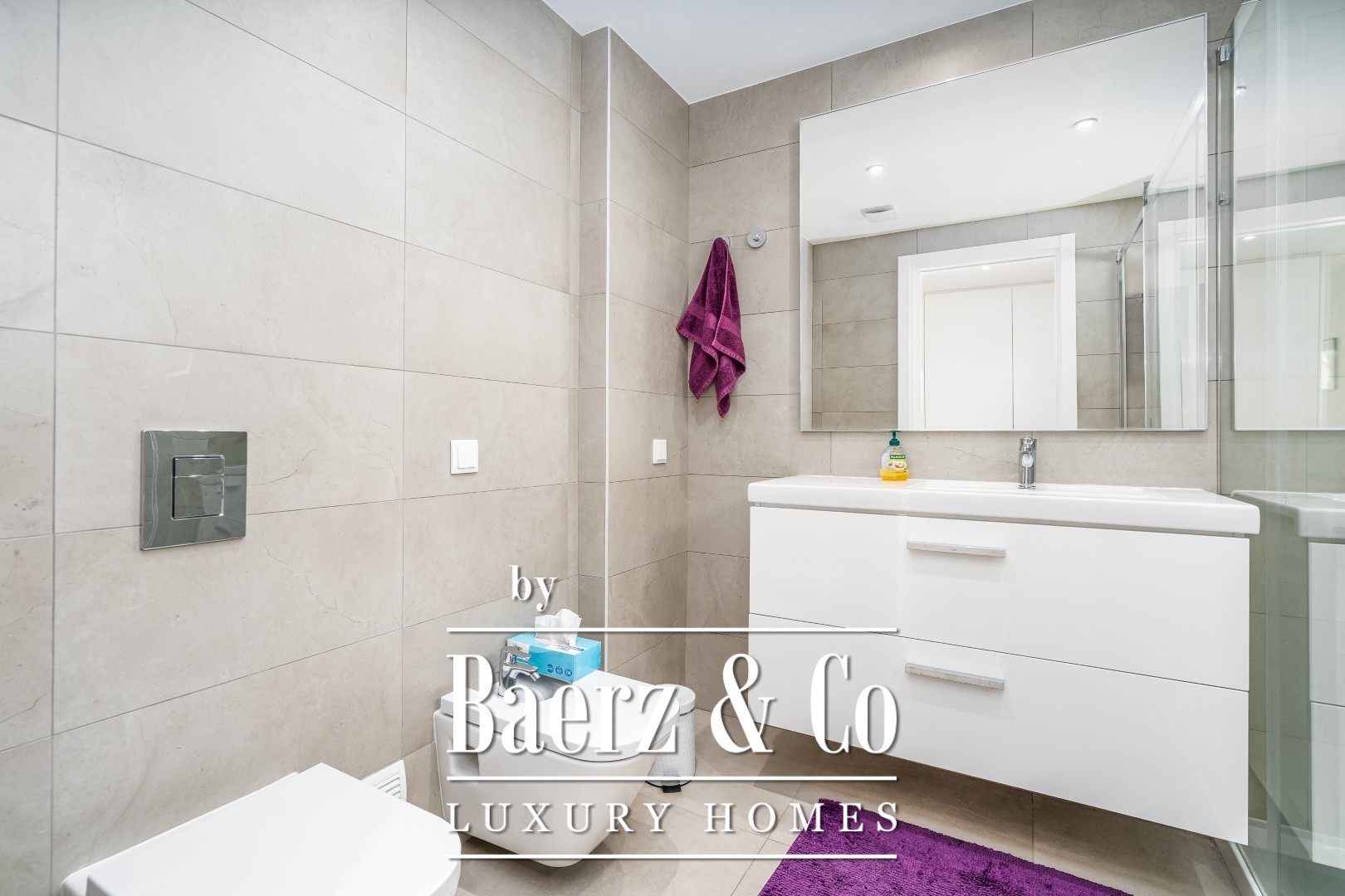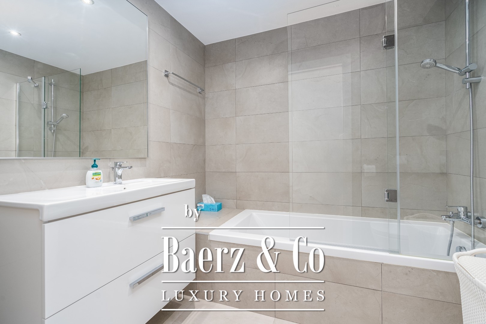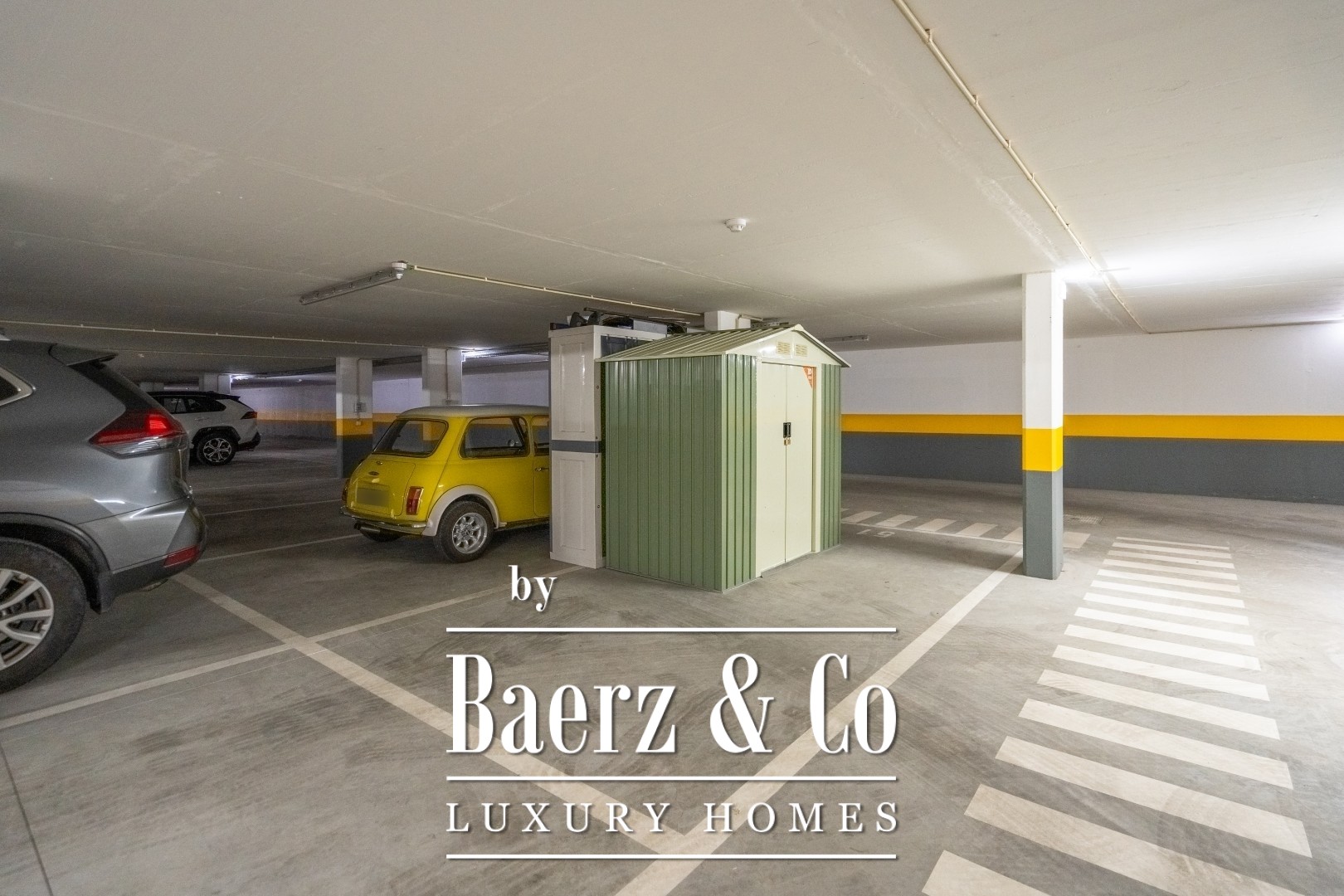 There are three comfortable bedrooms with built-in wardrobes, including one with an en-suite bathroom. The kitchen is fully equipped with quality and sustainable appliances, and the apartment is fitted with electric shutters and reversible air conditioning for year-round comfort. Two private parking spots in the underground garage are included.