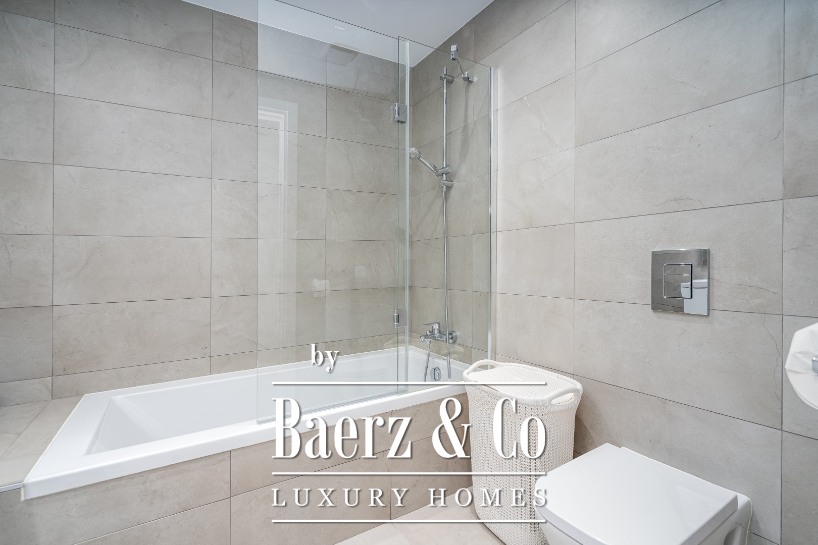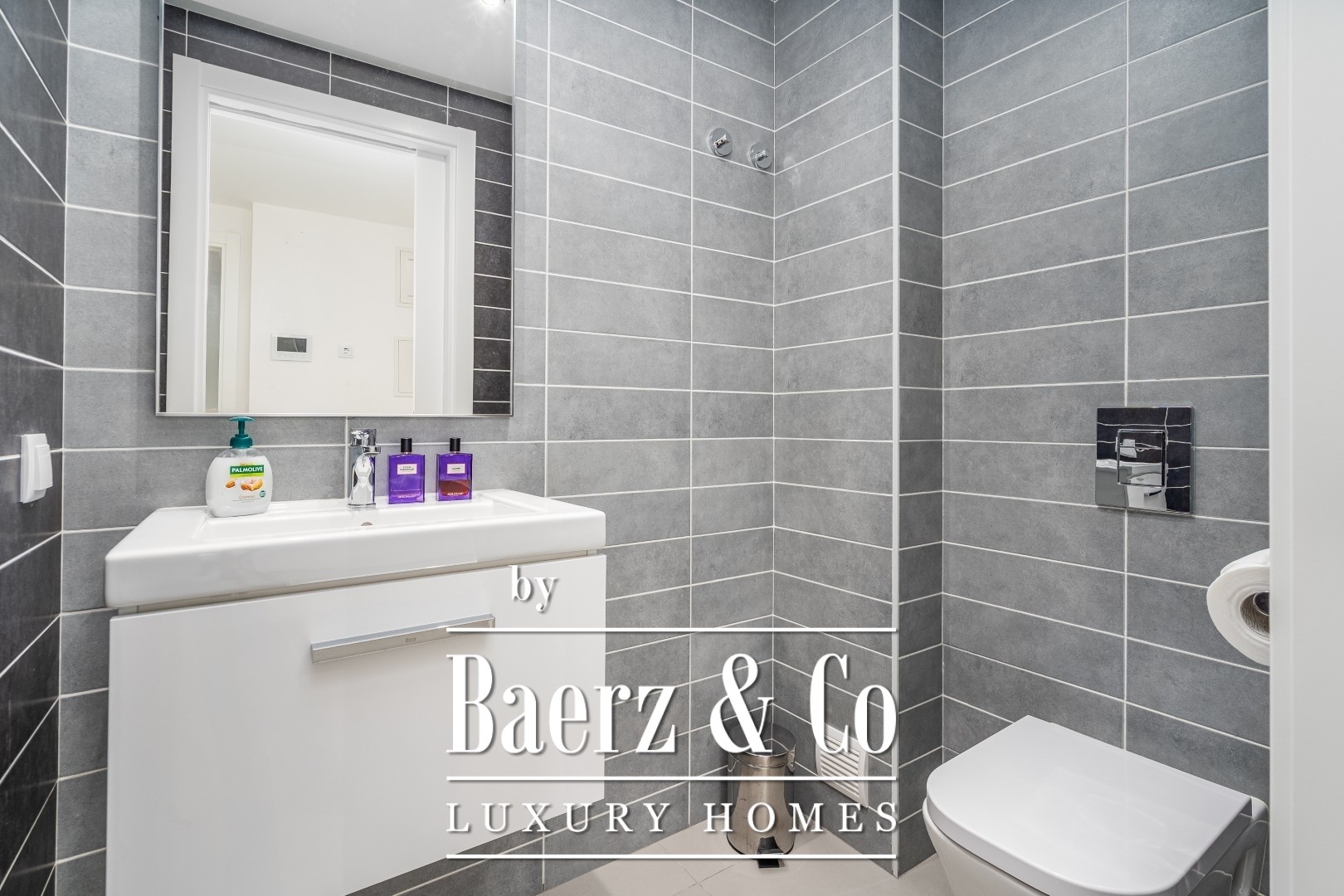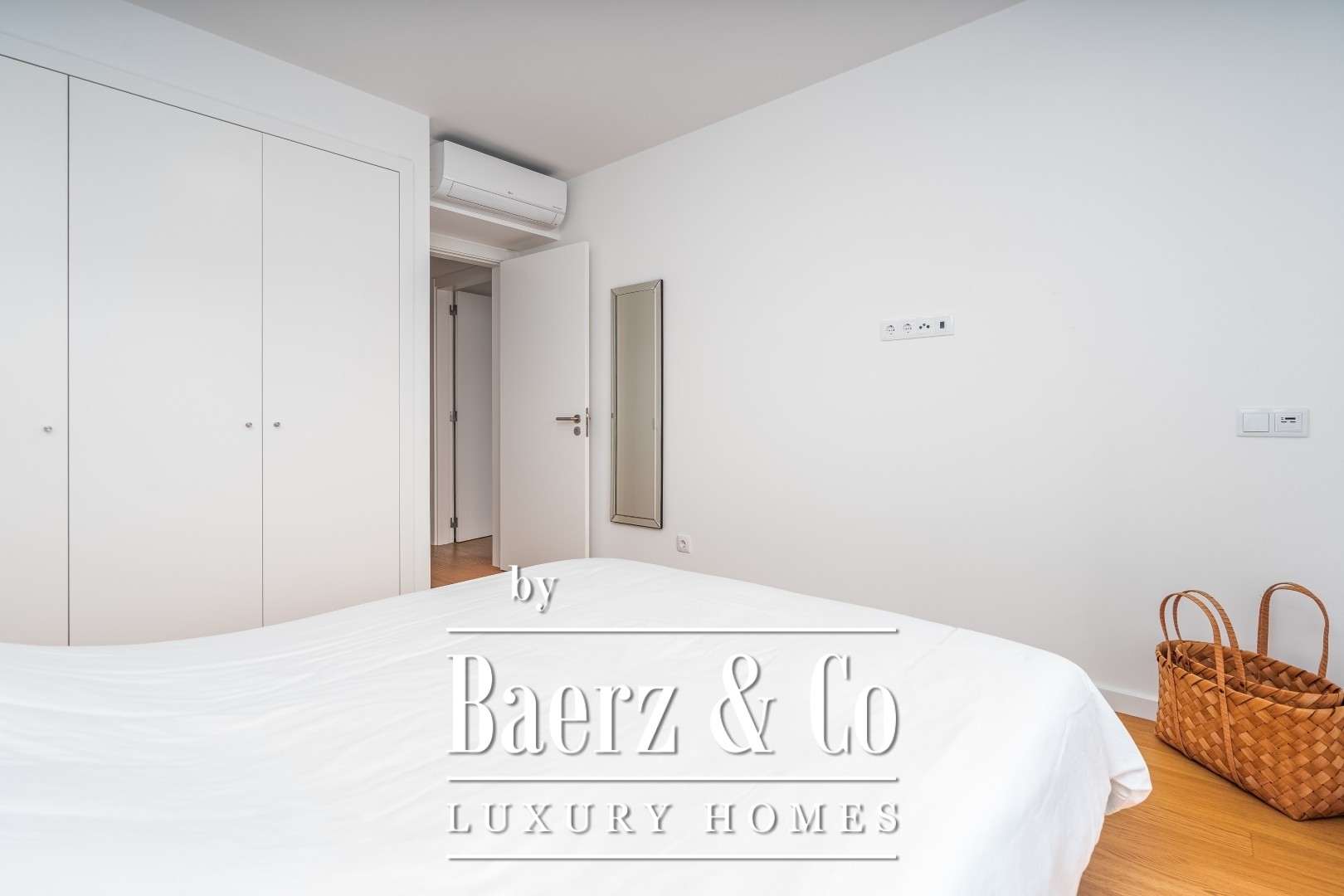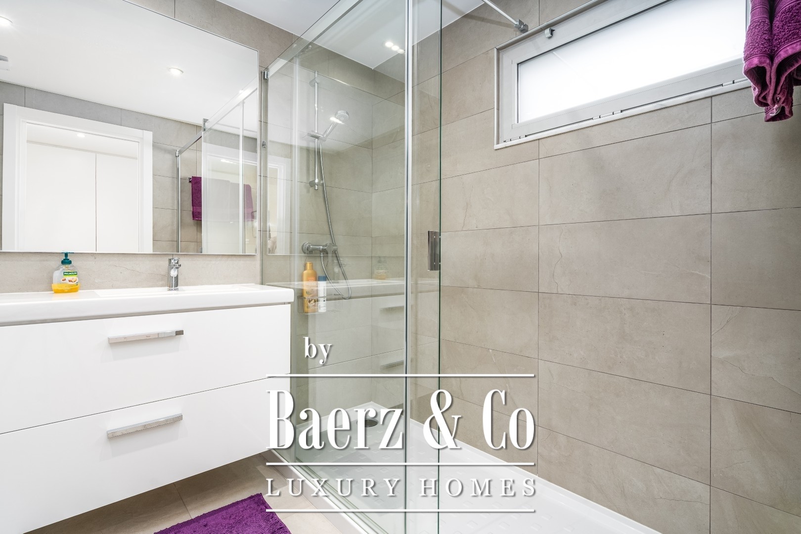 There are three comfortable bedrooms with built-in wardrobes, including one with an en-suite bathroom. The kitchen is fully equipped with quality and sustainable appliances, and the apartment is fitted with electric shutters and reversible air conditioning for year-round comfort. Two private parking spots in the underground garage are included.