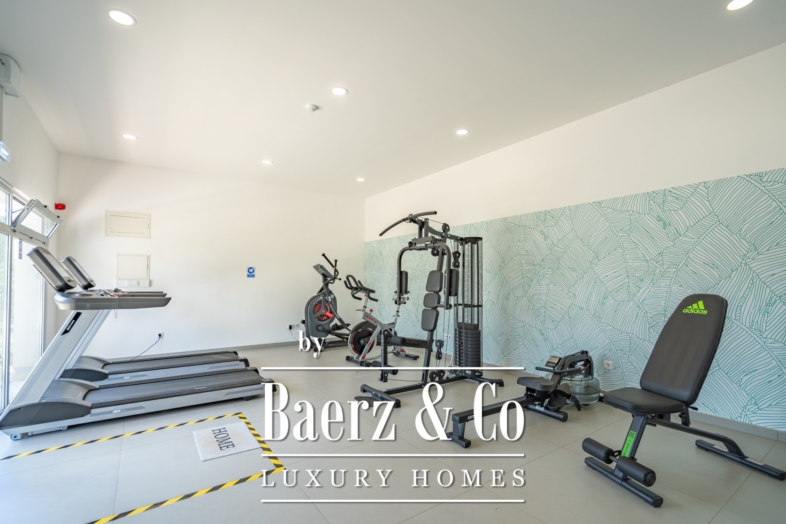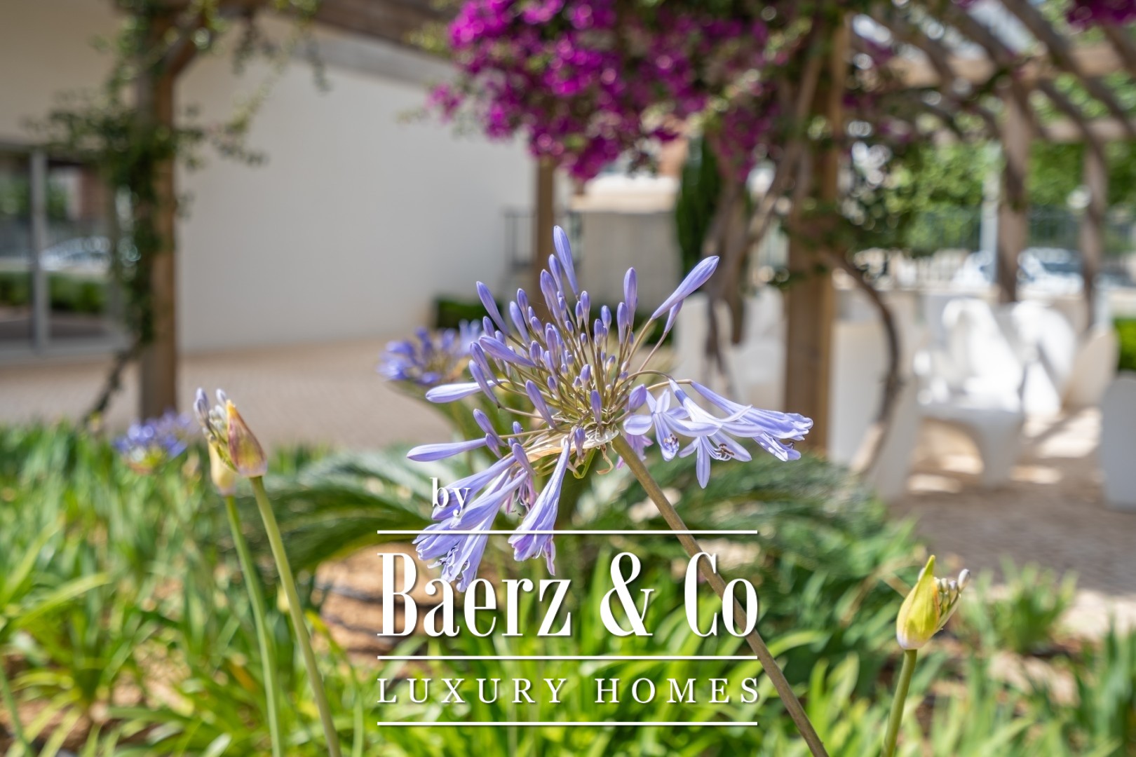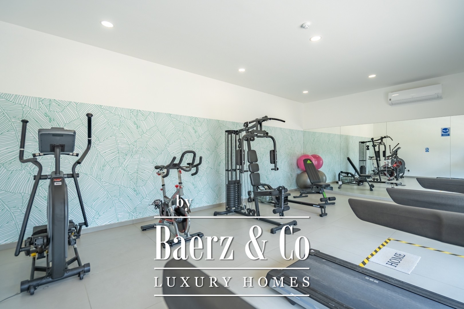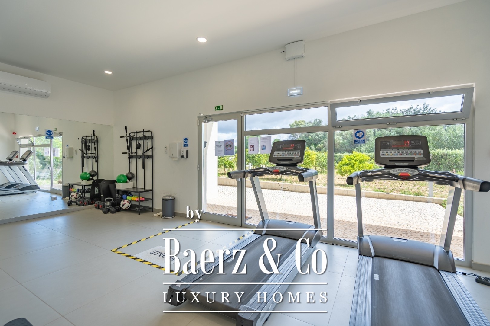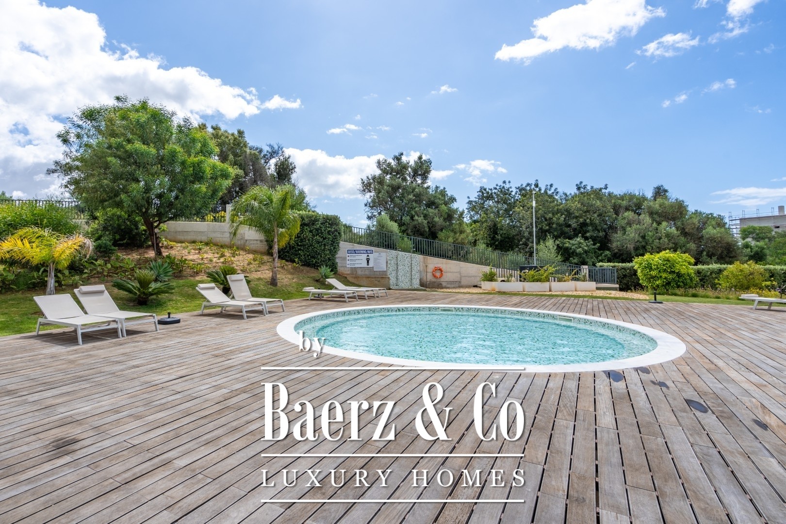 The condominium includes over 7,000m² of communal gardens filled with Mediterranean plants and fruit trees, creating a calm and green environment. There are two heated swimming pools – one for adults and one for children – as well as a gym and a shared leisure area for residents.