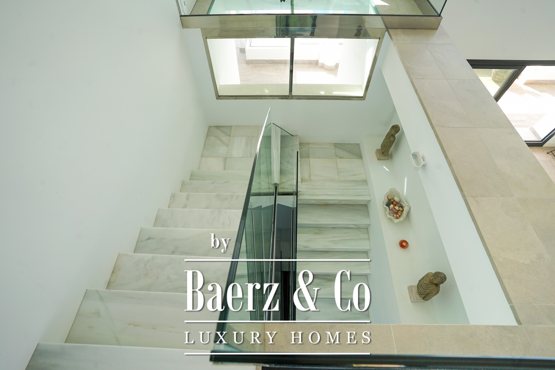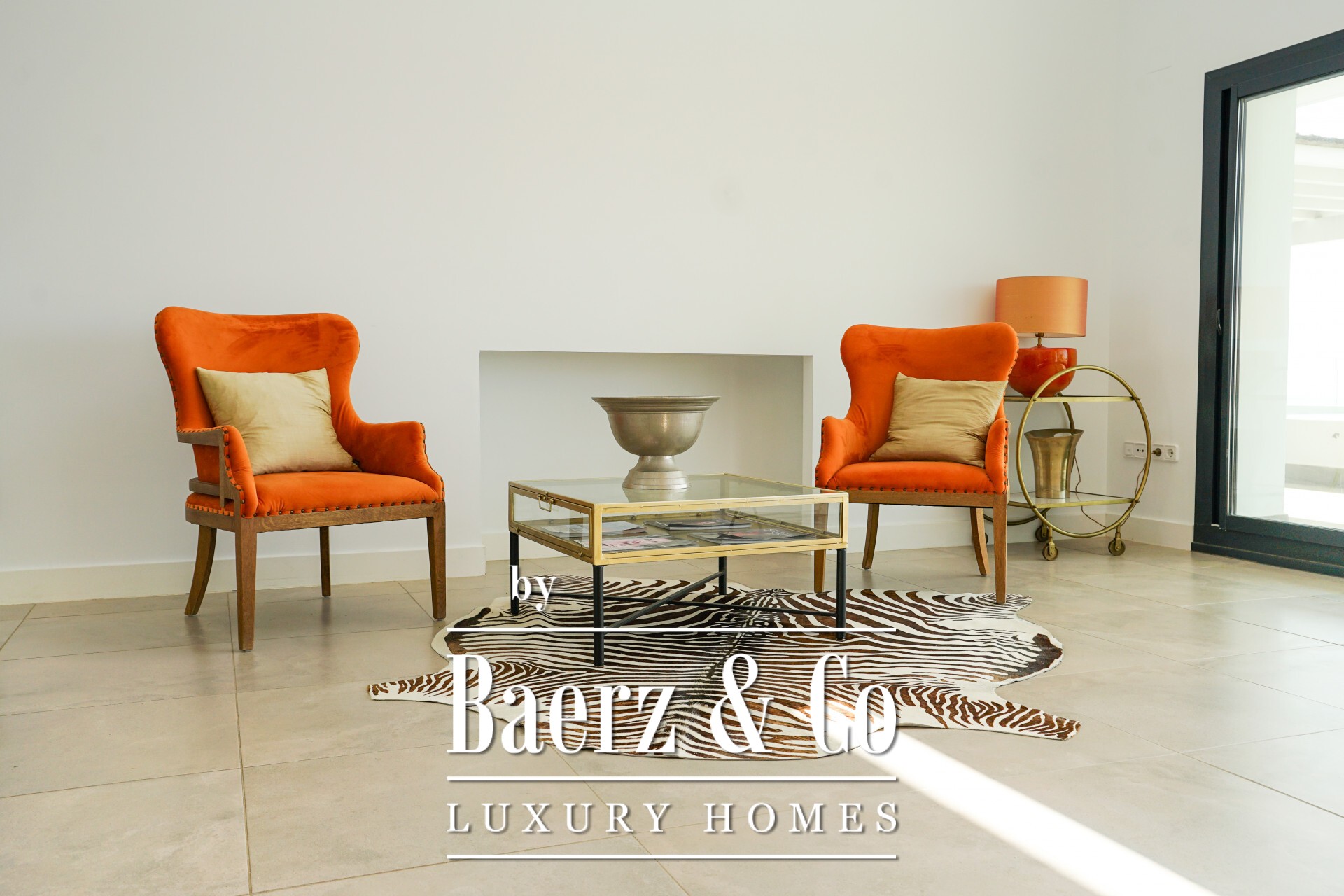 The main living spaces form an open flow, where floor-to-ceiling glass connects a spacious lounge and dining area to covered outdoor zones. An elegant, fully fitted kitchen with high-end appliances transitions to an outdoor barbecue area, while a separate TV room, private gym, steam room, and private office enhance daily life. Four bedrooms and five bathrooms, three of them en-suites, offer flexibility and privacy, including an office ready to become a fifth suite.