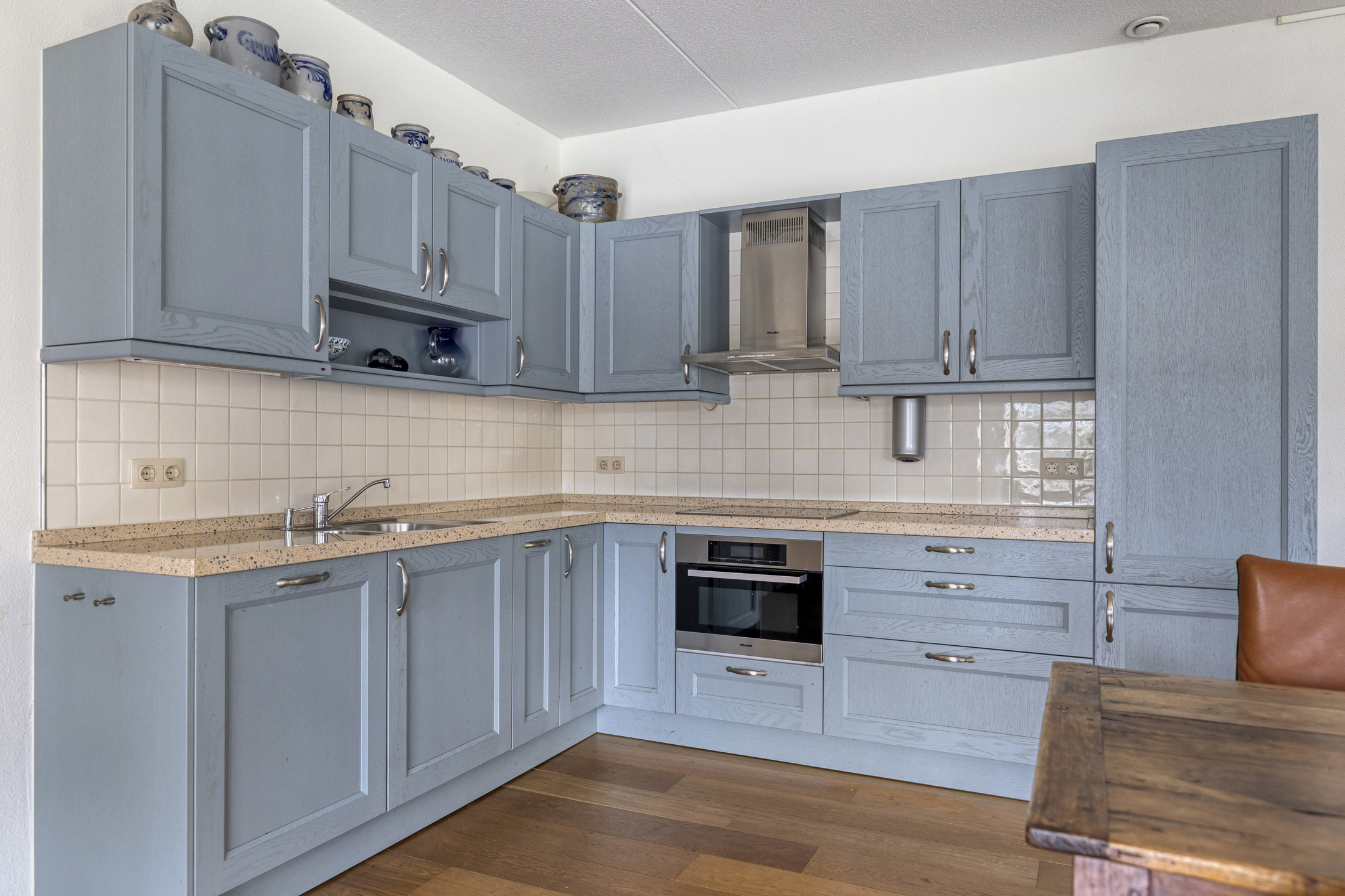 From the hallway you enter the generous living room with open-plan kitchen and access to the practical utility room. The living room is particularly spacious and offers ample room for multiple seating areas as well as a large dining table. The open kitchen is neatly finished and equipped with high-quality Miele built-in appliances, including a four-burner induction hob, refrigerator with freezer compartment, combination microwave oven and dishwasher.