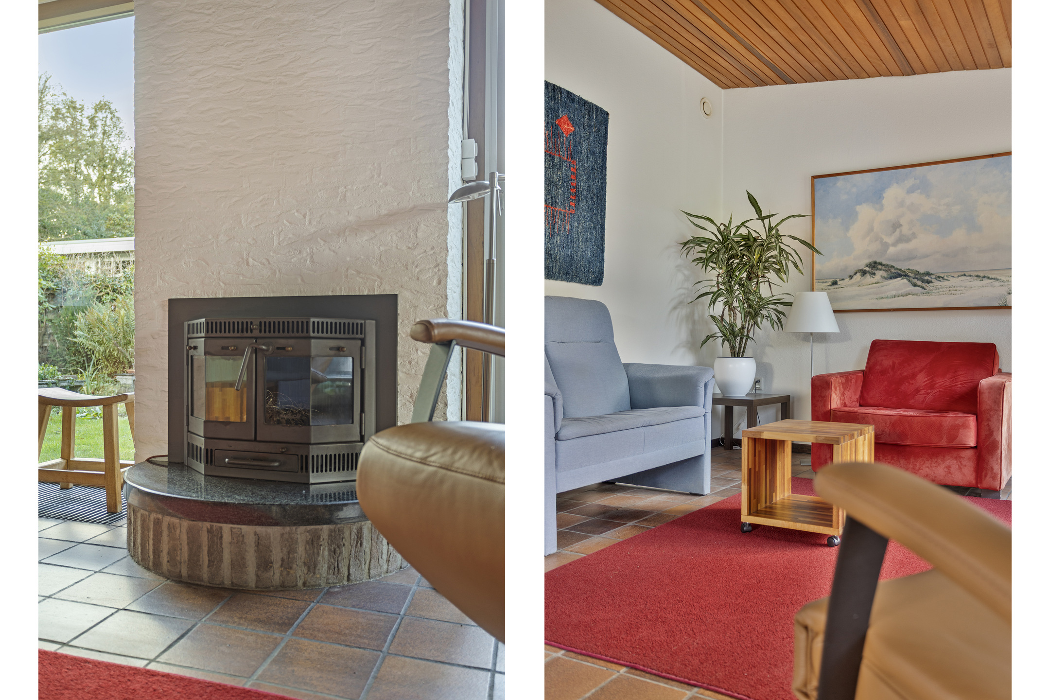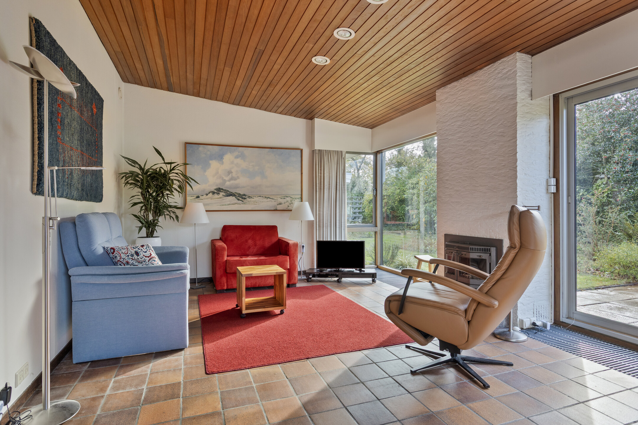 De royale woonkamer met grote raampartijen, schuifpui en open haard biedt een sfeervolle leefruimte met prachtig zicht op de tuin. Aansluitend de eetkamer en de halfopen keuken, uitgerust met onder andere een oven, vaatwasser, elektrische kookplaat en koelkast. De houten plafondafwerking zorgt voor een warme, karakteristieke uitstraling.
