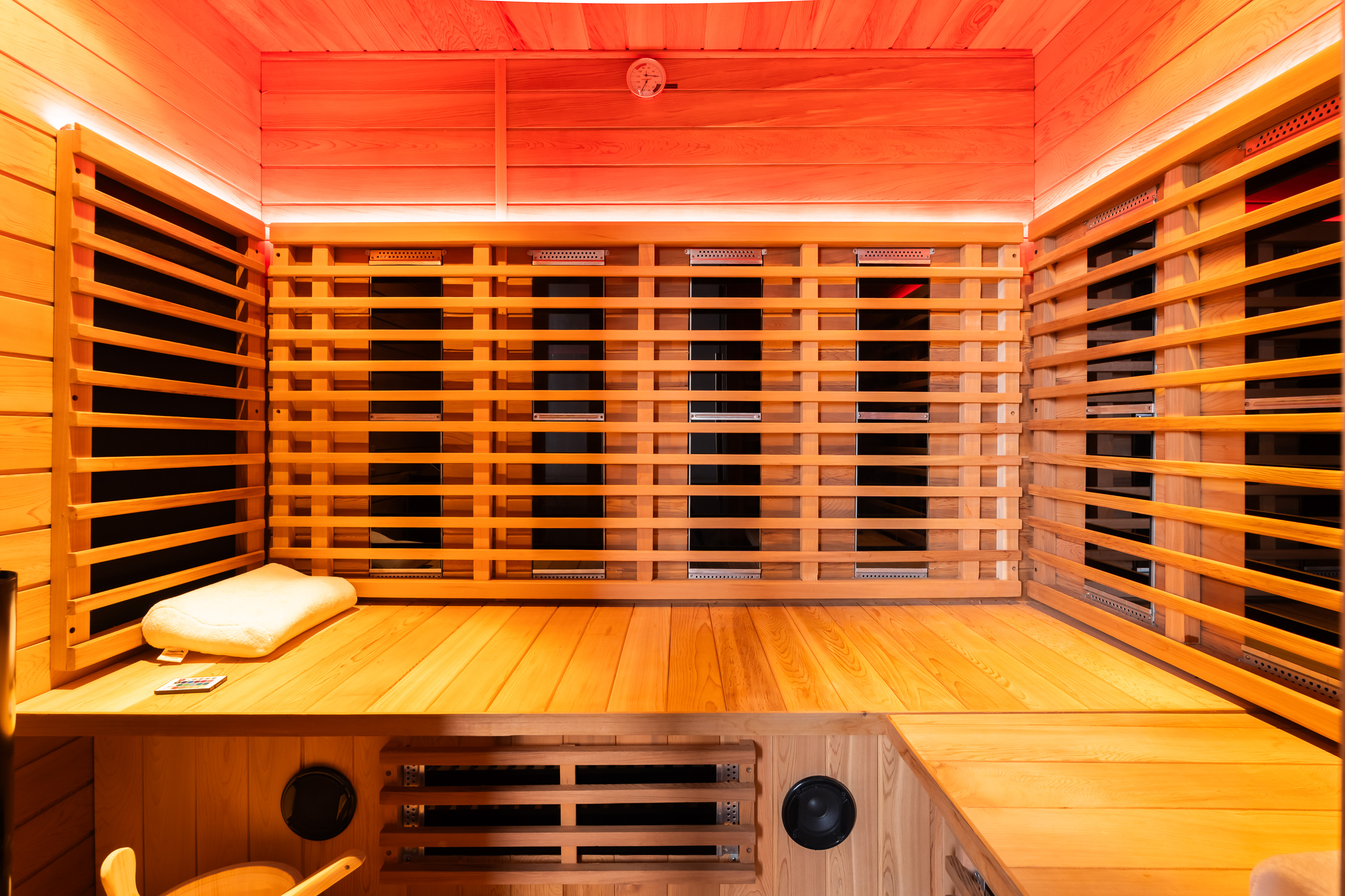 Bathroom with bathtub, rain shower and Finnish sauna with infrared