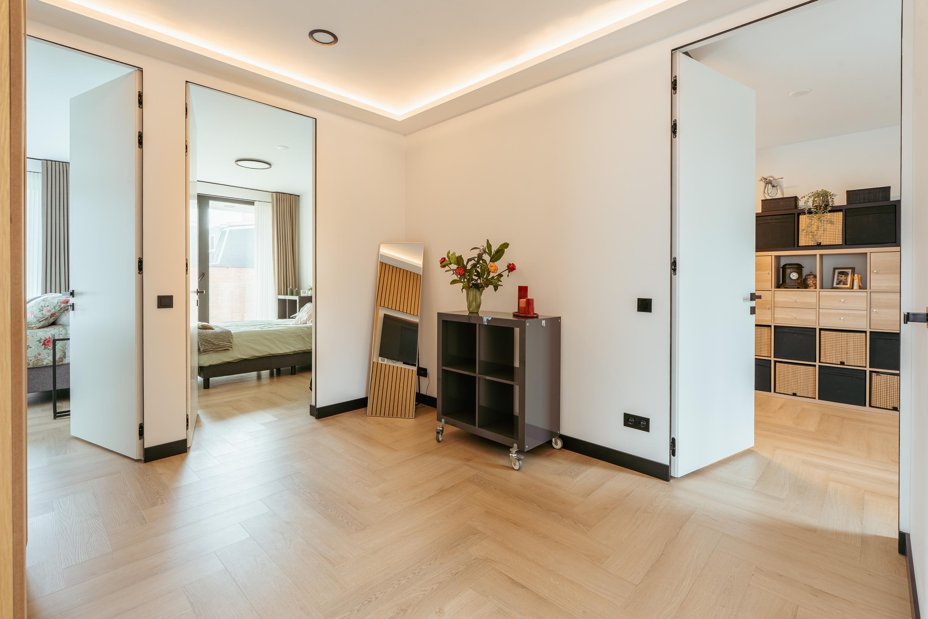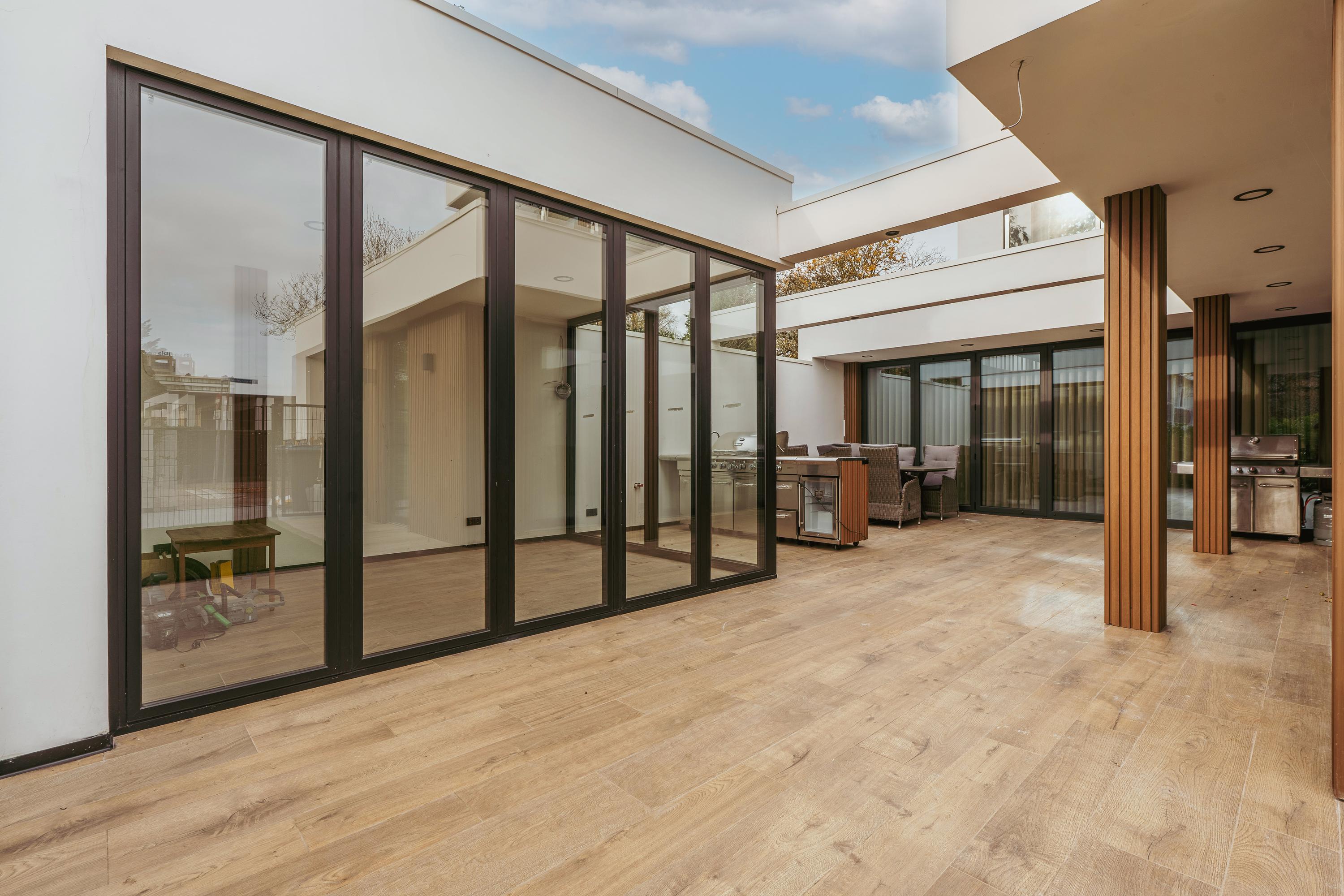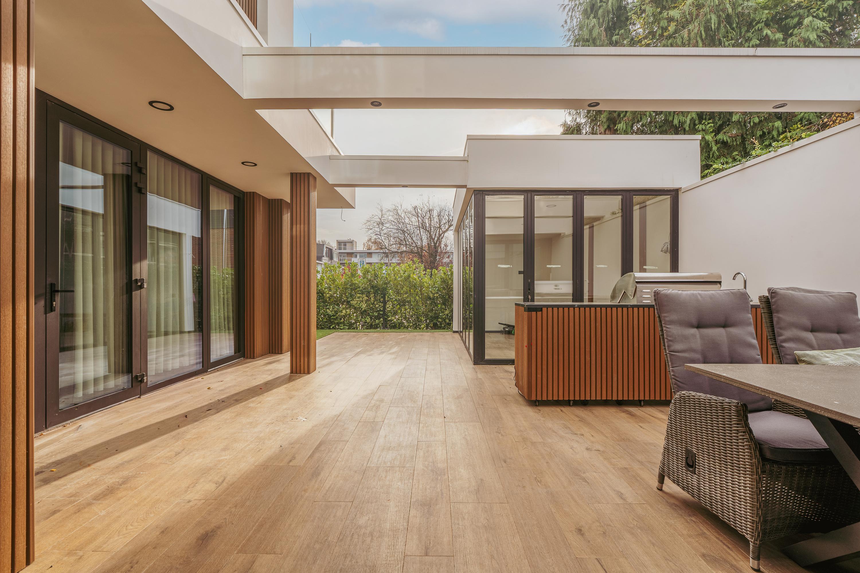 The entrance to the property is reached via the well-maintained front garden. The spacious hallway provides a welcoming first impression and leads into the generous living room, which is characterised by an abundance of natural light. Large windows and glass doors connect the living area directly to the garden terrace, creating a seamless flow between indoor and outdoor living. Adjacent to the living room is the luxurious open-plan kitchen, featuring a spacious cooking island that also serves as a cosy bar seating area. The kitchen is fully equipped and includes an oven and combi-oven, an induction hob with integrated extractor, a climate-controlled wine cabinet, Quooker, dishwasher, fridge and freezer. There is ample space for a large dining table. Behind the kitchen, you will find a spacious utility room and storage area, offering plenty of room for household appliances and pantry items.