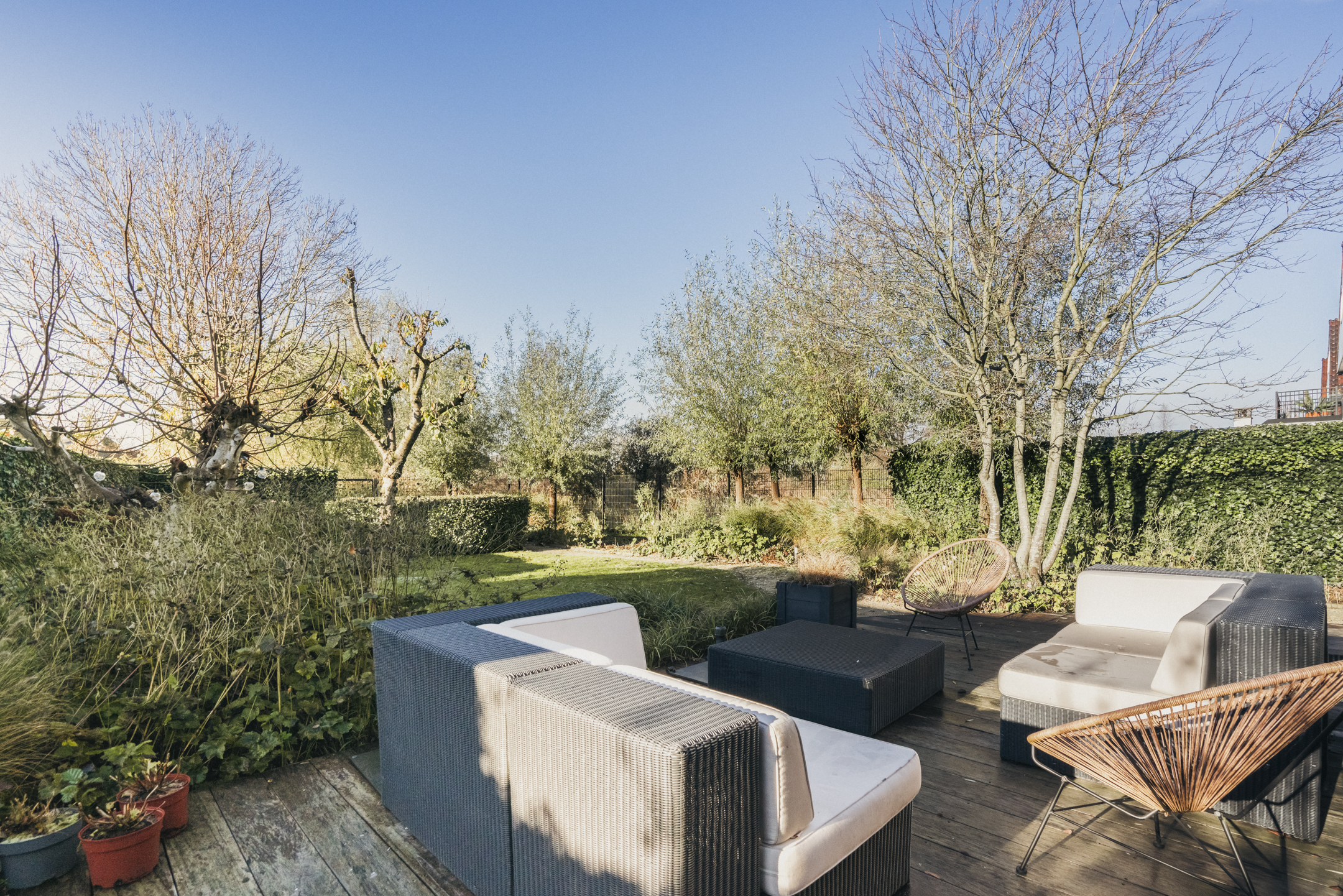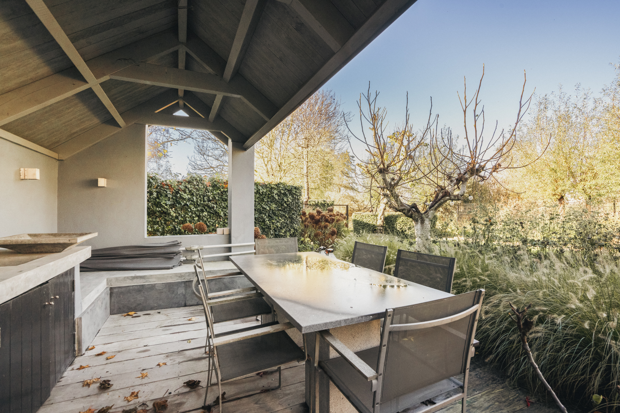 The west-facing backyard forms an important extension of the home. The garden features an outdoor kitchen that can easily be arranged as an outdoor lounge – a wonderful place for long summer evenings, dinners with friends and relaxing moments in complete privacy.