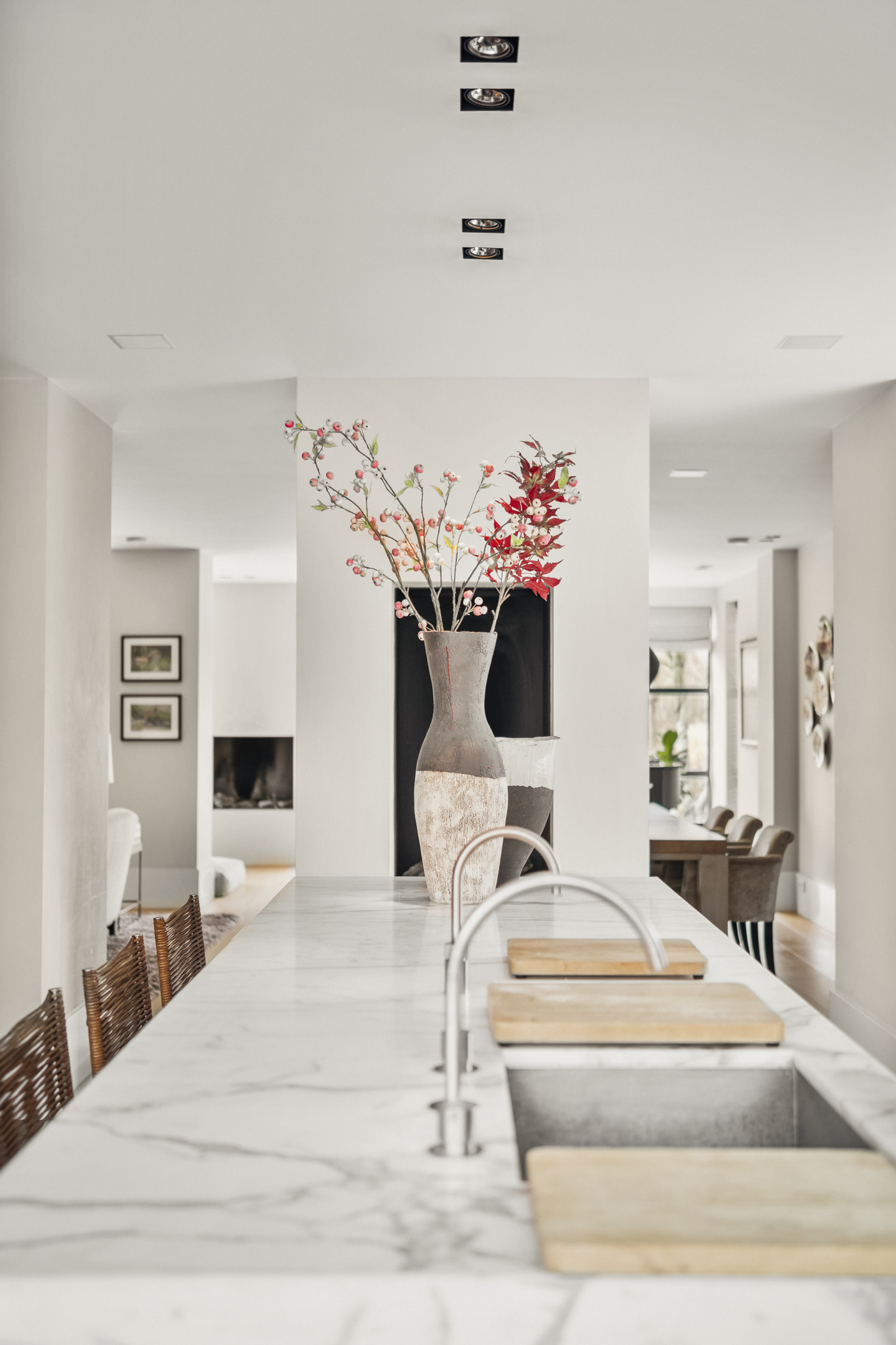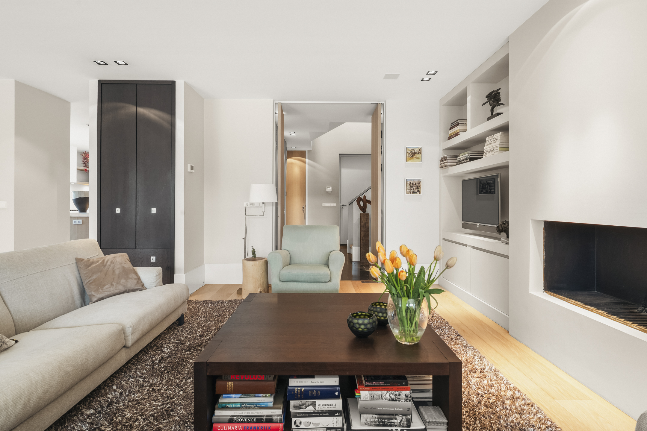 The living room is so generous that a second sitting or lounge area has also been created, featuring a gas fireplace. The lighting plan with Maretti fixtures and the integrated Sonos sound system (living room, kitchen and study) further enhance the luxurious living experience.