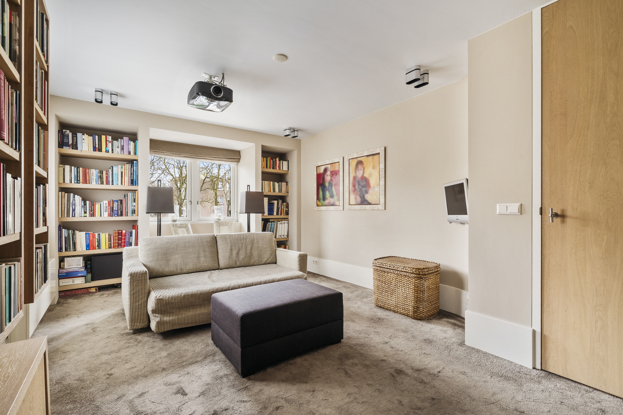 At the front of the house is a generous bedroom, currently arranged as a film/cinema room, complete with projector and screen. This room also features custom-made cabinetry, fully in keeping with the home’s design.