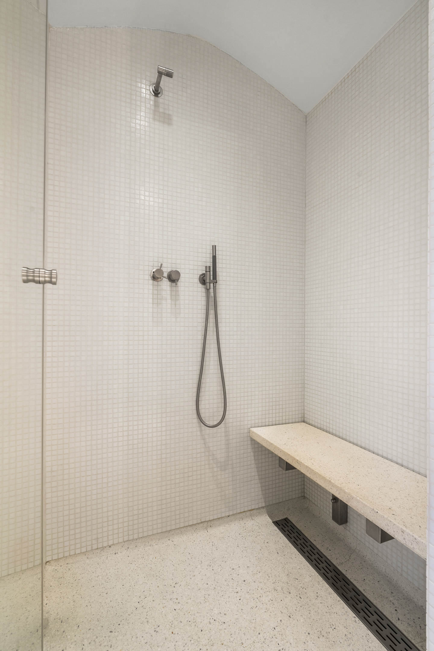 The guest bathroom on this floor is luxuriously finished and includes a vanity unit, wall-mounted toilet and a walk-in shower with a Cleopatra steam cabin, offering additional comfort and a wellness experience.