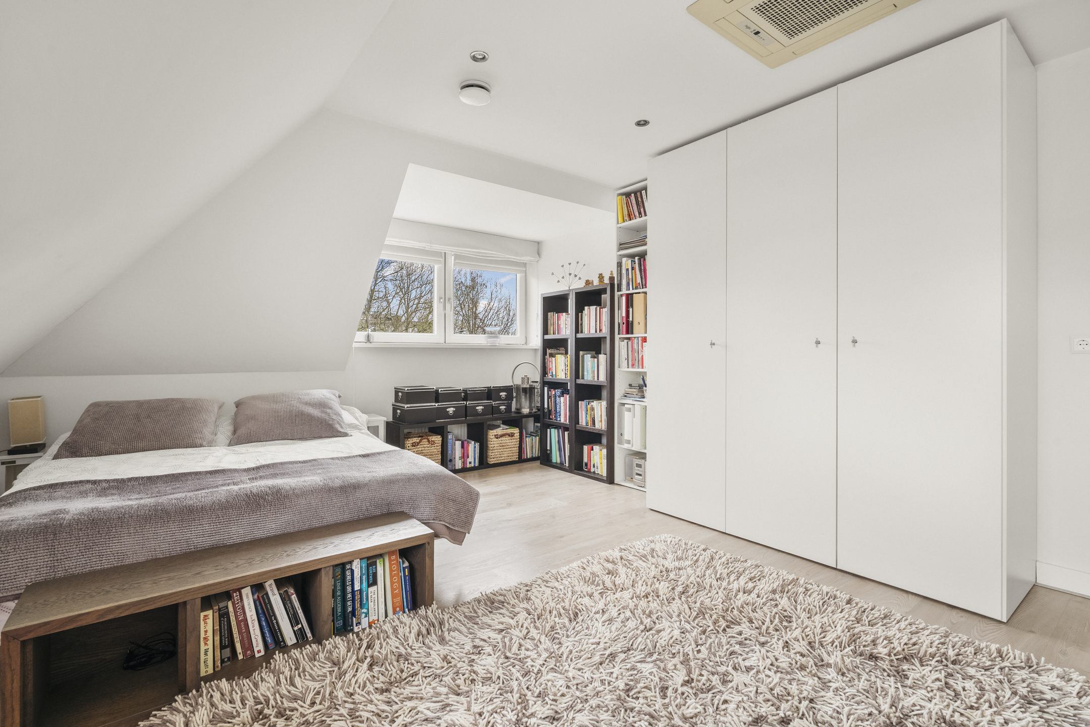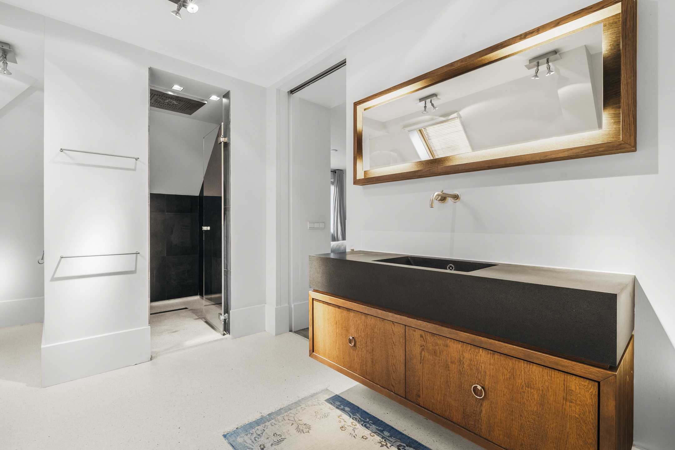 At the rear is the master bedroom, fitted with custom-made wardrobes and a luxurious en-suite bathroom, which can be closed off by means of a sliding door. The bathroom includes a wall-mounted toilet, freestanding bathtub, vanity unit and a very generous walk-in shower. Adjacent is a spacious walk-in closet, also fully custom-designed.
