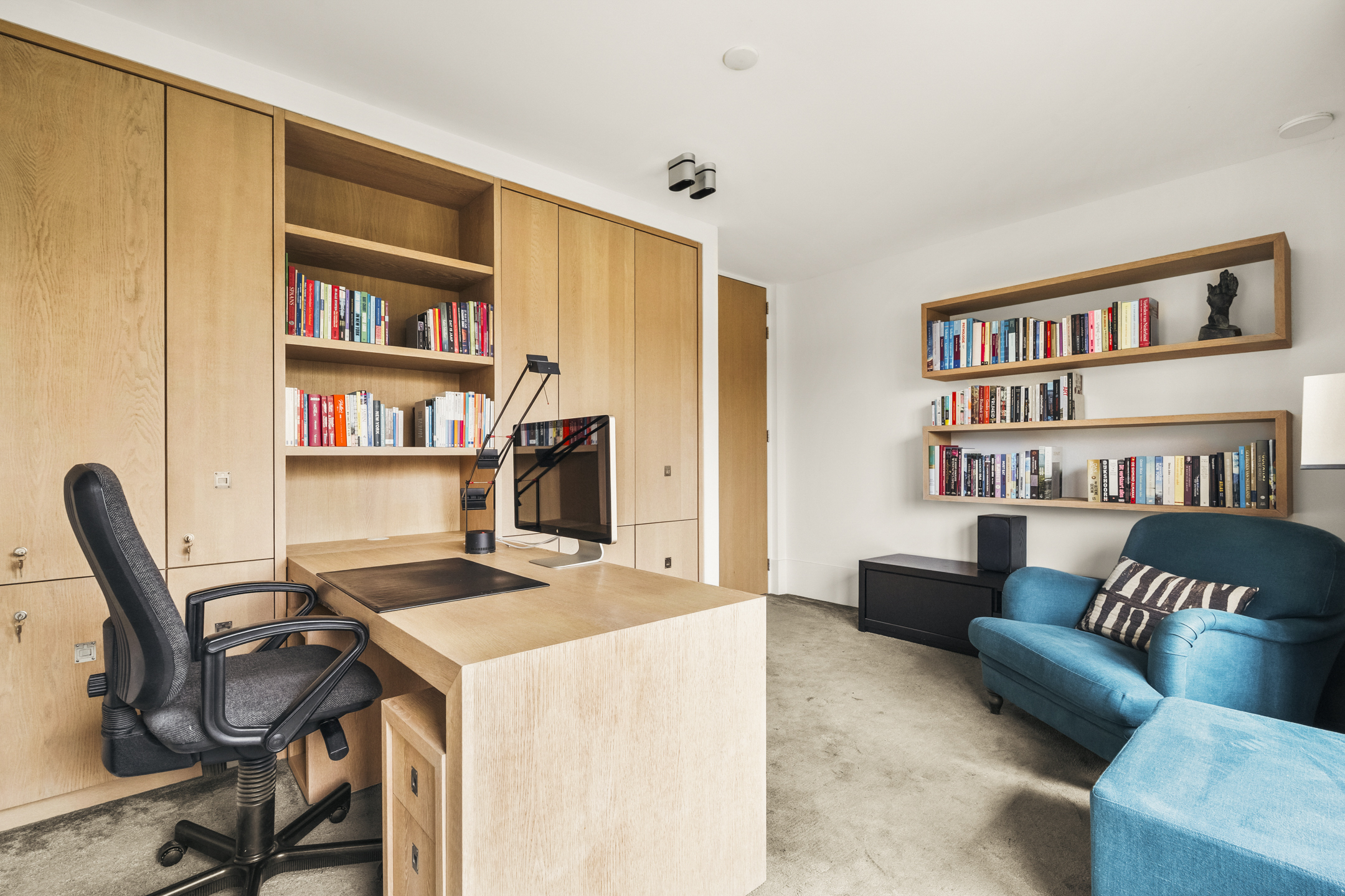 Also on the ground floor is an additional room, perfectly suited as a study, fitted with custom-built cabinetry and sliding doors opening onto the sun terrace.