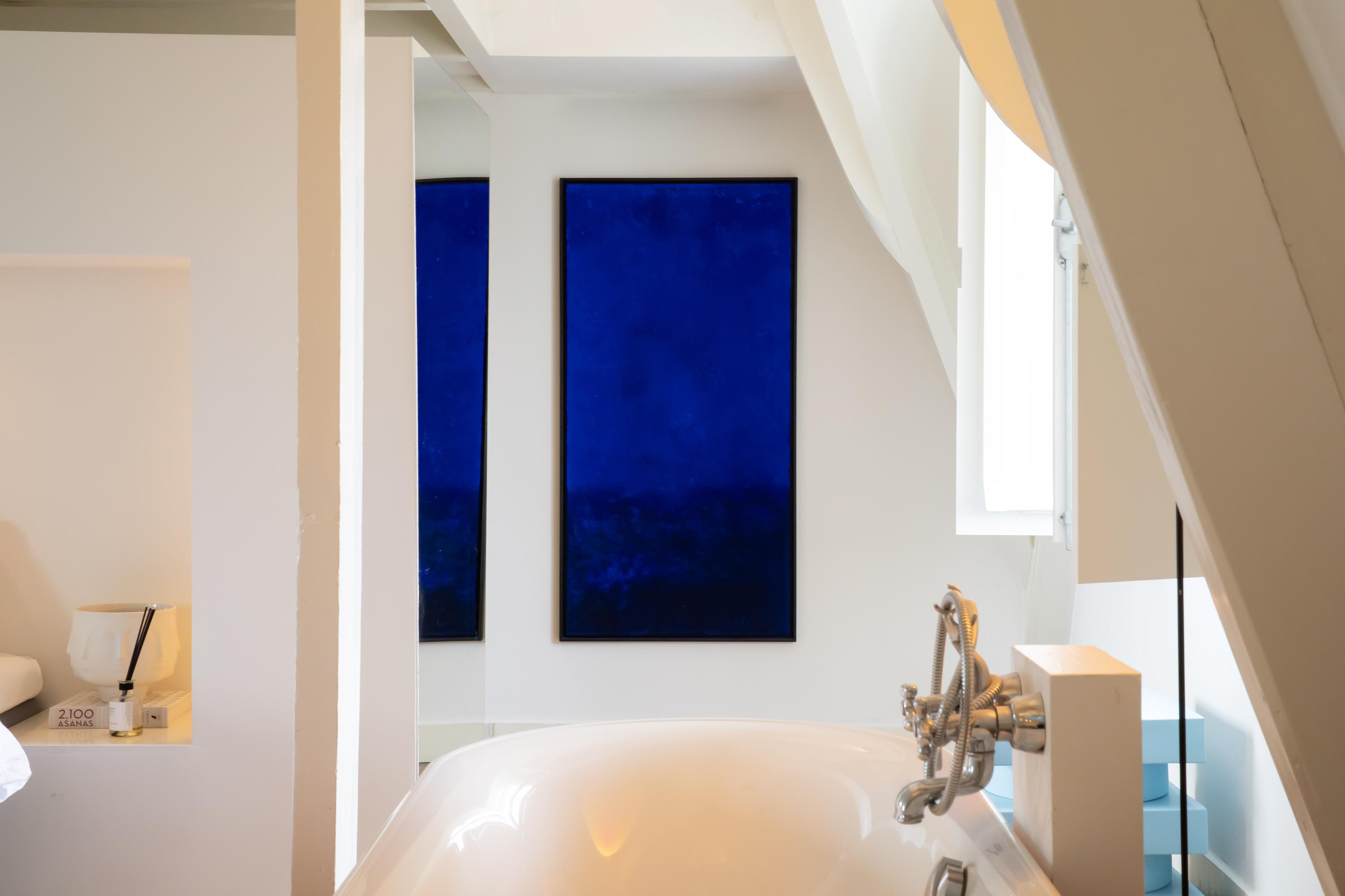 On the top floor you will find the spacious master bedroom, complete with a stylish built-in bed unit with integrated lighting, a freestanding bathtub, air-conditioning, and a characteristic beam construction. The en-suite bathroom features industrial details, a double sink with cabinet, walk-in shower, and toilet.
