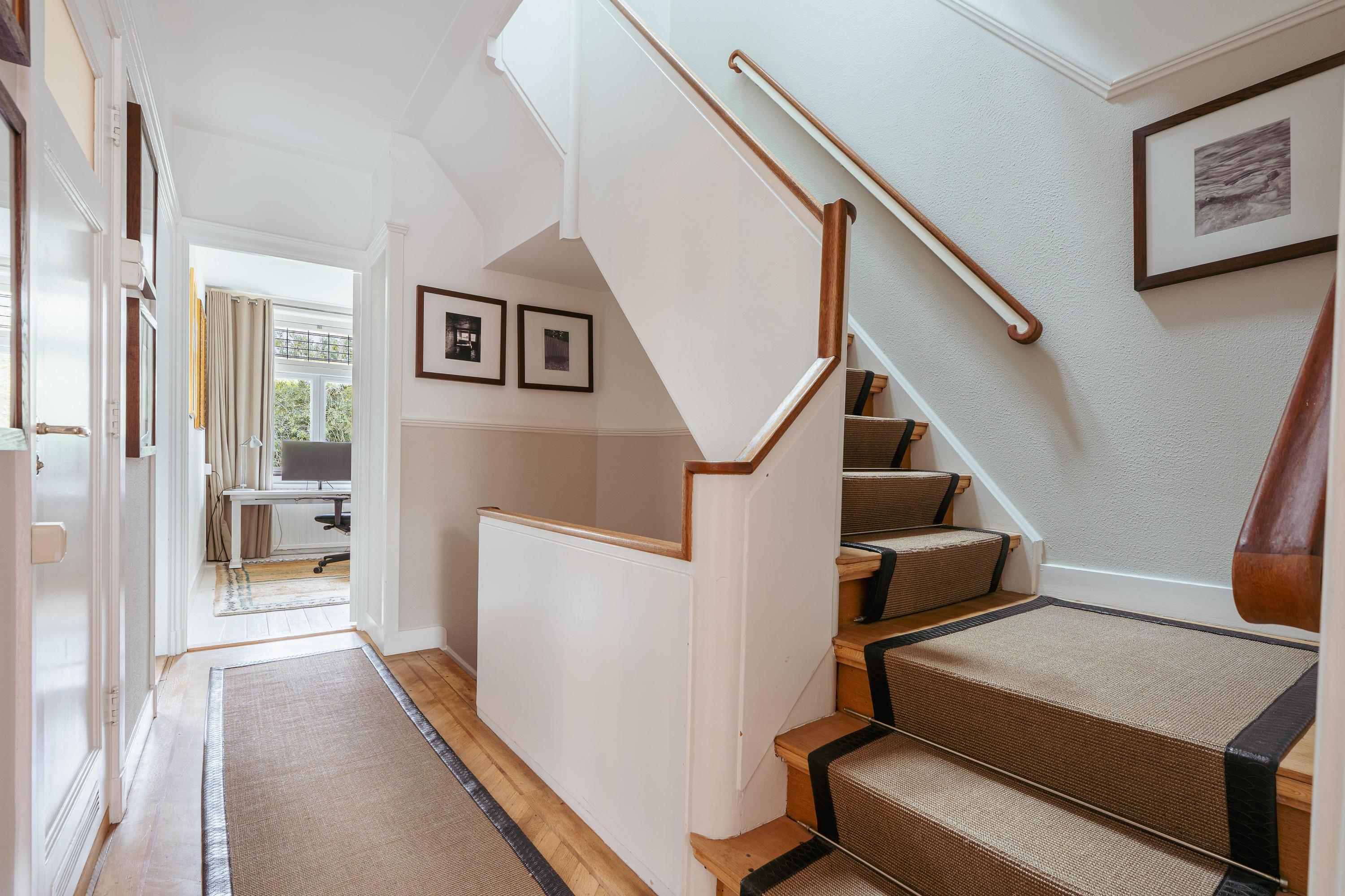 The top floor comprises a generous bedroom with an impressive ceiling height, giving the space a particularly bright and airy feel. This floor is also well-suited for use as a study, guest room or studio.