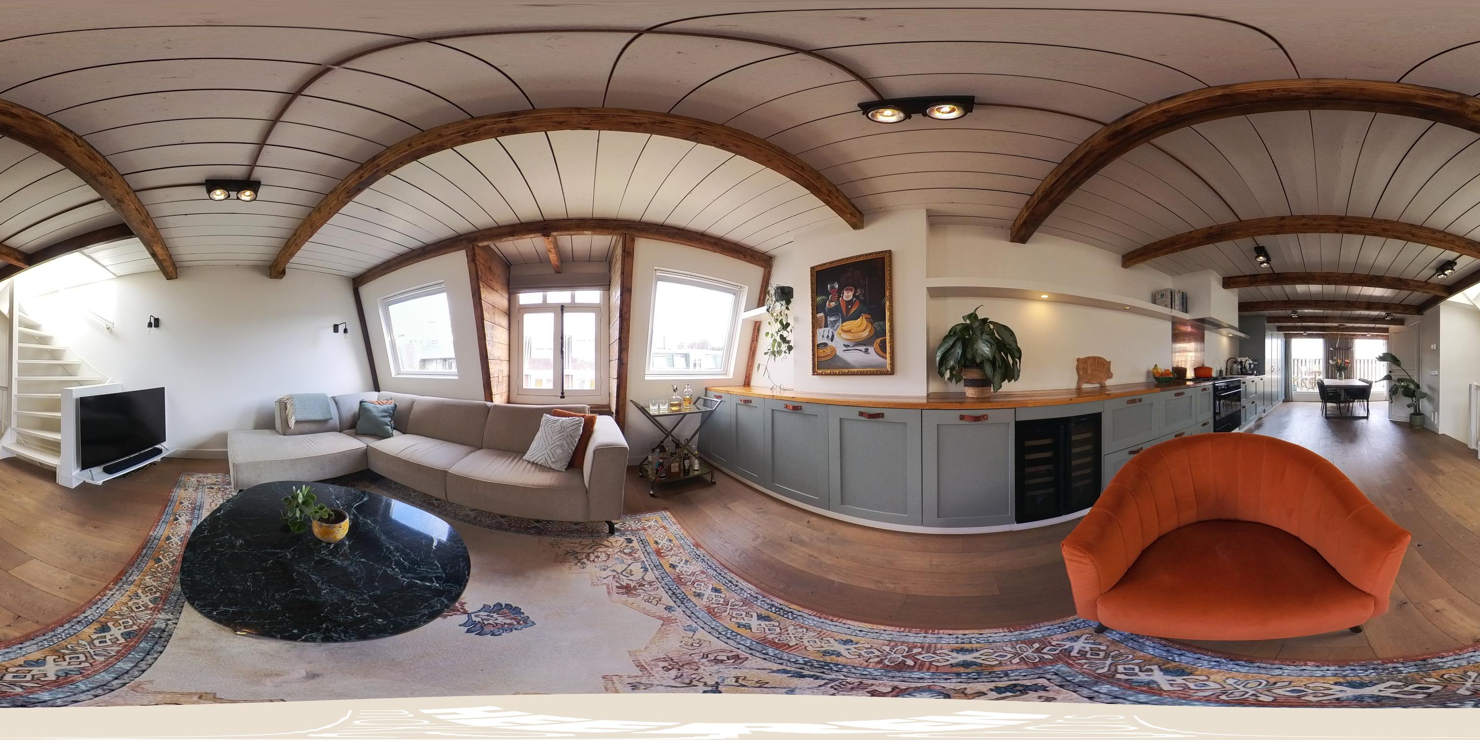 The living floor, situated on the fourth level, features a spacious and bright living room with an open-plan kitchen. The space is characterized by charming wooden beams, adding warmth and character. Large windows at both the front and rear, combined with natural light from the rooftop terrace, ensure a pleasant flow of daylight throughout the day. The open kitchen spans the full width of the wall and offers ample storage space. It is equipped with a six-burner gas stove, extractor hood, oven, dishwasher, sink with Quooker, refrigerator, freezer, and a wine climate cabinet. This floor also includes a separate toilet with double doors. From the living room, there is direct access to the west-facing balcony at the rear. A fixed staircase leads to the stunning rooftop terrace. This generous outdoor space offers complete privacy and enjoys 360-degree sun exposure, making it the perfect place to relax throughout the day. With ample room for multiple seating and lounge areas, the terrace is a true highlight of the property.