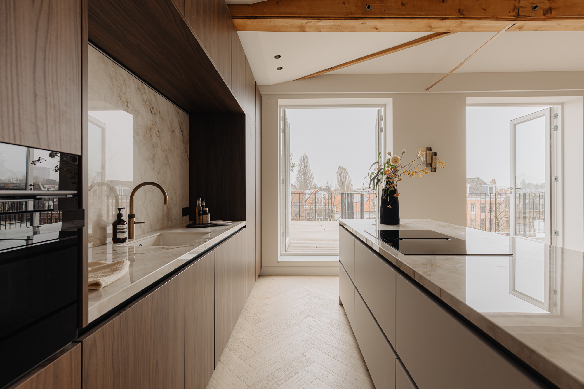 A luxury penthouse of approx. 148 m², with two (and the option for three) bedrooms, two bathrooms, a large south-facing roof terrace, an open-plan kitchen with a cooking island and internal storage space. The apartment features carefully selected, high-end materials that create a sense of warmth and comfort. Luxury herringbone floors, high ceilings, subtle tones in the kitchen and bathrooms and a well-thought-out lighting plan create a harmonious and inviting ambiance. The kitchen, with its clean lines and ample storage space, is a perfect combination of style and practical functionality. The building itself is a freehold property.