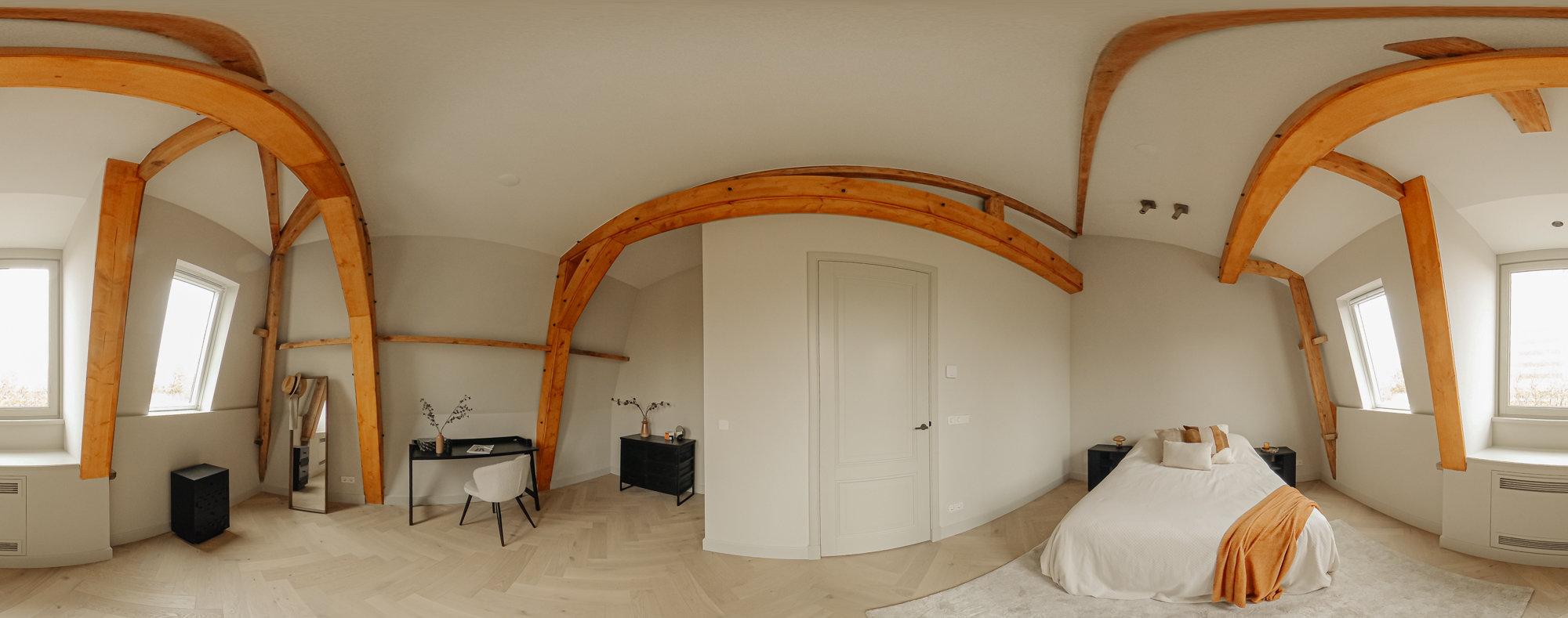 The front door to the apartment opens into a landing that gives access to storage space, a separate guest toilet and all the apartment’s other rooms. There is a large, bright living room (approx. 53 m2) and an open-plan kitchen of Italian design with a cooking island at the front of this floor. The luxury kitchen is equipped with a comprehensive range of built-in appliances and balances style and functionality perfectly. The sophisticated combination of white units with marble worktops and large units with the warm shade of walnut give the space a beautiful, atmospheric feel. A number of double doors open out onto the apartment’s sunny roof terrace.