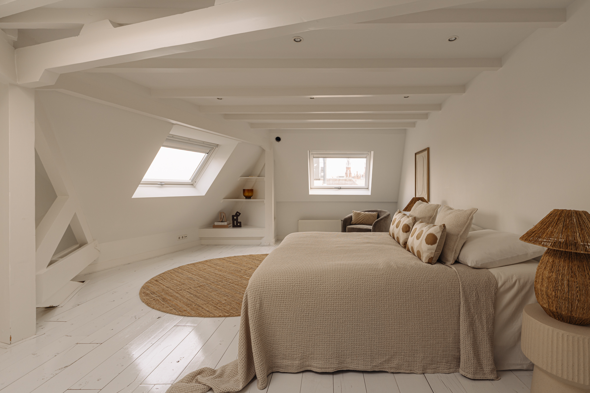 The second bedroom is situated on the fifth and top floor and comes with air conditioning, built-in wardrobes, and roof windows that flood the space with daylight. From the landing, a separate WC with washbasin is accessible.