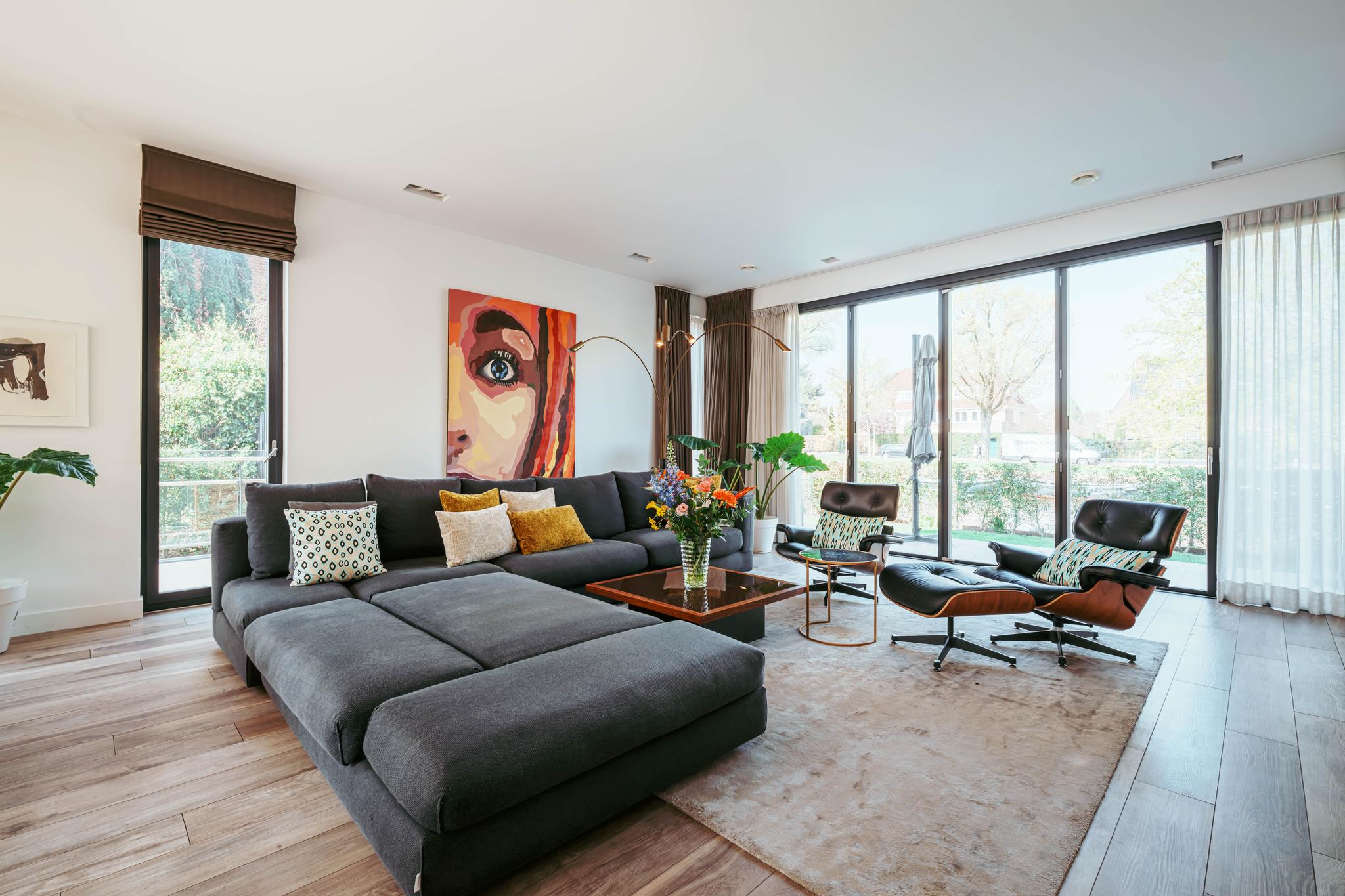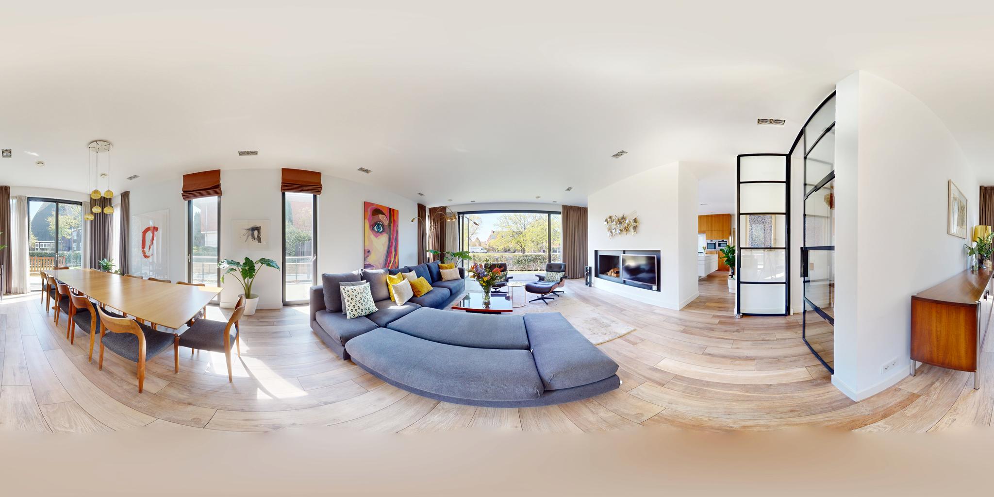 Entrance; through the hall with cloakroom and separate toilet, you reach the living area of the home. Steel doors lead to the spacious dining and living room, featuring a fireplace and French doors opening onto both the front and rear gardens. Large windows allow for ample natural light and create a seamless connection with the outdoors. Adjacent to the living room is the generously sized kitchen-diner. It includes a central island with double sink, double dishwasher, Quooker, and pull-out pantry. On the opposite side is the cooking area, featuring a five-burner gas hob, concealed spice cabinet, a large American fridge with integrated water and ice dispenser, and ample storage space. Two Bosch ovens and a warming drawer are also built in. The kitchen also boasts its own gas fireplace, which is integrated into a double wall shared with the living room fireplace. French doors in the kitchen lead to the rear garden with a private jetty, suitable for mooring a boat.