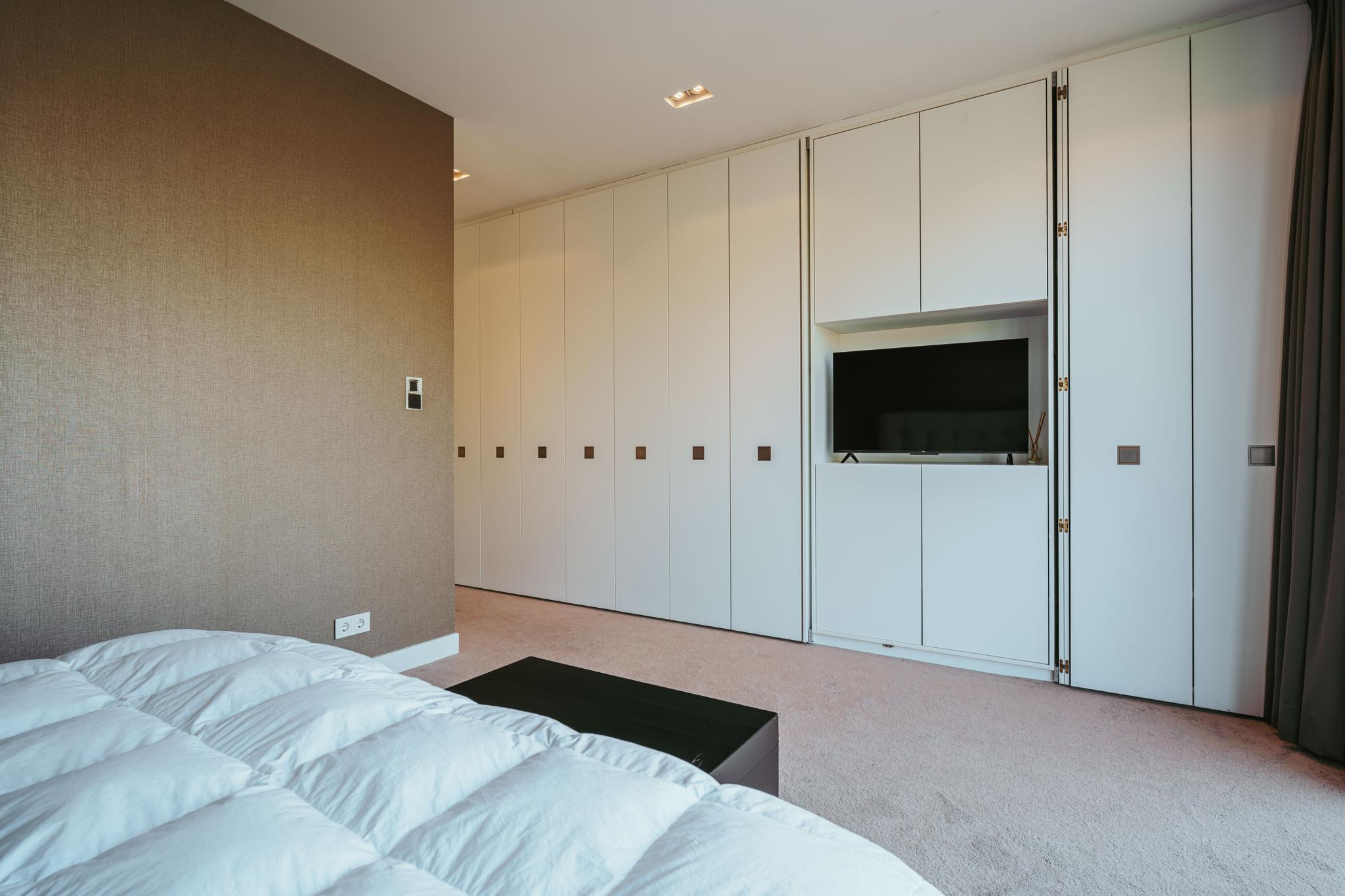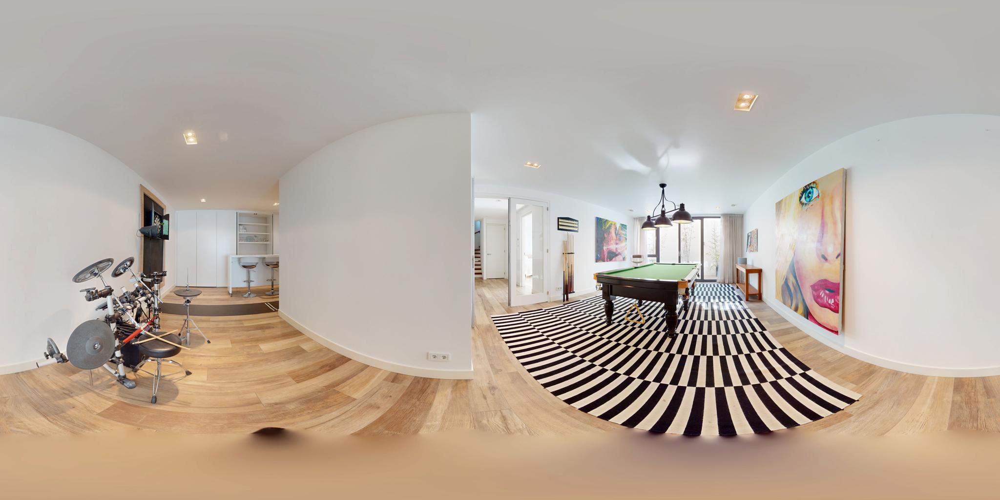 The staircase in the hall leads to the basement level. This floor includes one spacious bedroom with French doors opening onto a patio. Thanks to light wells, there is a surprising amount of daylight. You’ll also find a bathroom with shower and toilet, a large hallway, a generous storage room, and a technical room. Additionally, part of the basement is set up as a home cinema, enclosed by glass doors that block out daylight. Adjacent is a bar area. There is also a large open space, currently fitted with a pool table, which can be freely arranged as a lounge, workspace or hobby area.