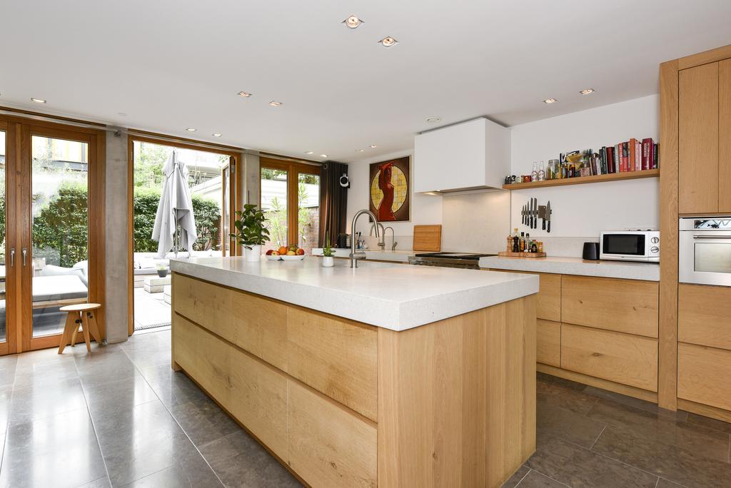 The living room is on the street side of the building and this means it has a gorgeous view out over the waters of the Boerenwetering. This area has a ceiling height of 3.90 metres and is fitted with a gas fireplace. There is a lovely view through from this space to the kitchen and garden, as well as to the freestanding bath.