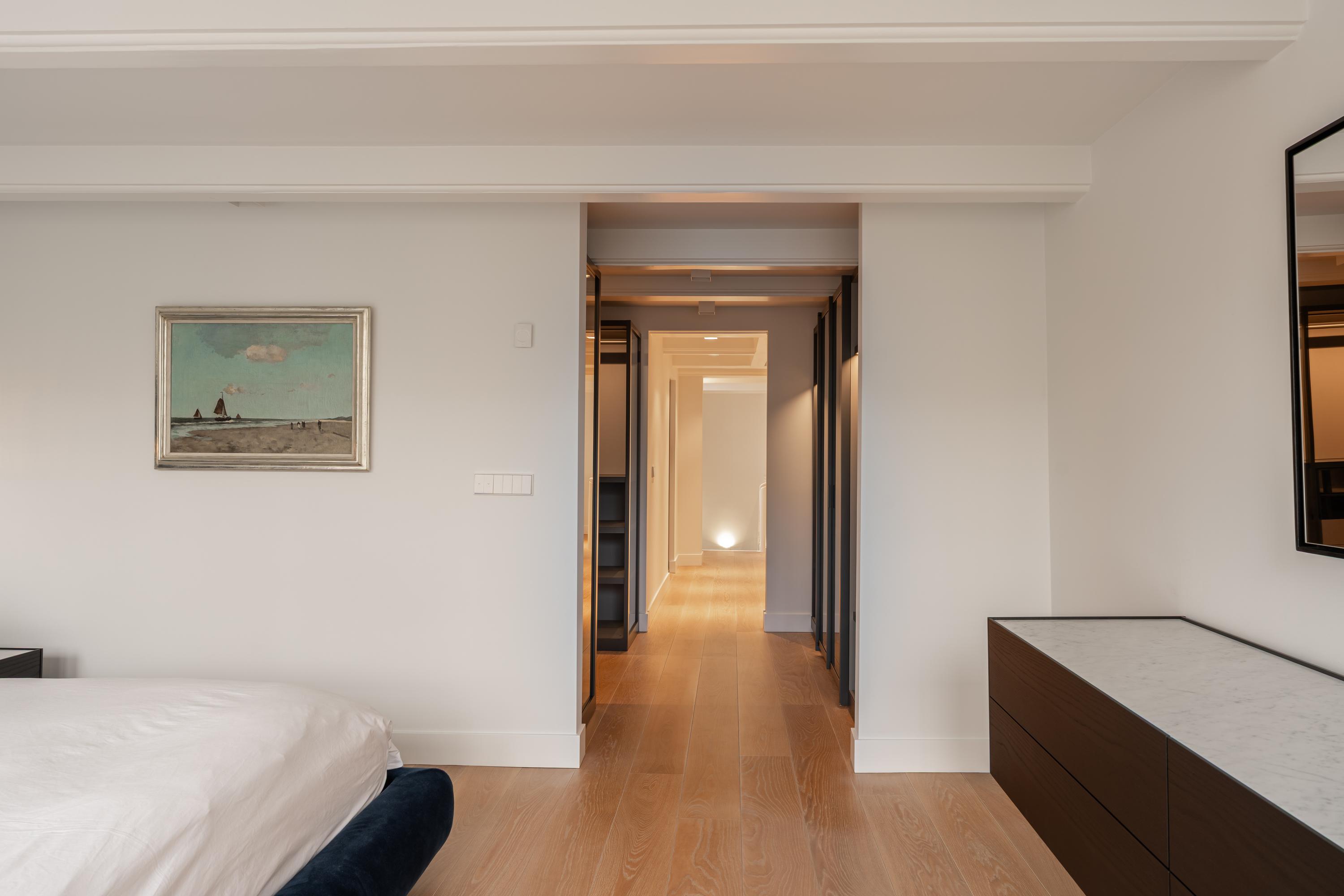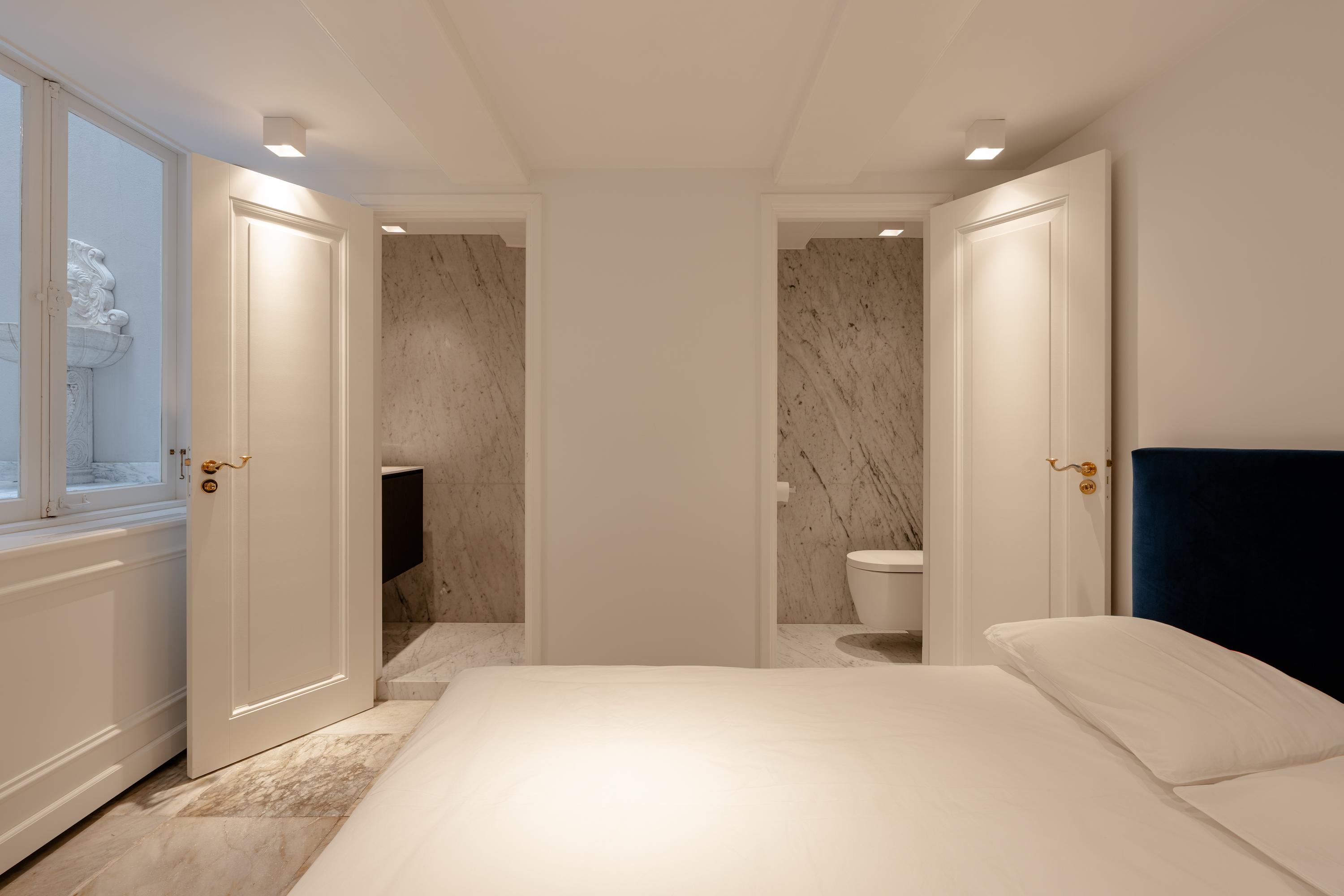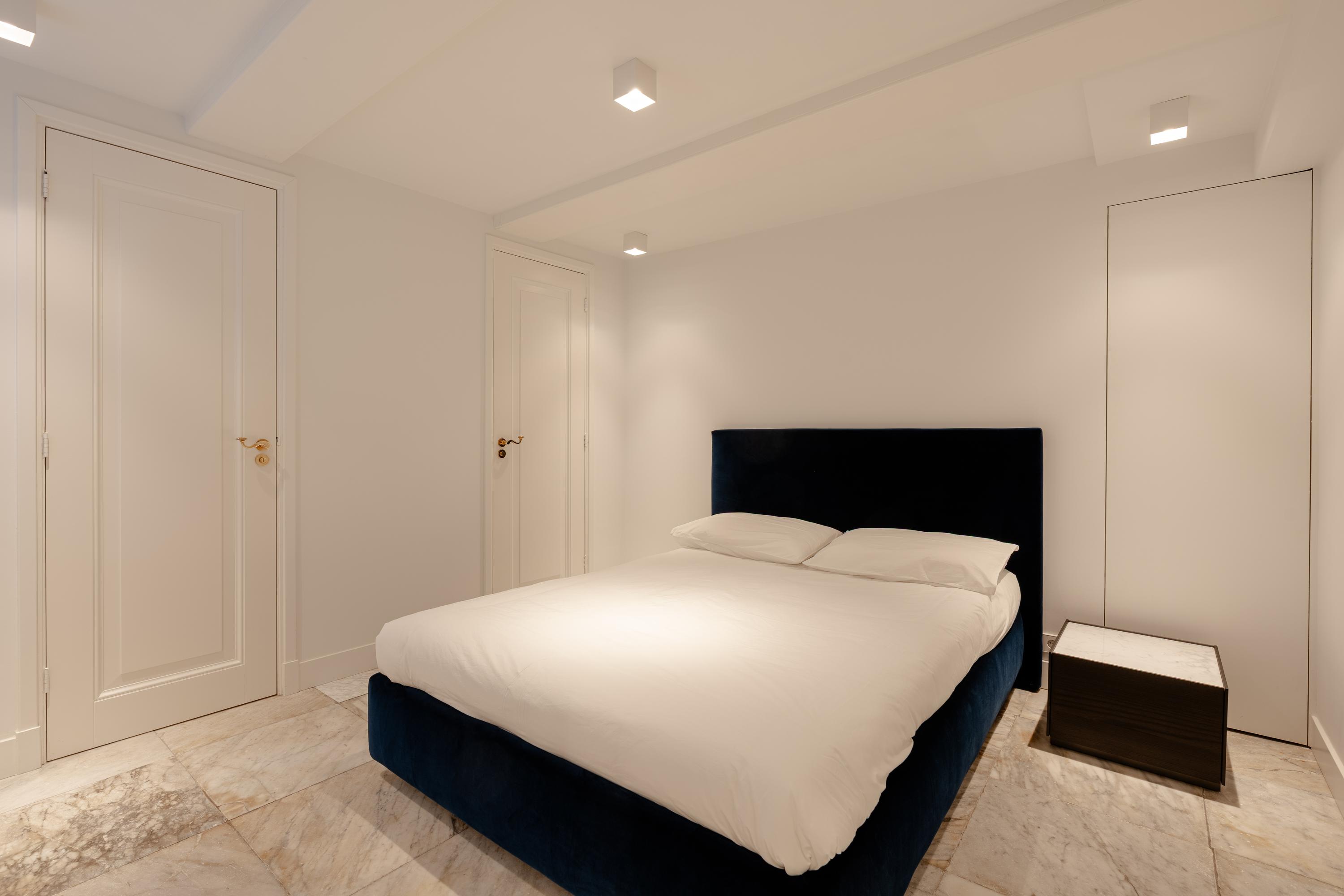 The architecture preserves original beam structures and intricate ceiling ornaments, paired with bespoke cabinetry and marbles, creating an atmosphere of calm and enduring quality. Six bedrooms and three bathrooms cater to versatile living, each space thoughtfully finished. The master suite features bespoke dark-hued wardrobes, a marble-clad bathroom, and restful canal views. Living spaces connect to the canal scenery, and the kitchen’s Saint Laurent marble and premium appliances form an elegant focal point for gathering.