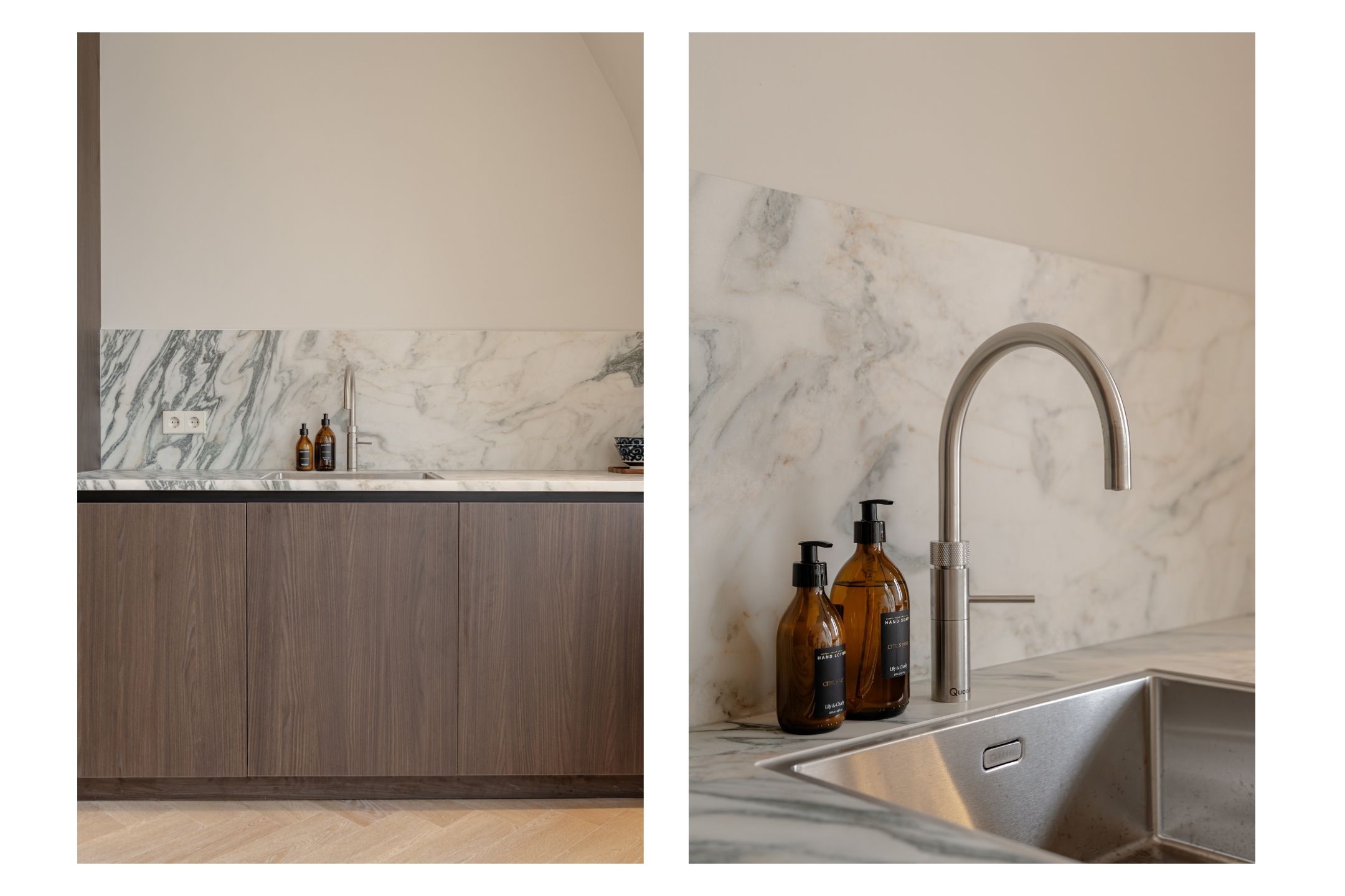 This luxurious apartment is located on the fourth floor and is characterised by a spacious and light-filled design, featuring high ceilings and striking, angled skylights at the rear. These large windows give the apartment a distinctive character and provide exceptional natural light throughout the day, along with open, green views across the city. The living room and kitchen are situated at the rear of the apartment and together form one generous living space. The unique roof structure, combined with the large skylights, creates an open and architecturally interesting atmosphere with abundant daylight and attractive sightlines. There is ample space for both a comfortable seating area and a large dining table. The luxurious kitchen is finished in a sleek and timeless design and integrates seamlessly with the living area. It is equipped with an induction hob, sink with Quooker, combi oven, climate cabinet, dishwasher, separate refrigerator and freezer, and offers generous workspace and storage capacity. At the front of the apartment are two well-proportioned and quietly located bedrooms. The master bedroom features an en-suite bathroom fitted with a walk-in shower and a double washbasin with vanity unit. Centrally located on the landing is the second bathroom, also equipped with a walk-in shower and a washbasin with vanity unit. In addition, there is a separate toilet and practical built-in storage. The roof terrace is accessible via an internal staircase. This spacious terrace offers a high level of privacy and has been structurally prepared for the installation of a jacuzzi, including a double electrical group. Provisions have also been made for an outdoor shower (water connection) and for the installation of an outdoor kitchen (water and electricity connections), making this outdoor space a valuable extension of the living comfort.
