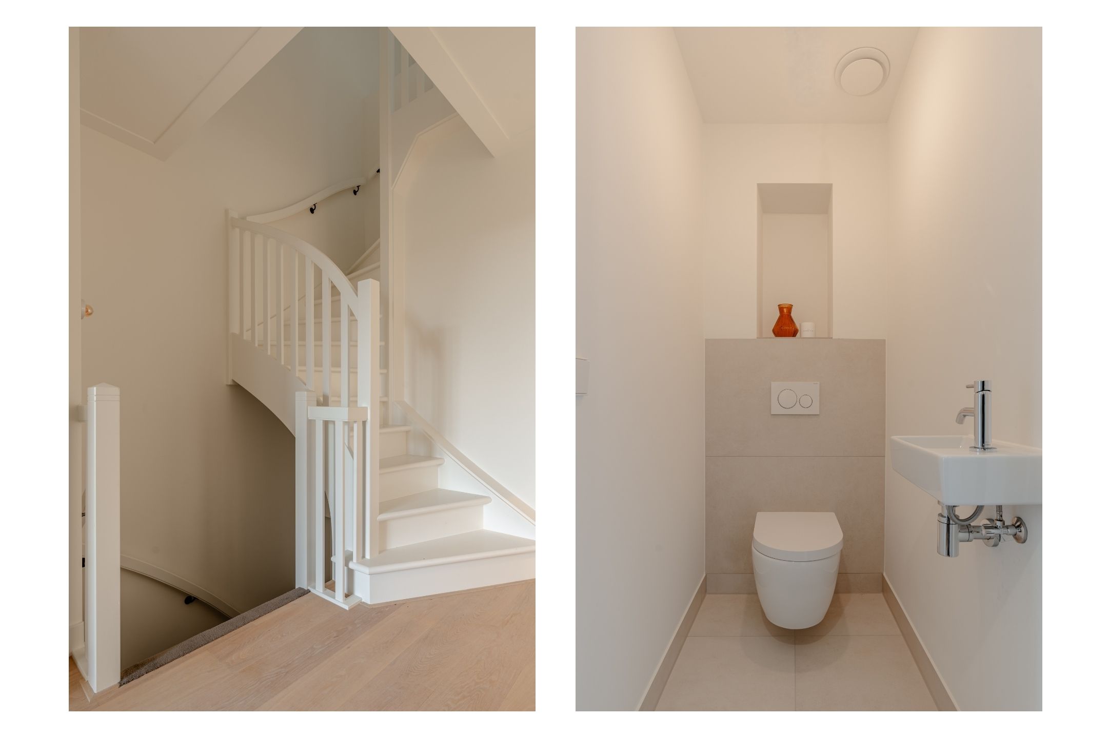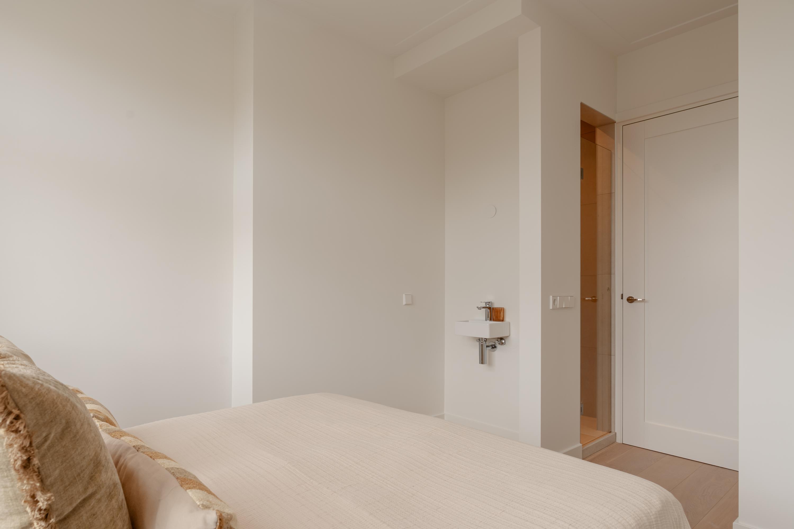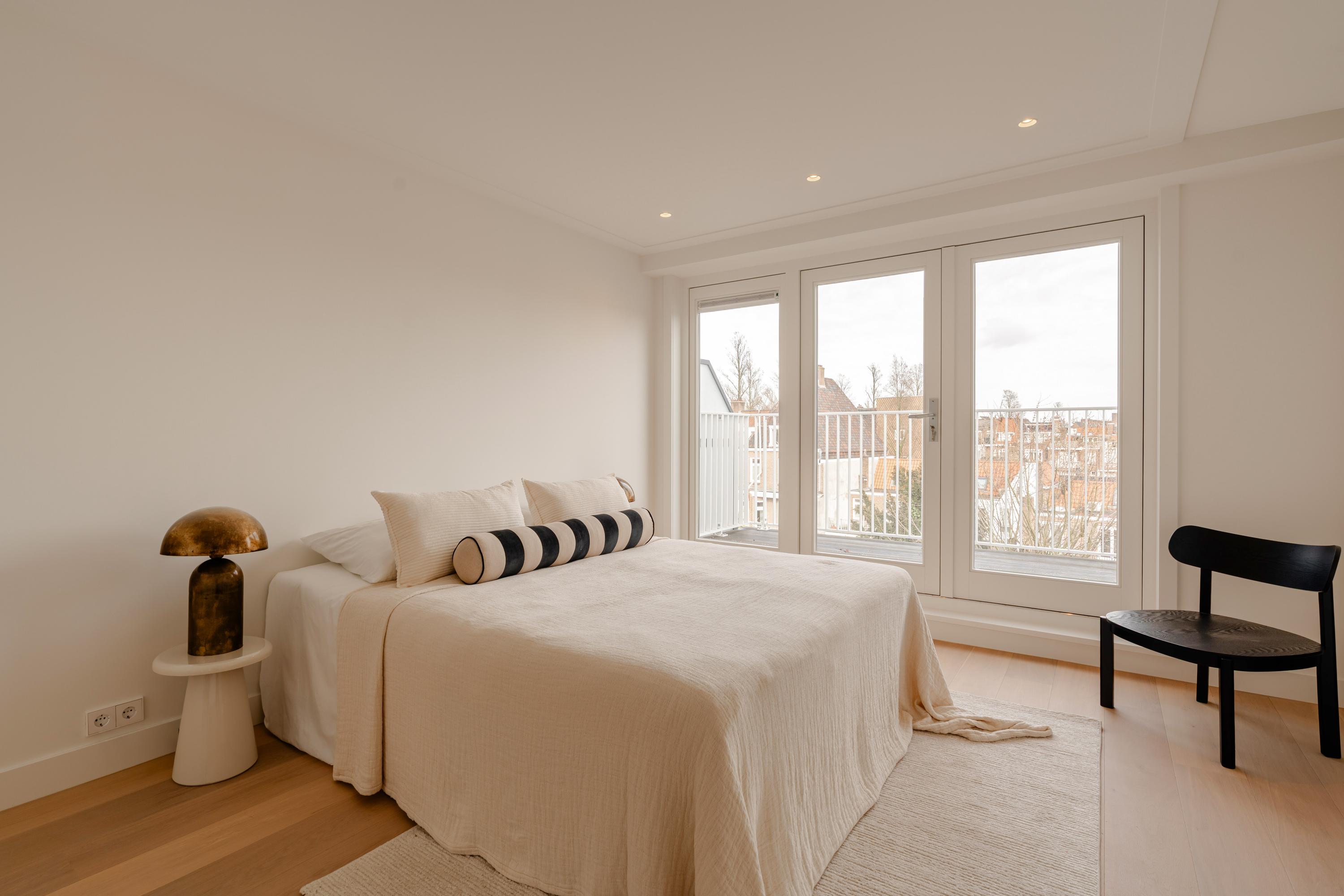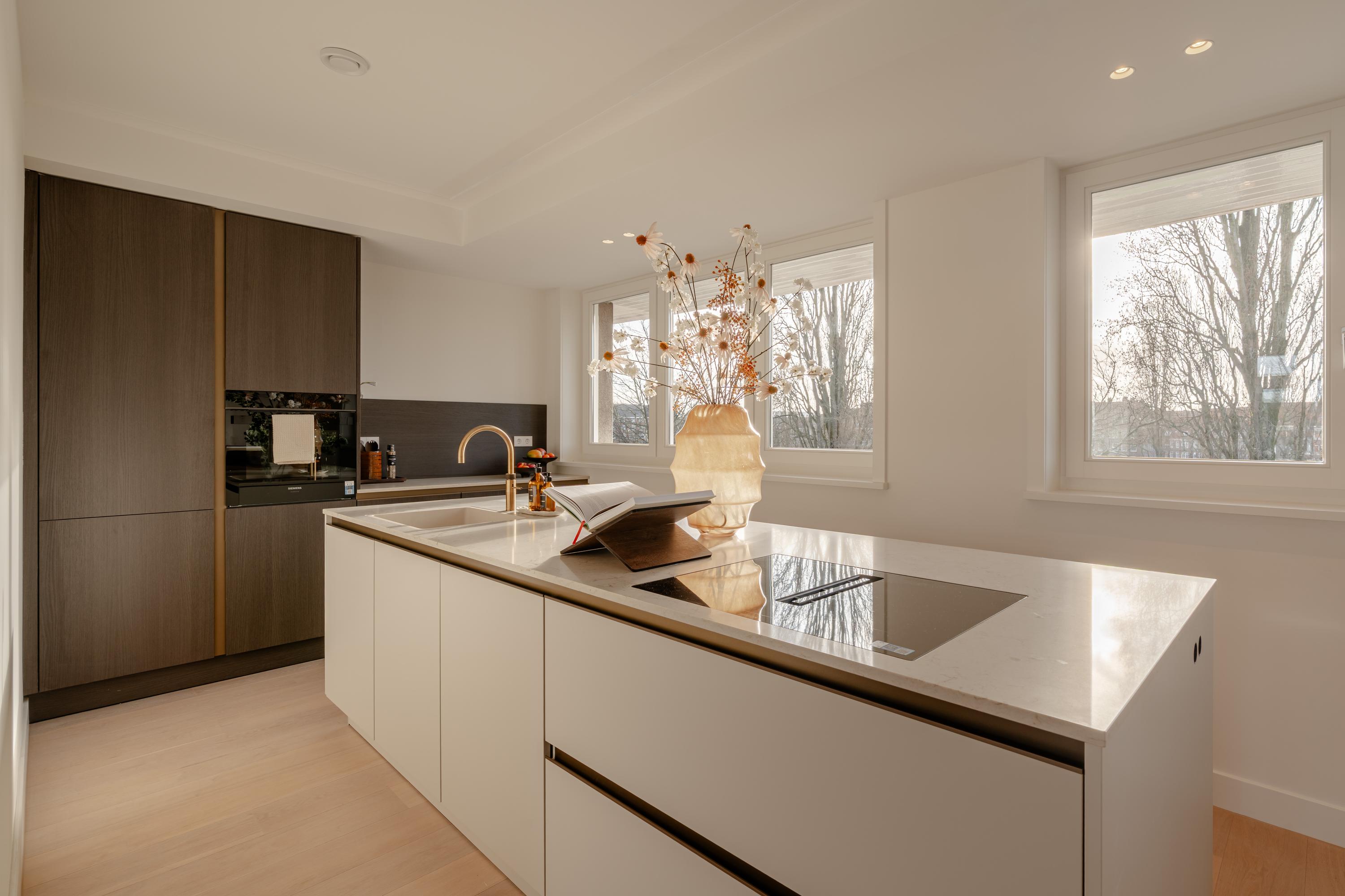 The open-plan kitchen is a true eye-catcher, fitted with high-quality built-in appliances: an induction hob with integrated extractor, dishwasher, combi-oven and Quooker tap. The combination of sleek handleless cabinetry and warm wooden accents gives this floor a modern yet inviting feel. From the living room you have access to a sunny southeast-facing balcony, perfect for a morning coffee or an afternoon drink in the sun.