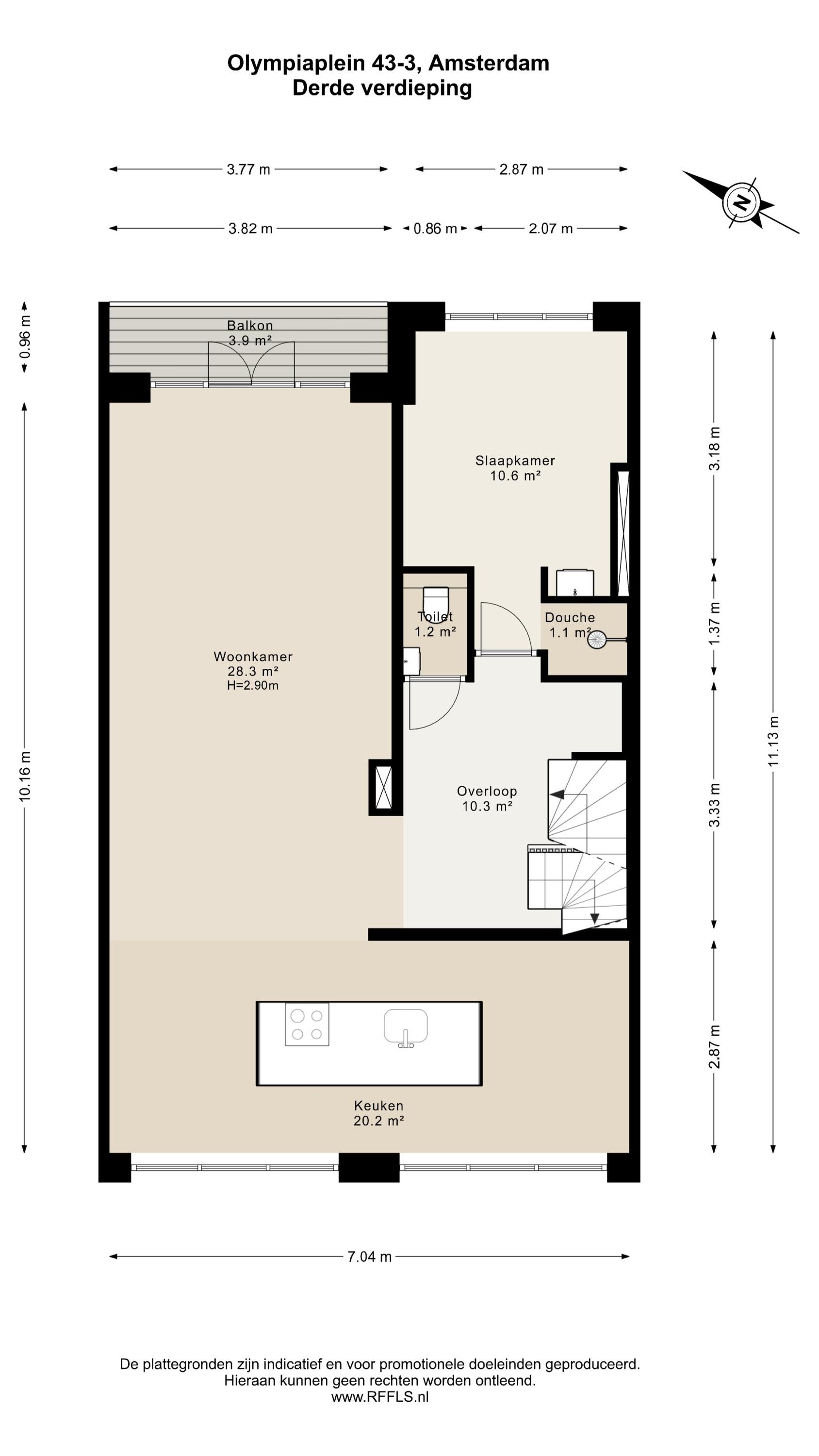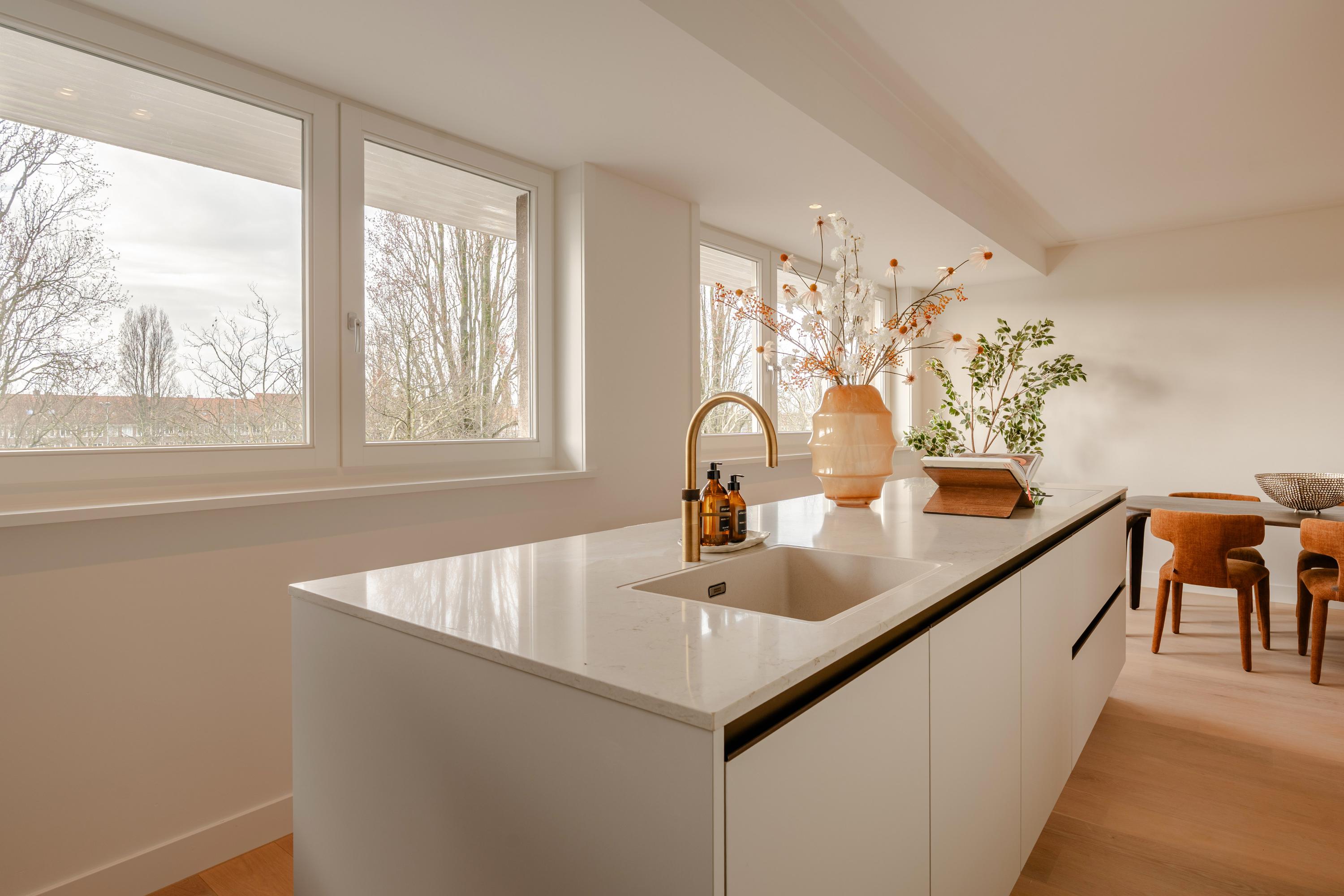 On the third floor lies the heart of the home. From the spacious hallway, with a practical built-in wardrobe and separate WC, you enter the bright and expansive living room with open-plan kitchen. This room extends across the full width of the property (over 7 metres) and, with large windows on both sides, is flooded with natural light and offers wonderful, unobstructed views over Olympiaplein.
