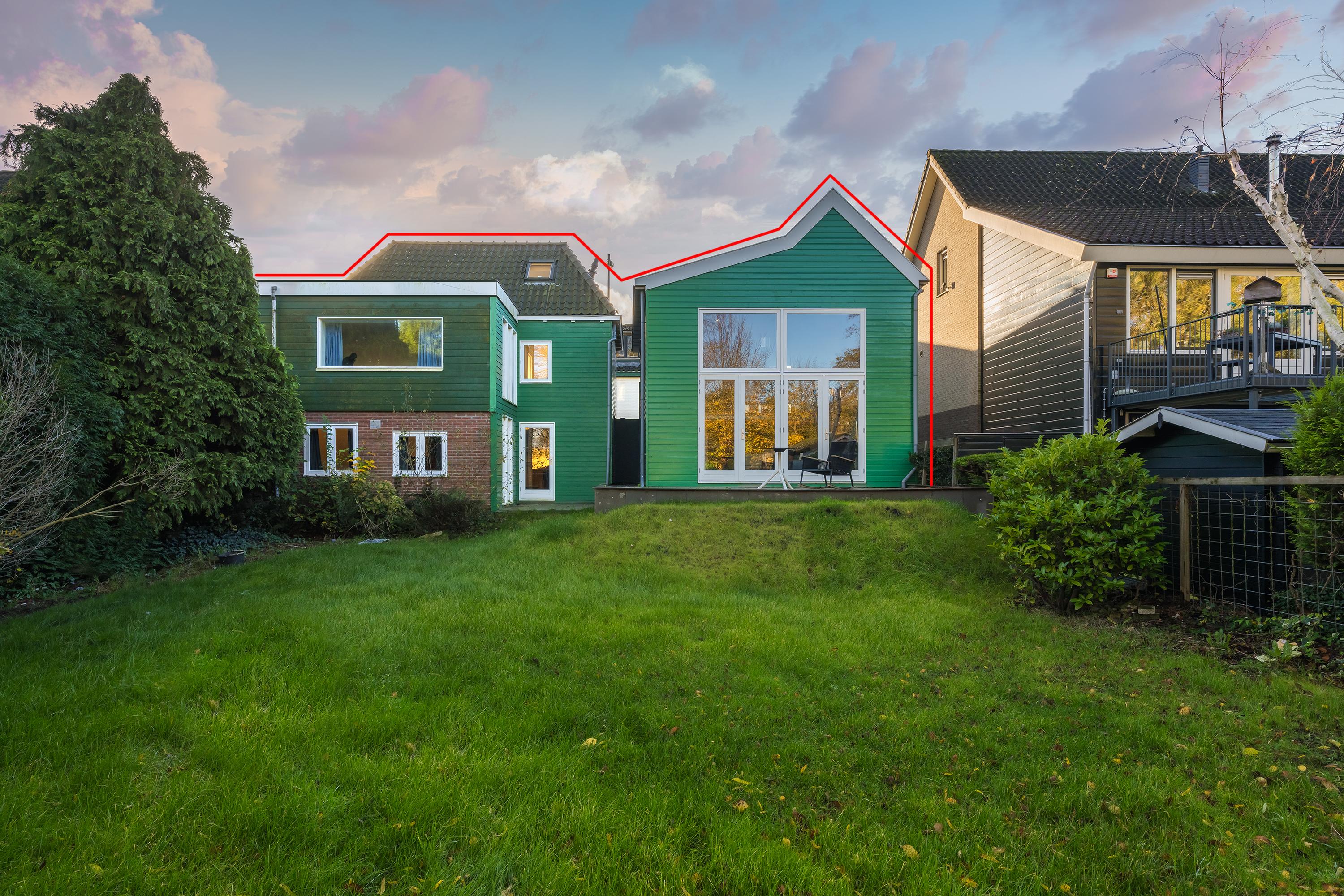 On the quiet part of the Oostzanerdijk stands this house on a wide lot. The house is a cool “fusion” design of two architectural styles. One is a fresh green Zaans (new construction) house, which stands free. It stands next to the original (remodeled) detached stone dike house. At least, it looks that way “on” the dike. From the garden you can see that it is 1 spacious detached house. On this level, the houses are connected, over almost the entire width of the lot.