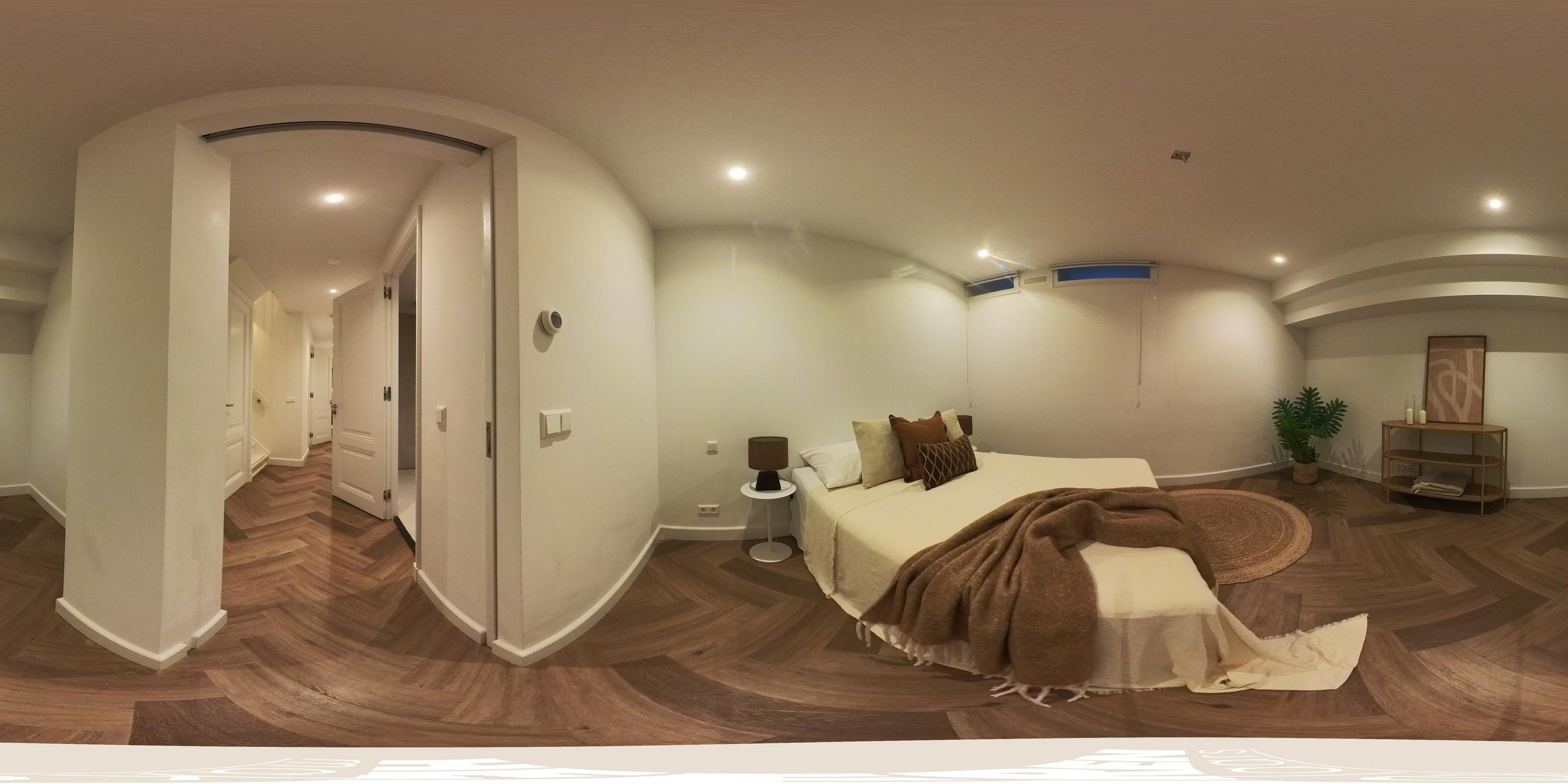 A fixed staircase leads down to the basement level, where three well-proportioned bedrooms are located. The master bedroom is positioned at the front of the property, directly next to a modern bathroom fitted with a walk-in shower and a vanity unit with washbasin. In the centre of the floor, you will find a second bathroom with a bathtub and vanity unit, as well as a separate toilet and a practical storage cupboard. Two additional bedrooms are located at the rear, making them ideal as guest rooms, children’s bedrooms, or a home office. A further spacious storage cupboard is accessible from the central hallway and is located beneath the staircase.