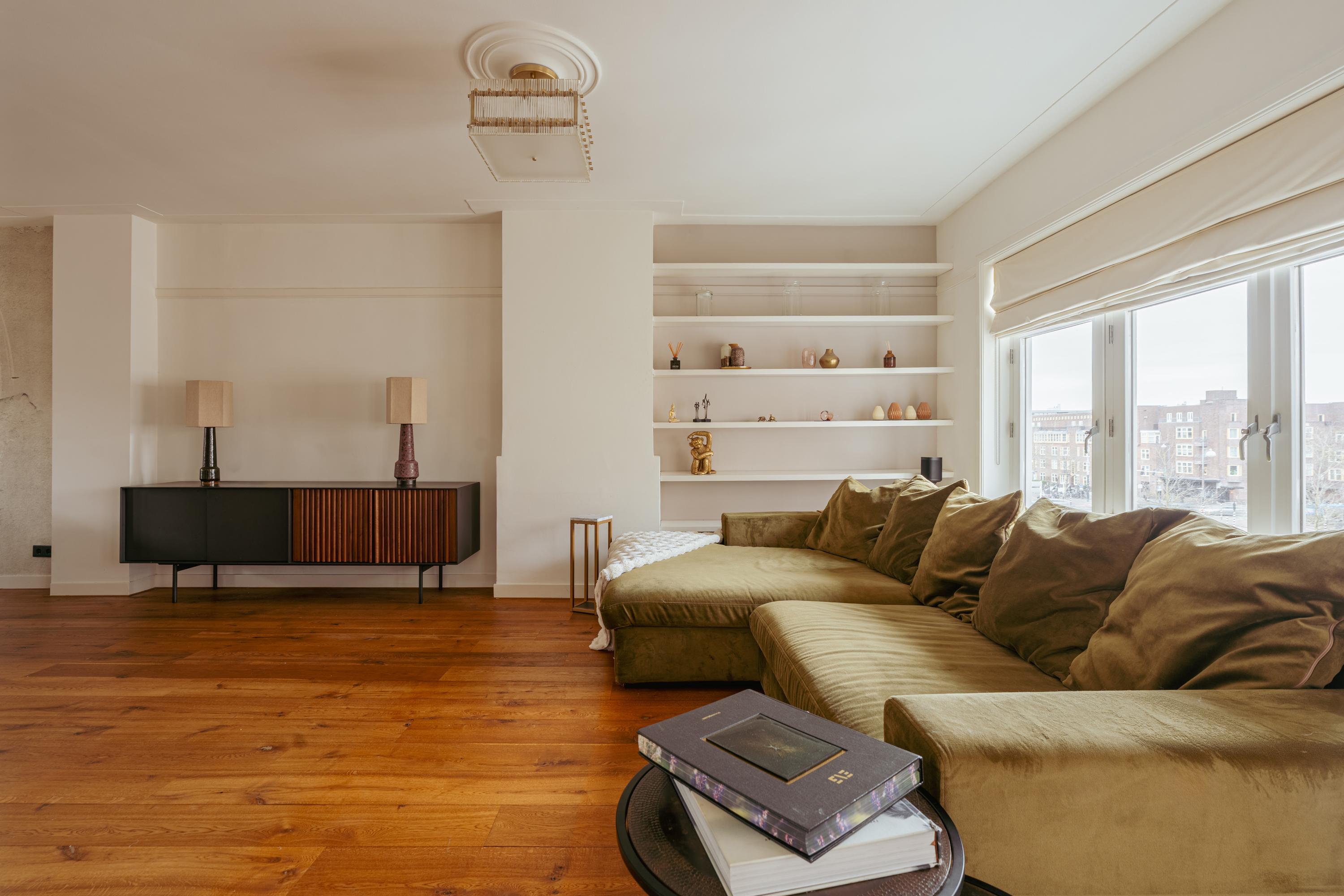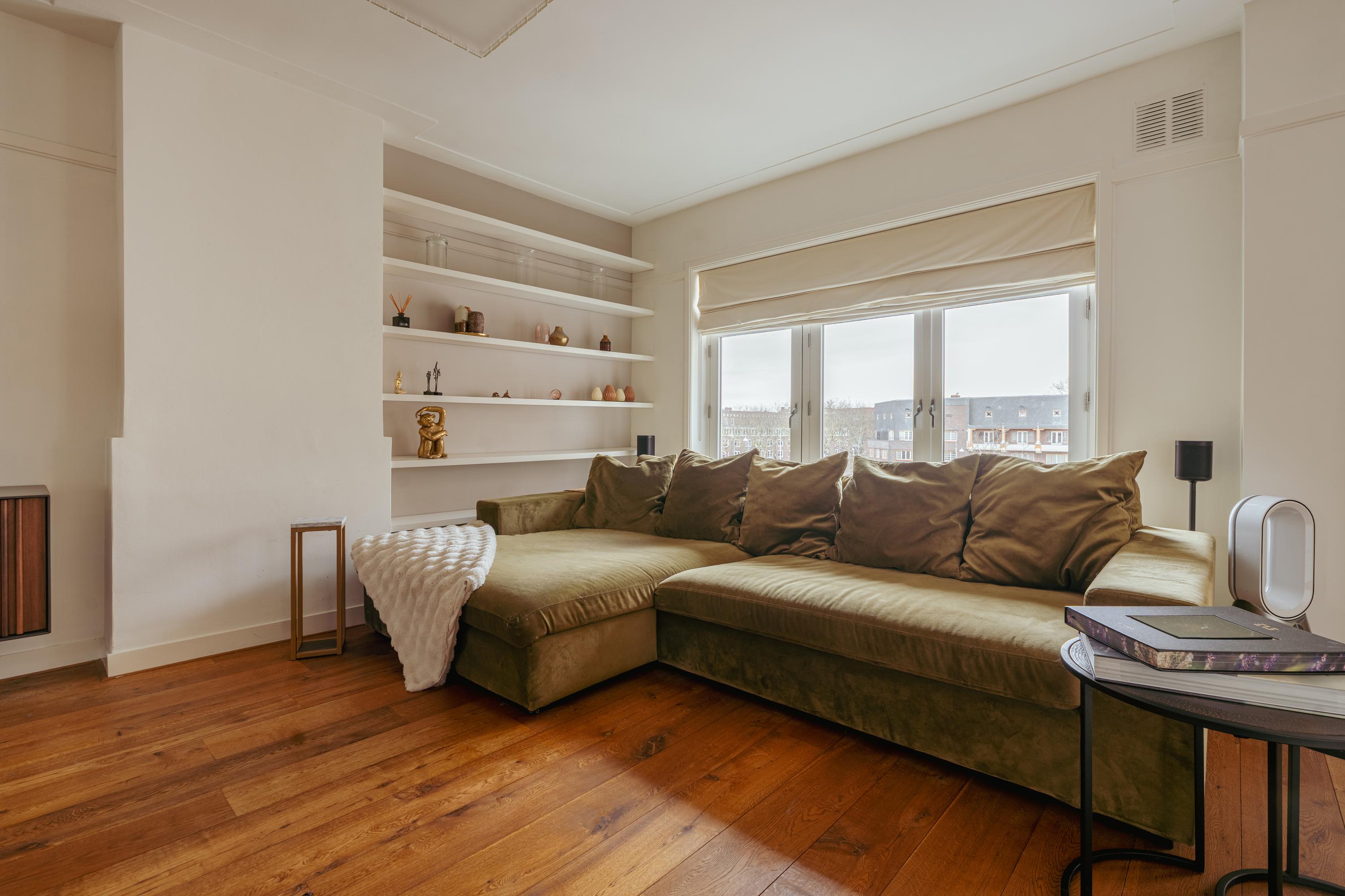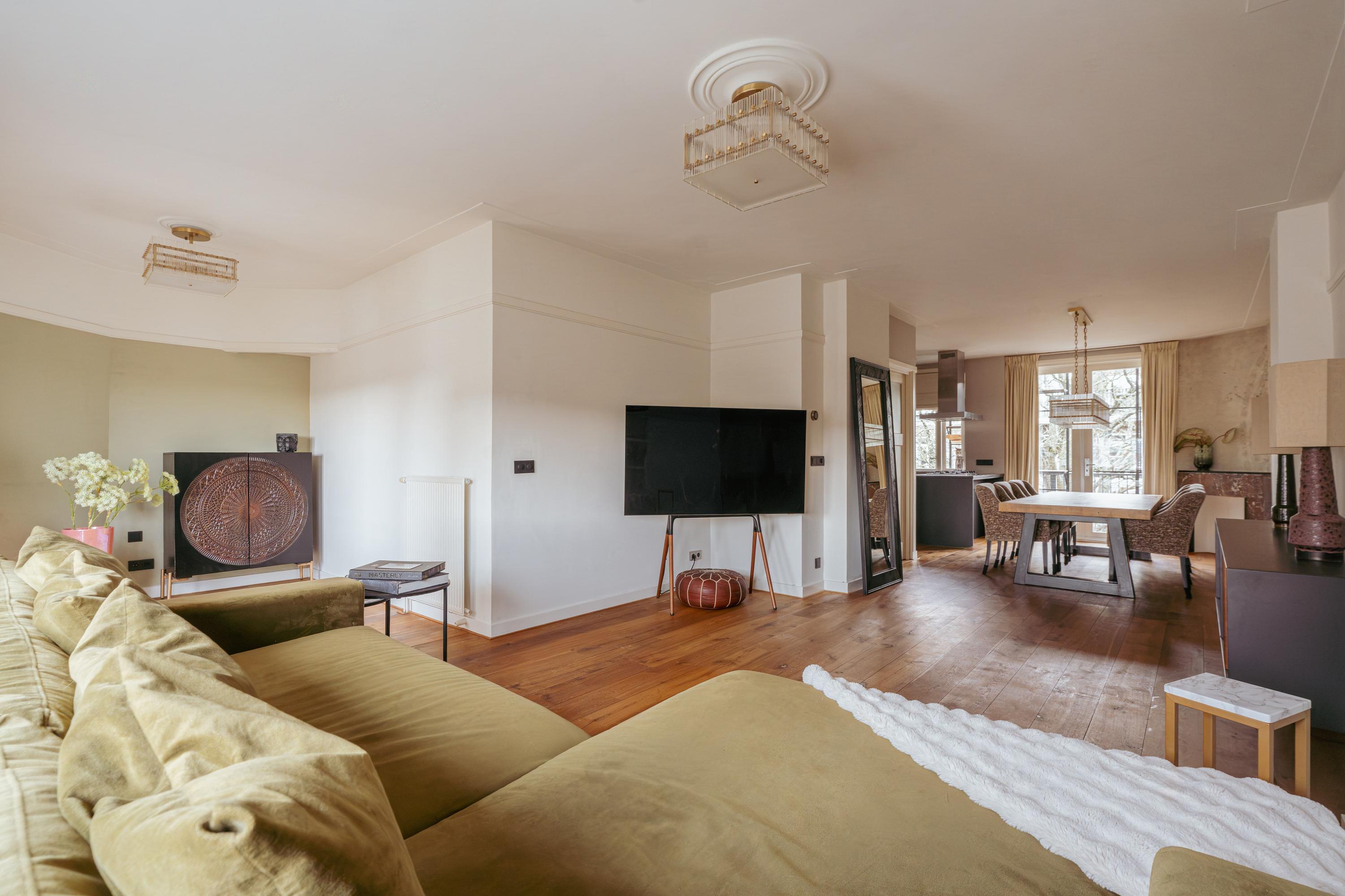 The spacious living area forms the heart of the apartment: an impressive L-shaped living room extending from the front to the rear of the property. Large windows at the front provide beautiful natural light. French doors open onto a charming balcony with open views over the lively Stadionplein. The generous layout offers various possibilities for furnishing and arrangement.