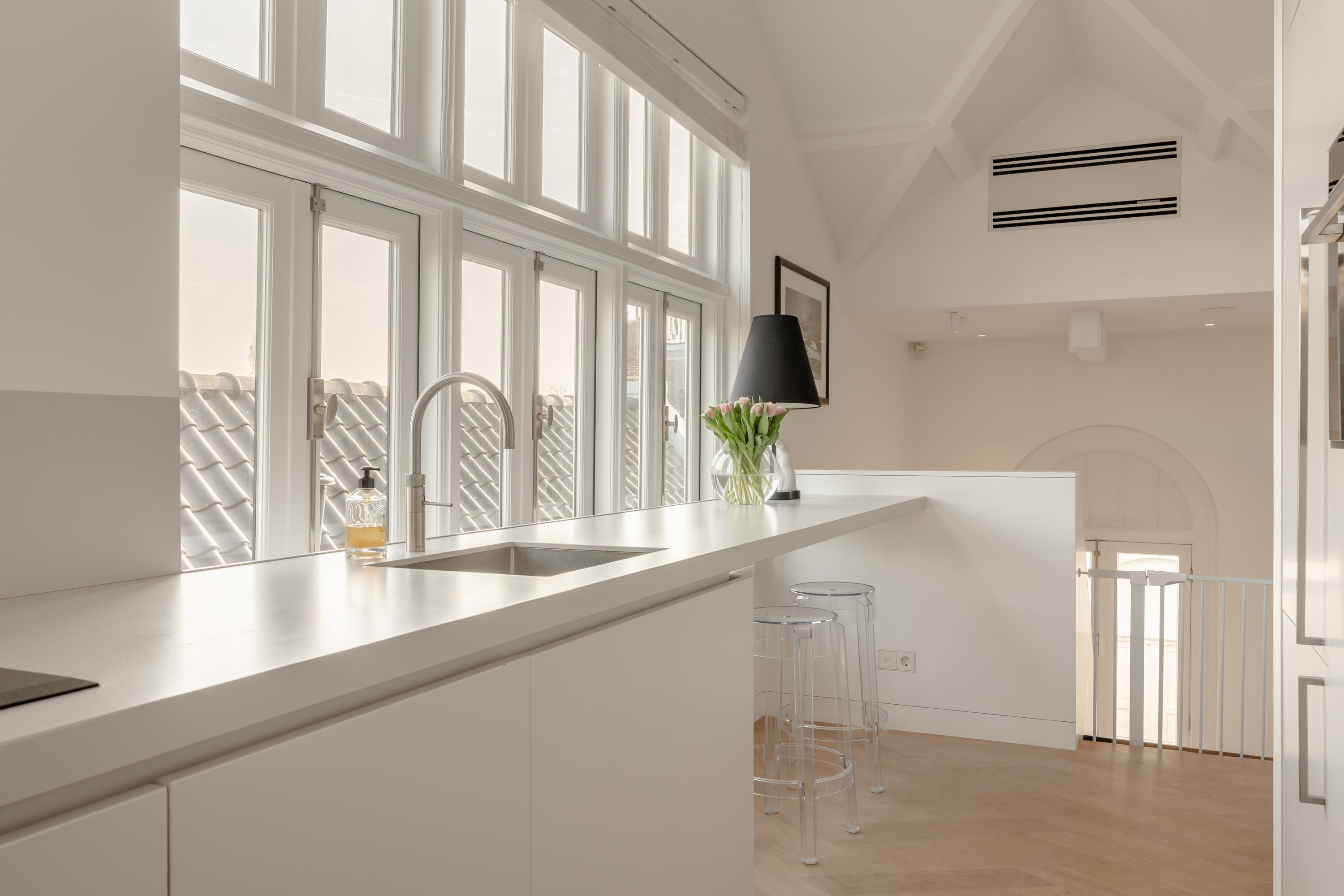 Thanks to the large windows, the space is filled with natural light and offers beautiful views over the characteristic rooftops of Oud-West, creating an open and serene living experience. The kitchen is equipped with high-end Siemens built-in appliances, an induction hob, Quooker tap, and a wine climate cabinet. Integrated air conditioning completes the comfort.