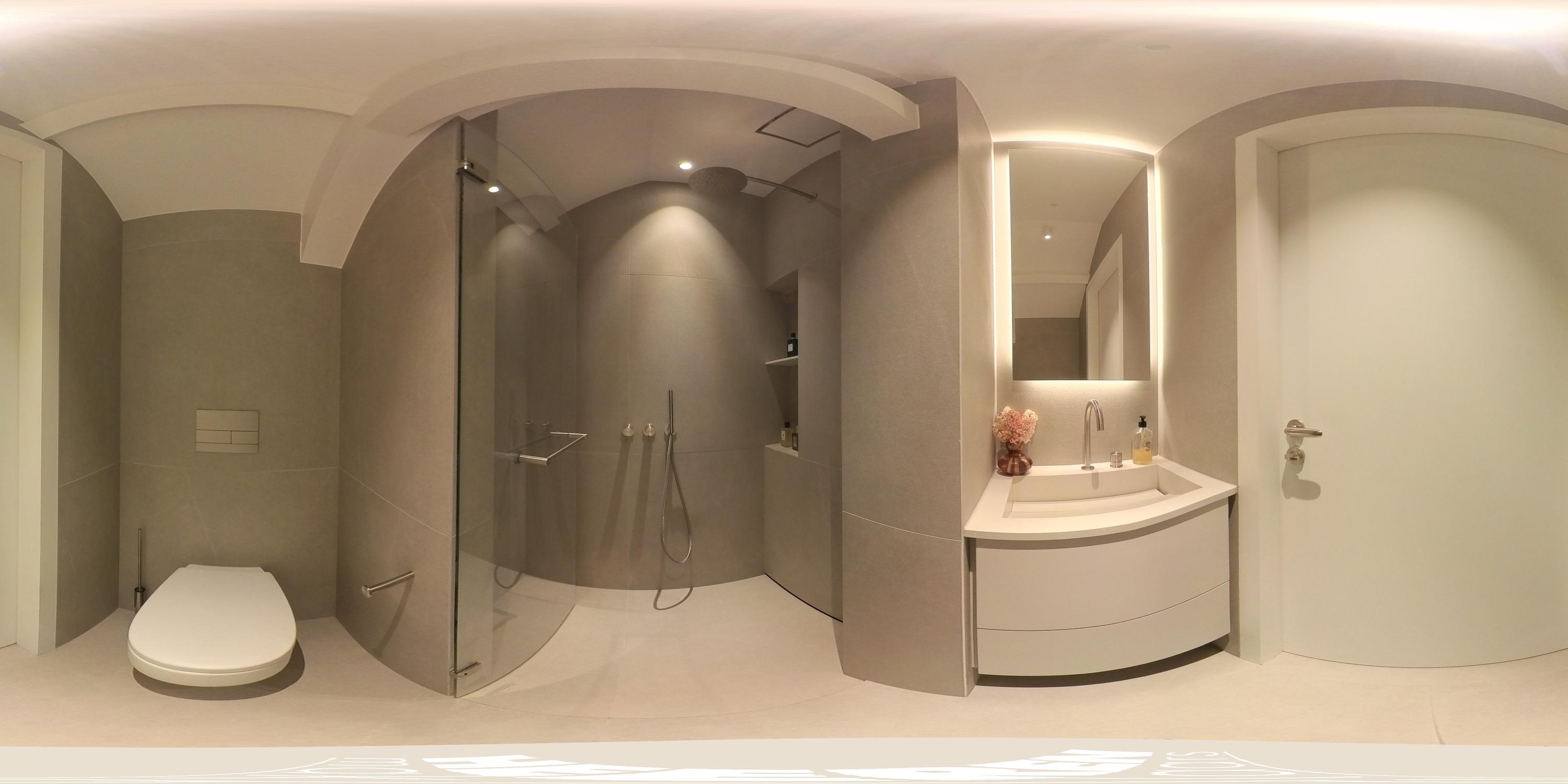 At the front of the apartment is the second bedroom, fitted with built-in wardrobes. Currently used as a children’s room, it is a full-sized bedroom with space for a double bed. Opposite this room is the second bathroom, finished to the same high standard as the main bathroom and equipped with a walk-in shower, washbasin, and toilet.