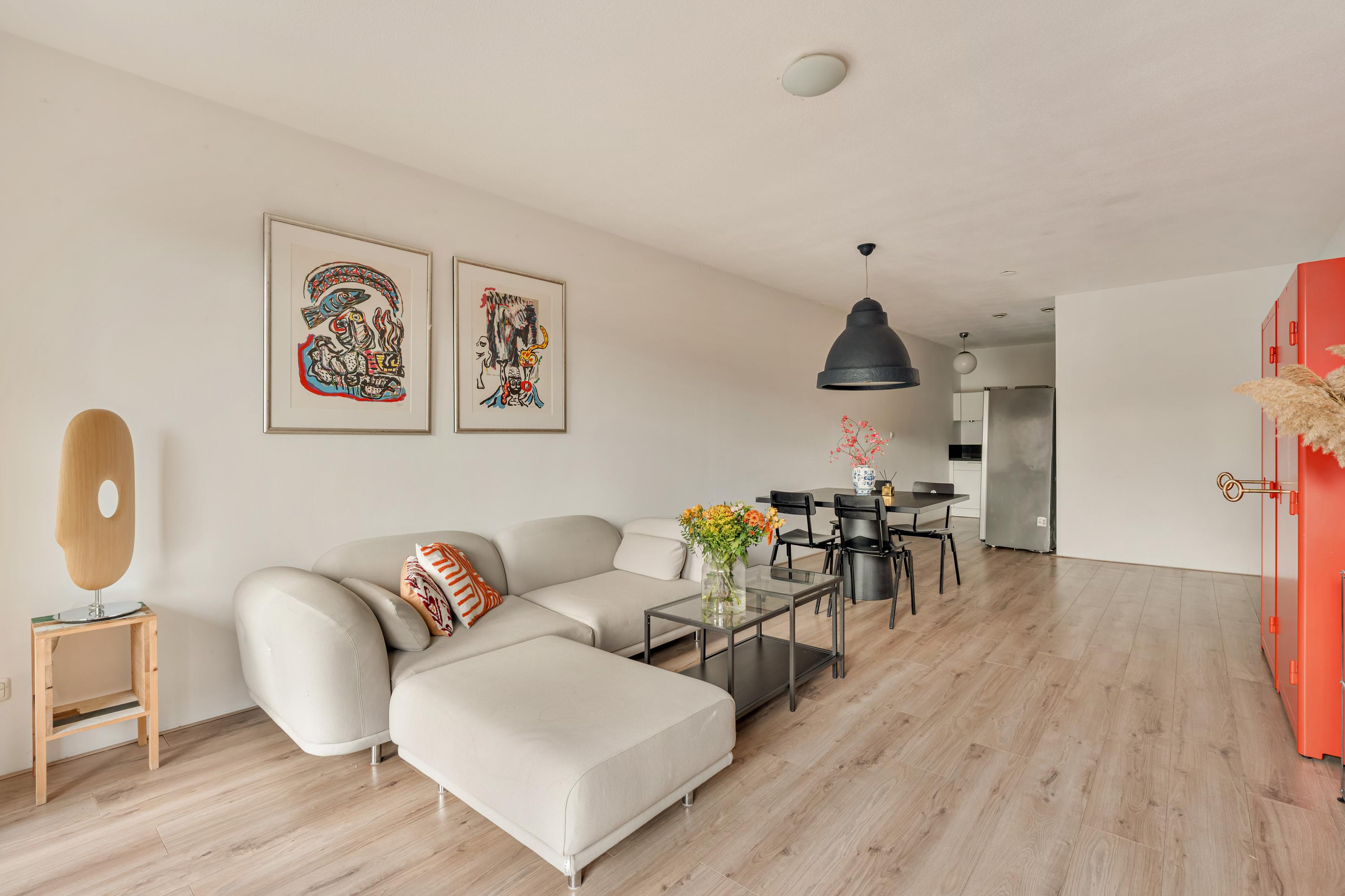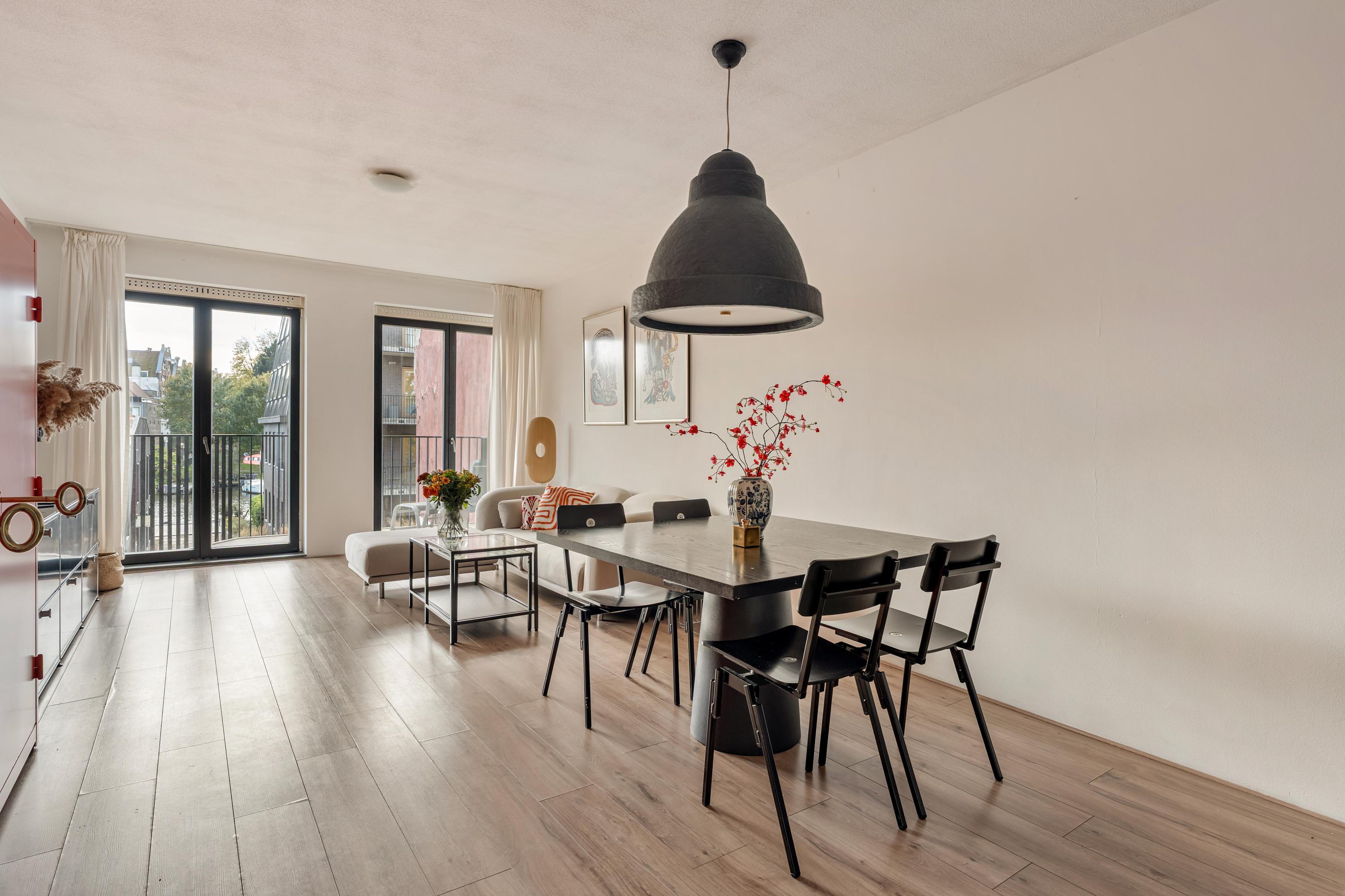 De royale en lichte woonkamer wordt gekenmerkt door grote raampartijen en dubbele openslaande deuren naar het balkon op het zuiden. Hierdoor valt er veel daglicht binnen en heeft u een prachtig uitzicht over de karakteristieke bebouwing van de Westelijke Eilanden. De ruimte biedt comfortabel plaats aan zowel een zit- als eethoek.