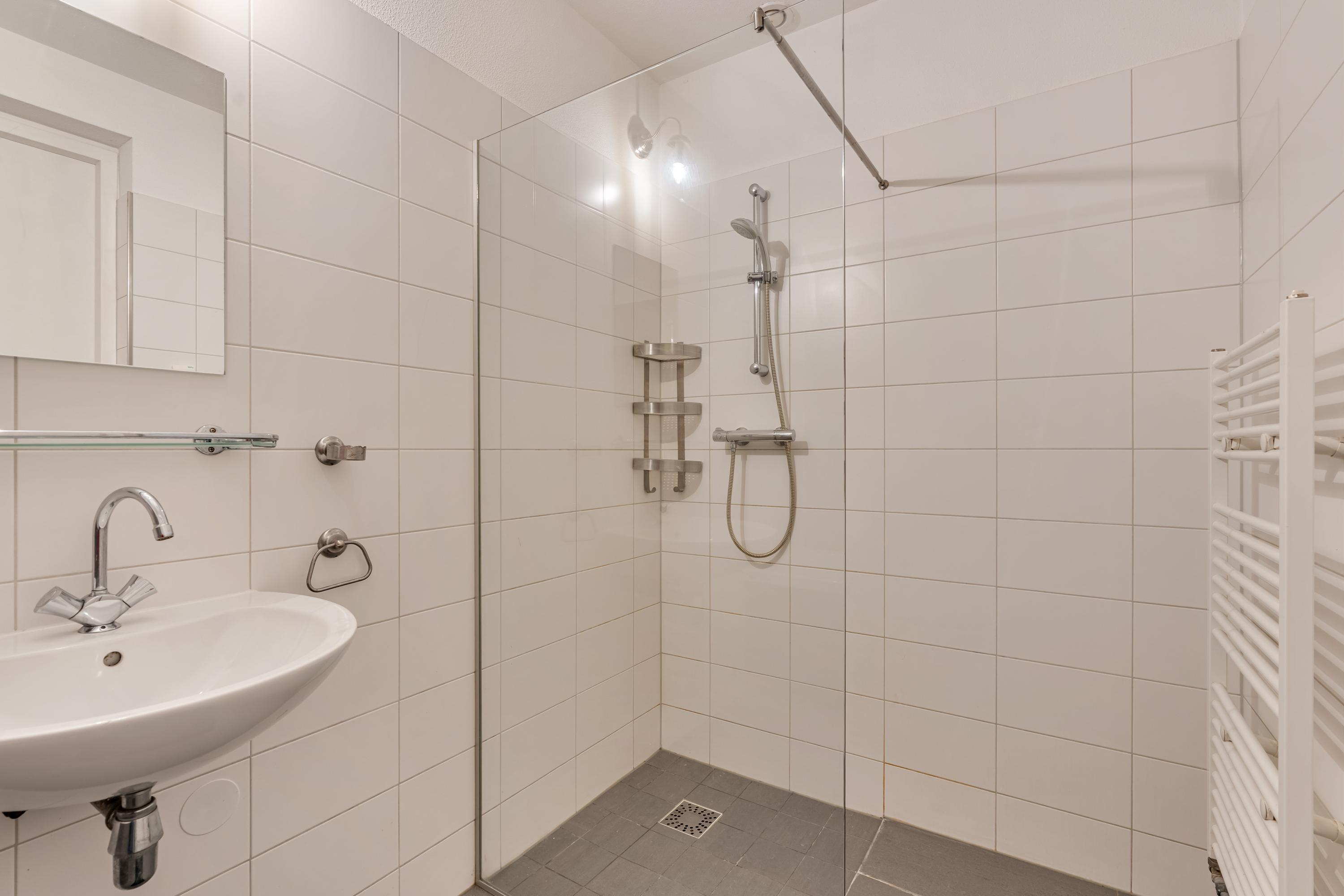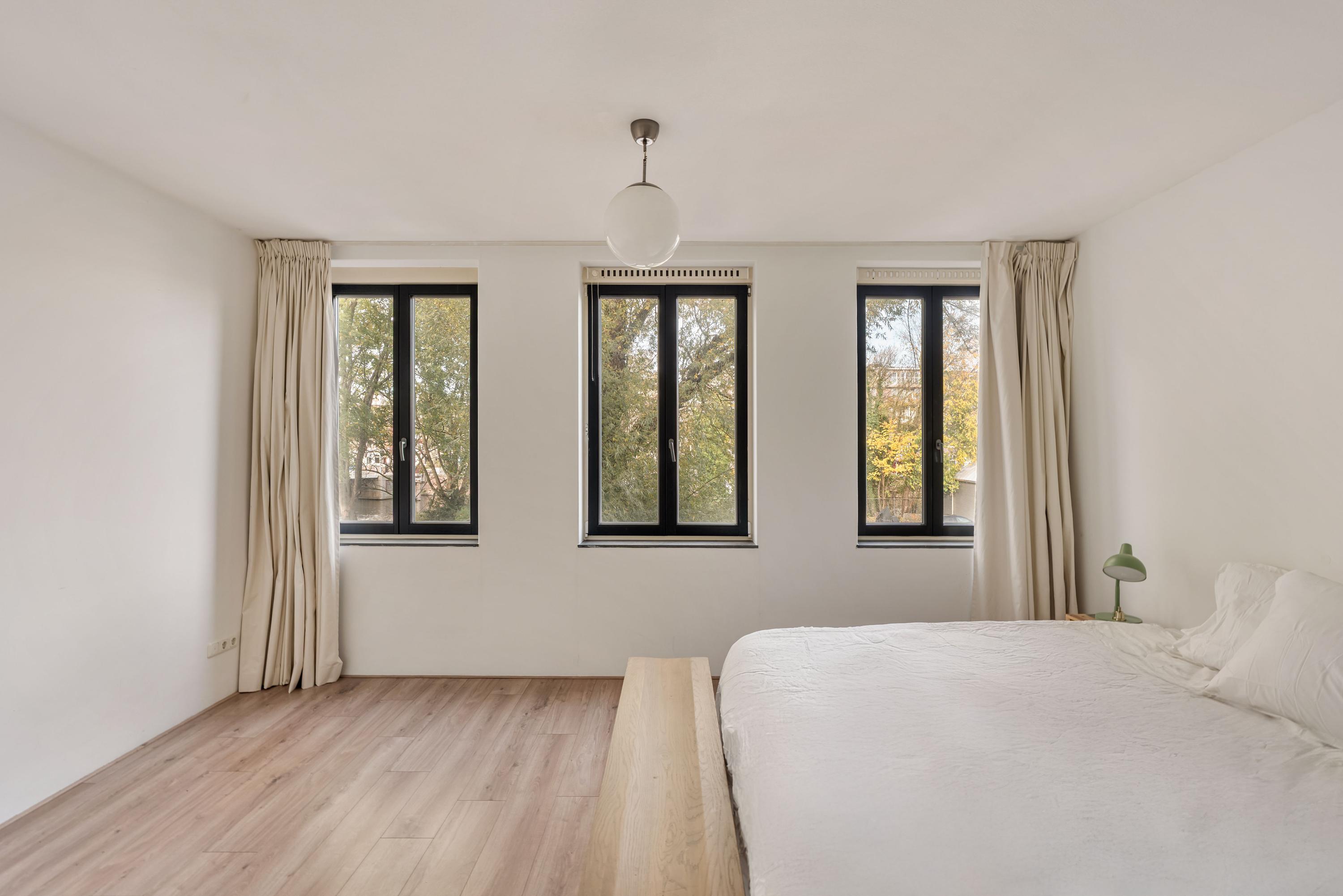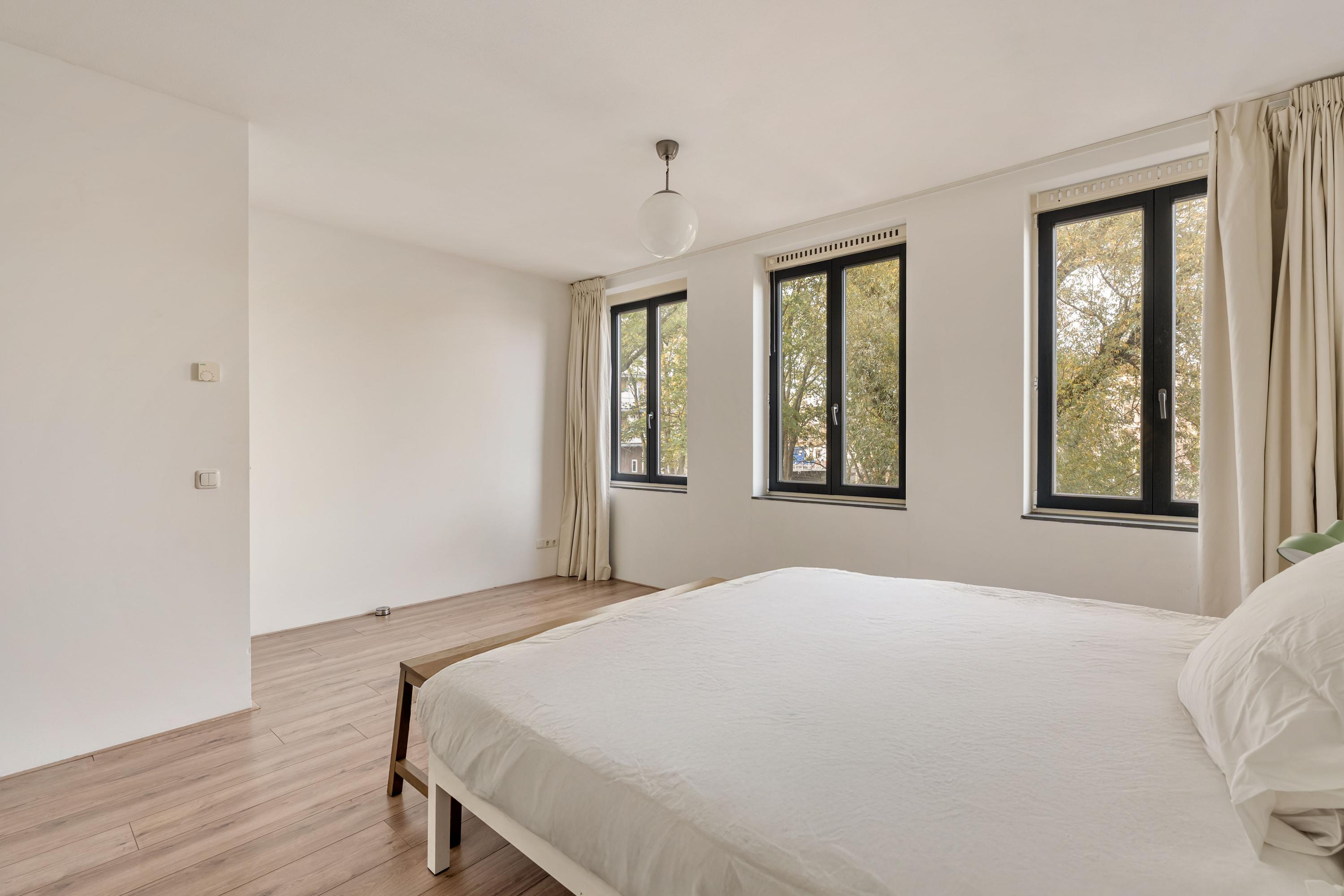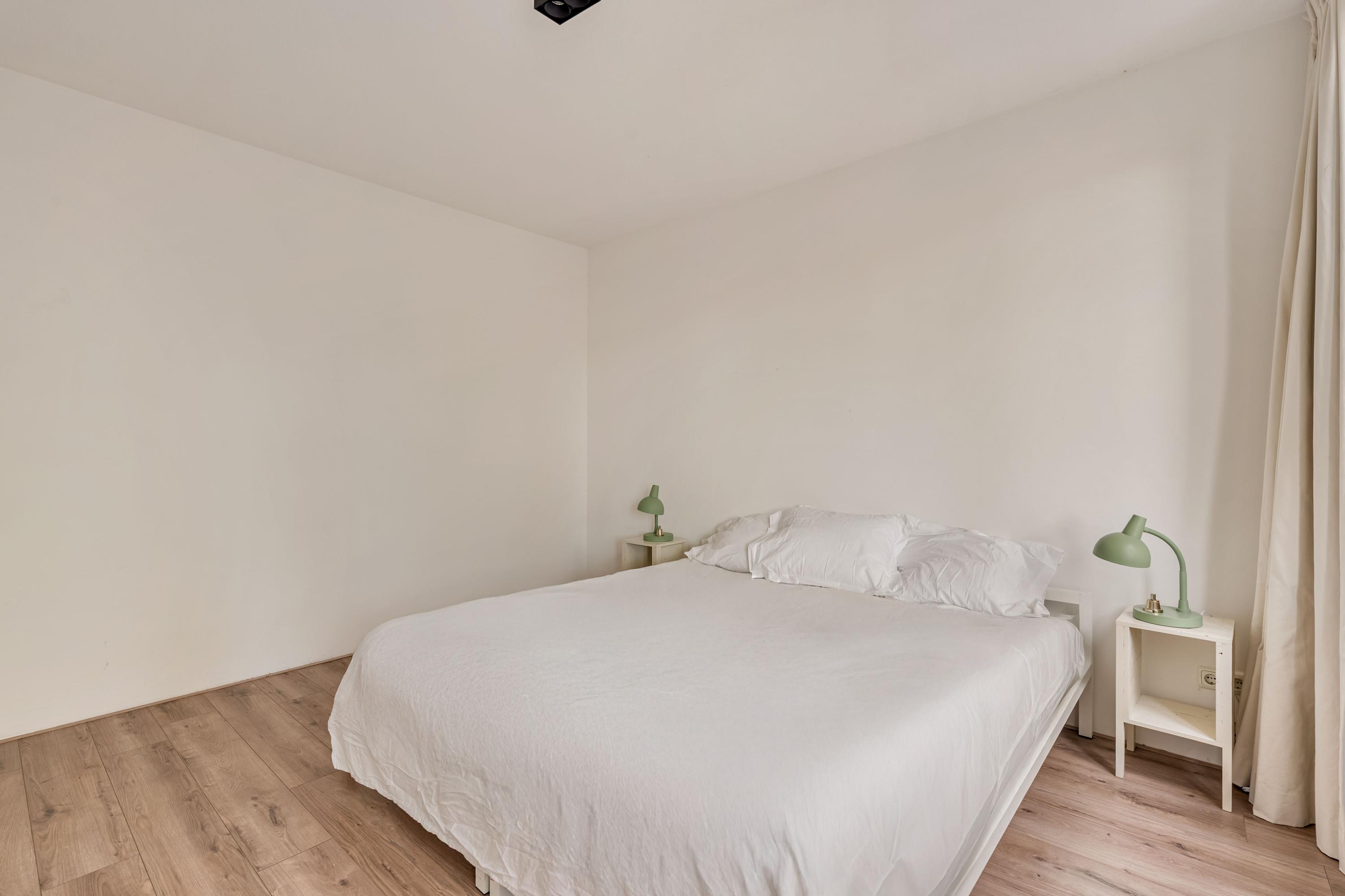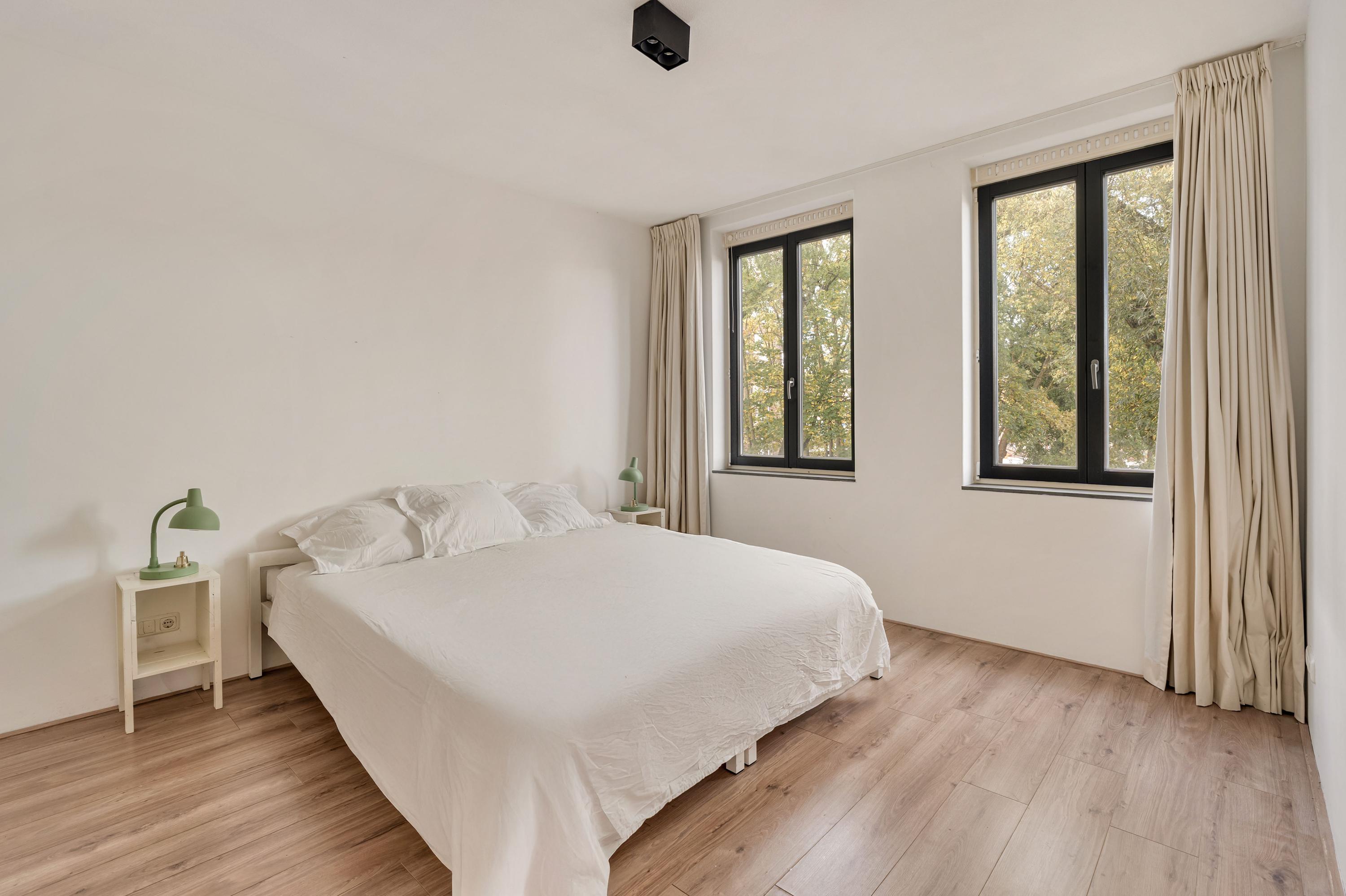 De woning beschikt over twee ruime, lichte slaapkamers, beide gelegen aan de rustige straatzijde en voorzien van grote ramen met groen uitzicht. In beide kamers is voldoende ruimte voor een groot bed en kastruimte. De centraal gelegen badkamer is uitgerust met een ligbad, inloopdouche en wastafel.