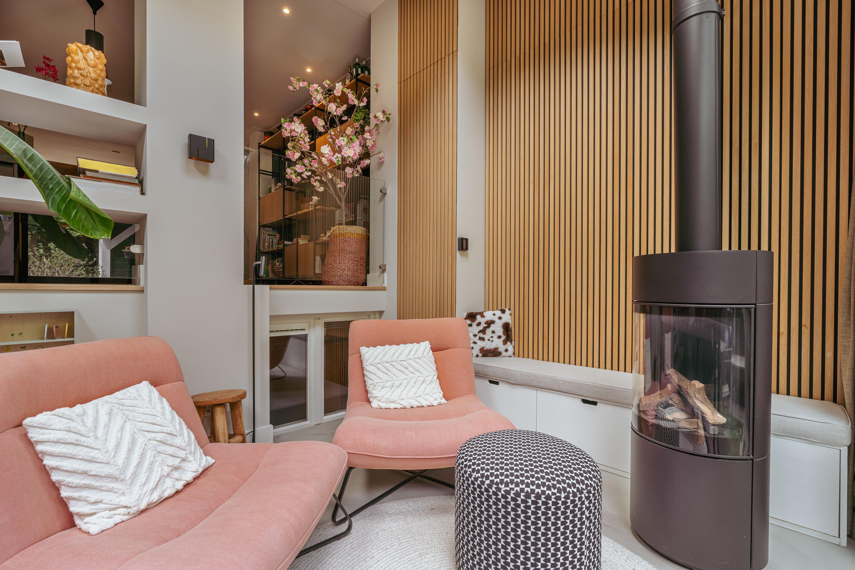 A few steps down, you enter the recently constructed extension with skylights, which allow plenty of natural light to flood the space. This area currently serves as an atmospheric dining room, with an additional seating area arranged around a modern gas fireplace. Floor-to-ceiling sliding glass doors lead to the beautifully landscaped east-facing garden of approx. 32 m², complete with a practical storage shed.