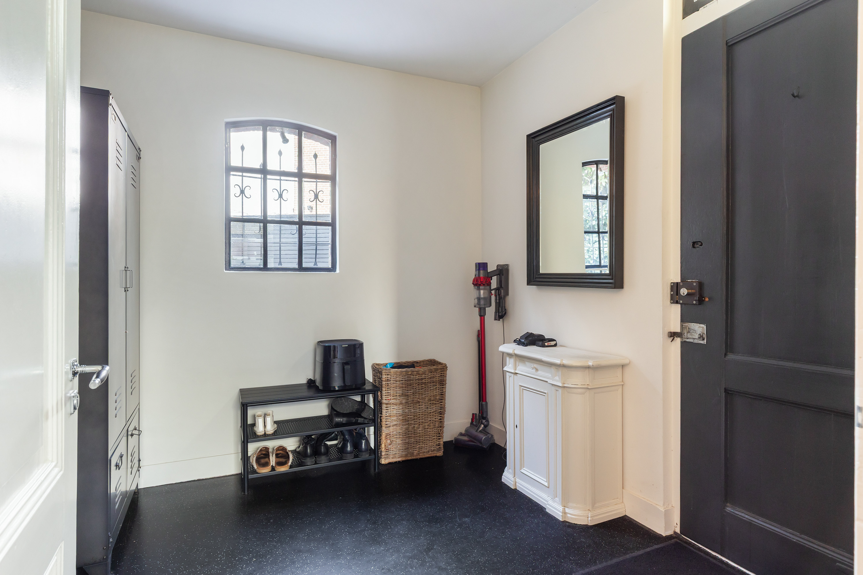 From the entrance hall, the staircase leads to the first floor, fitted with a stair runner and an elegant balustrade. The landing provides access to three bedrooms. The room at the rear, currently used as a children’s bedroom, features double doors opening onto a balcony. At the front is the principal bedroom, also with double doors leading onto a flat roof terrace. The third room is currently arranged as a dressing room with laundry and ironing facilities but can easily be converted into a bedroom and features a sliding window. Original panelled doors have been preserved on this floor, enhancing the authentic character of the property.