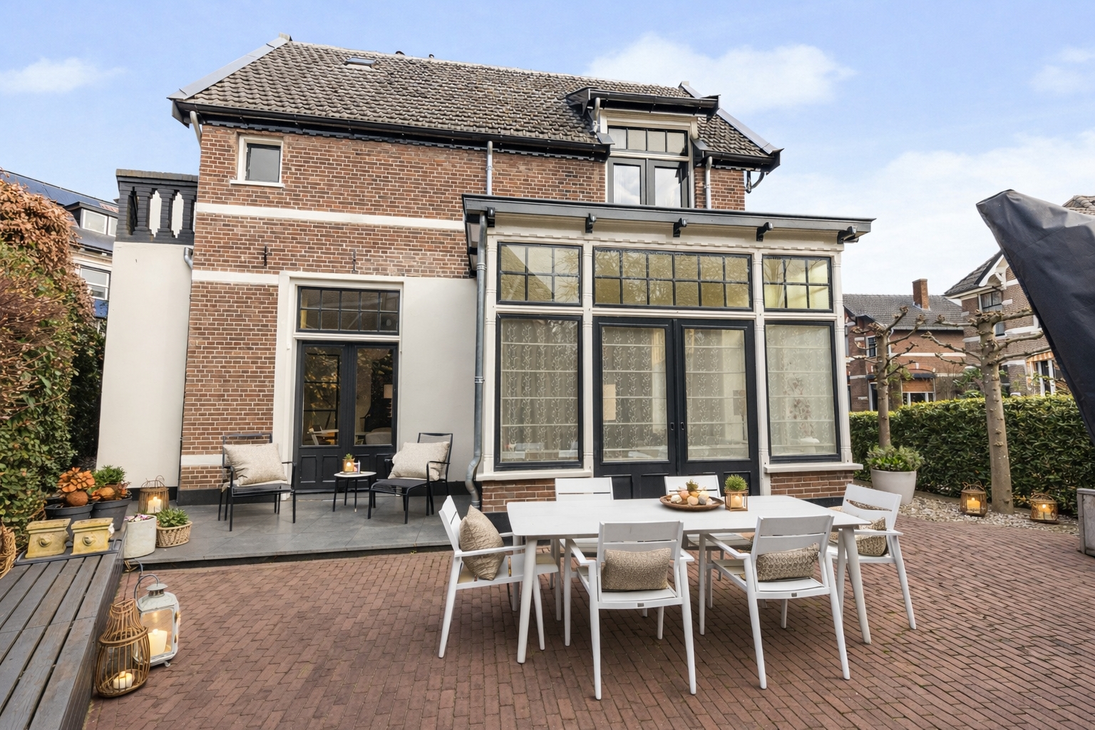 The front garden provides a distinguished entrance and is elegantly enclosed by ornate wrought-iron fencing, complemented by a green hedge and four carefully trained espalier trees. The combination of decorative brick paving and gravel lends a classic appearance that perfectly complements the architecture of the house.