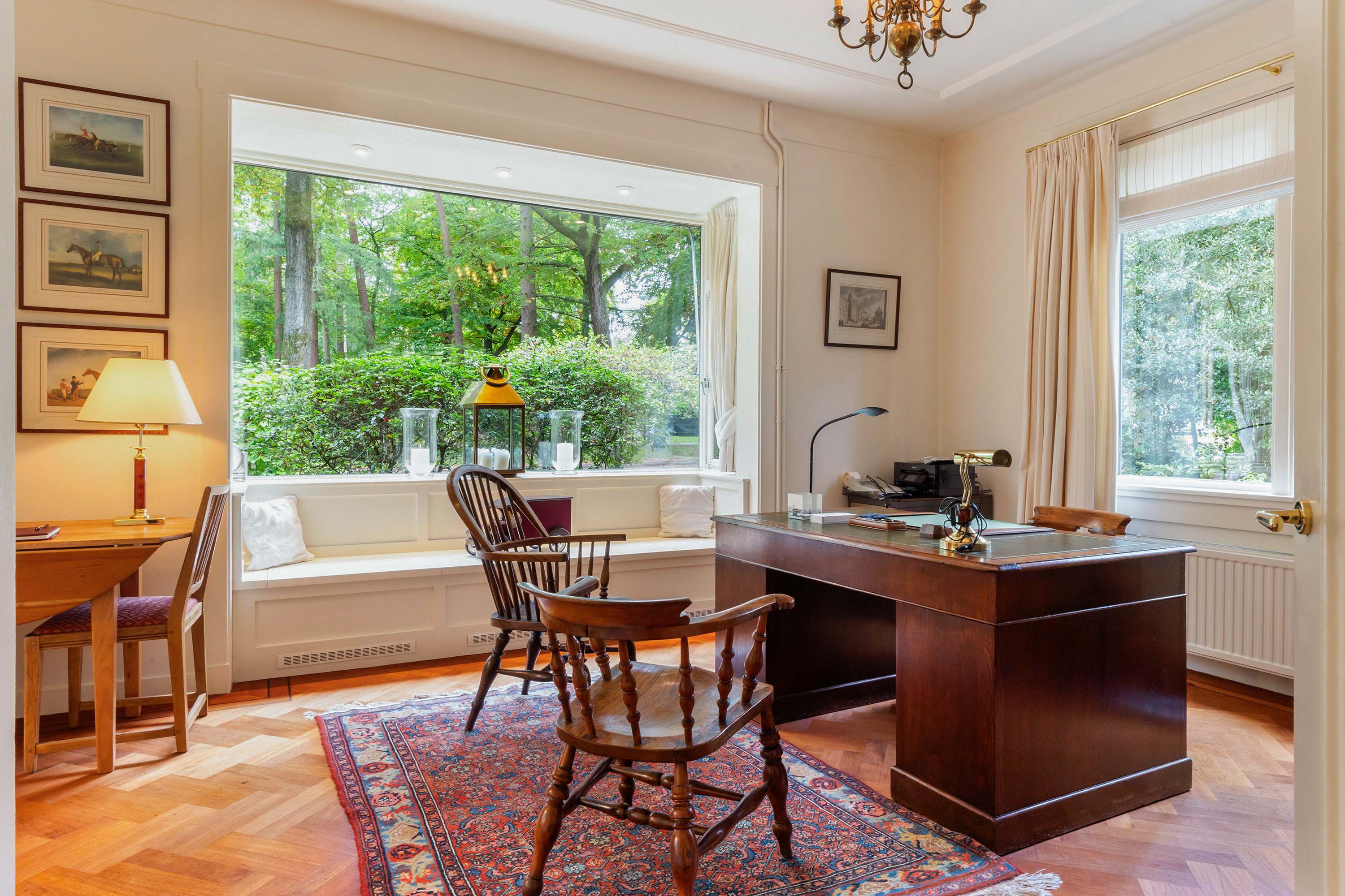 The study at the front of the house has a herringbone parquet floor with a double border and inlay, and offers views of the front garden and spacious drive. In the bay window, a bespoke bench with convector heating has been integrated, while sun blinds at the front enhance comfort. The windows give this room a warm, classic character.