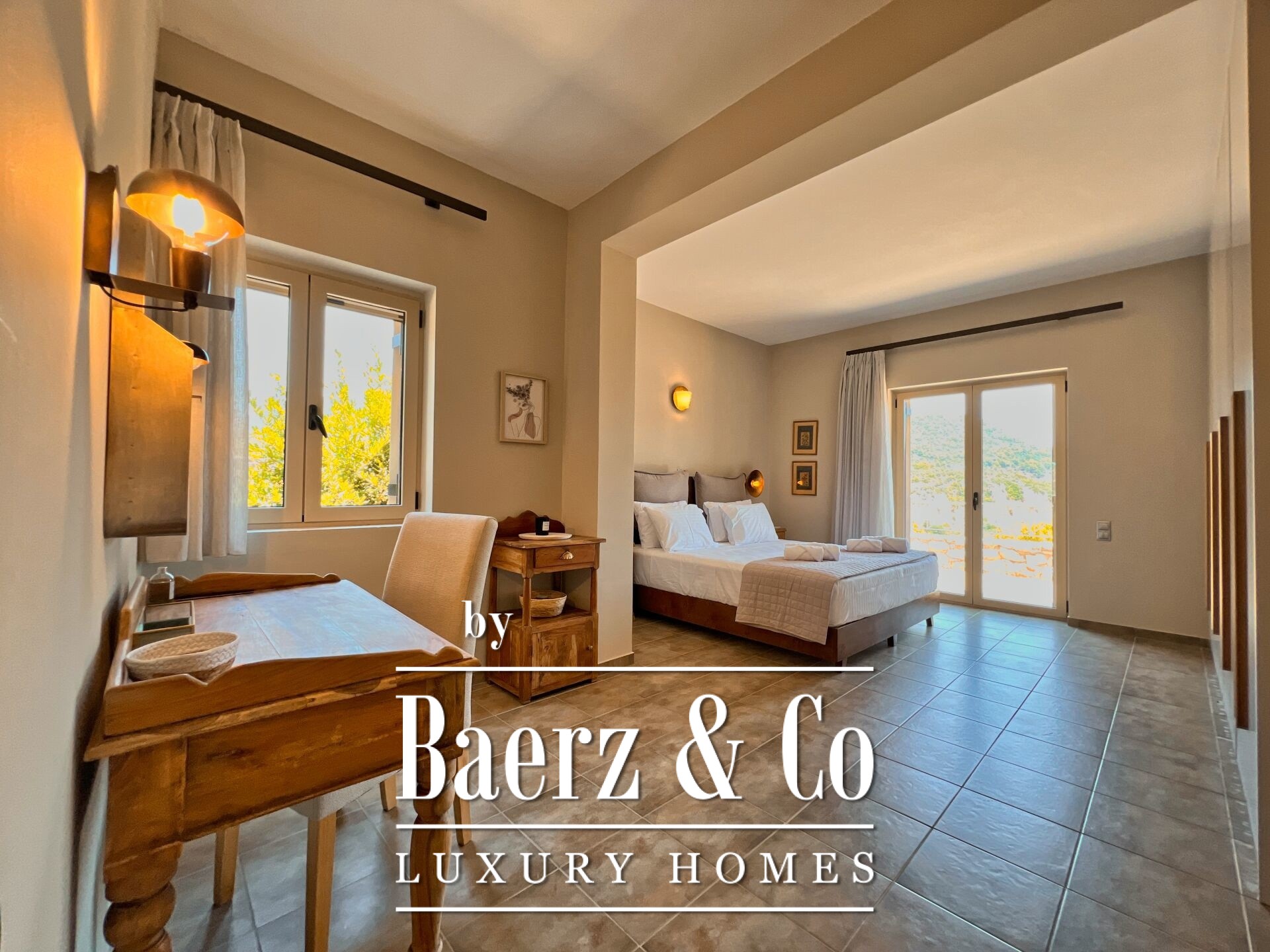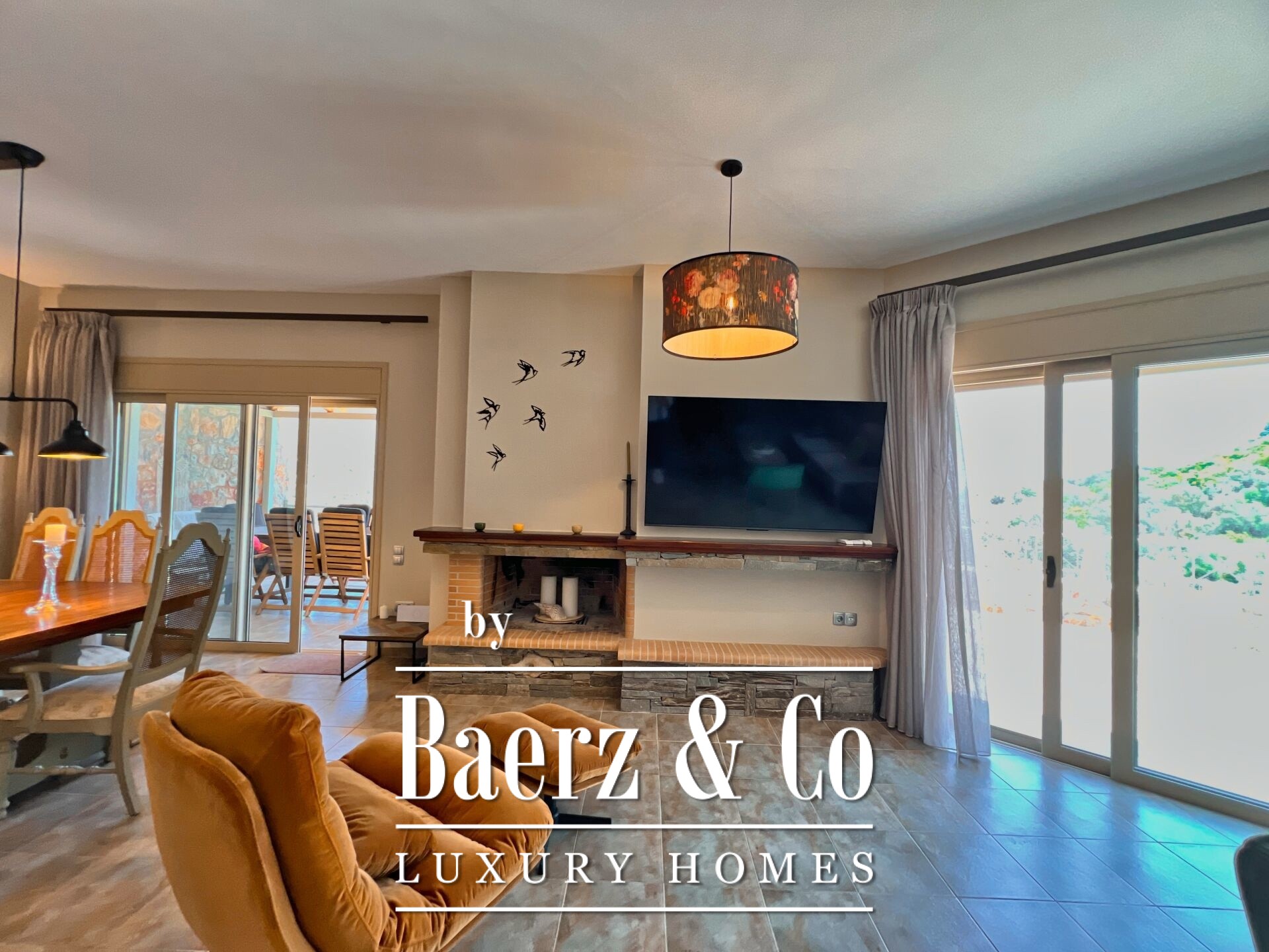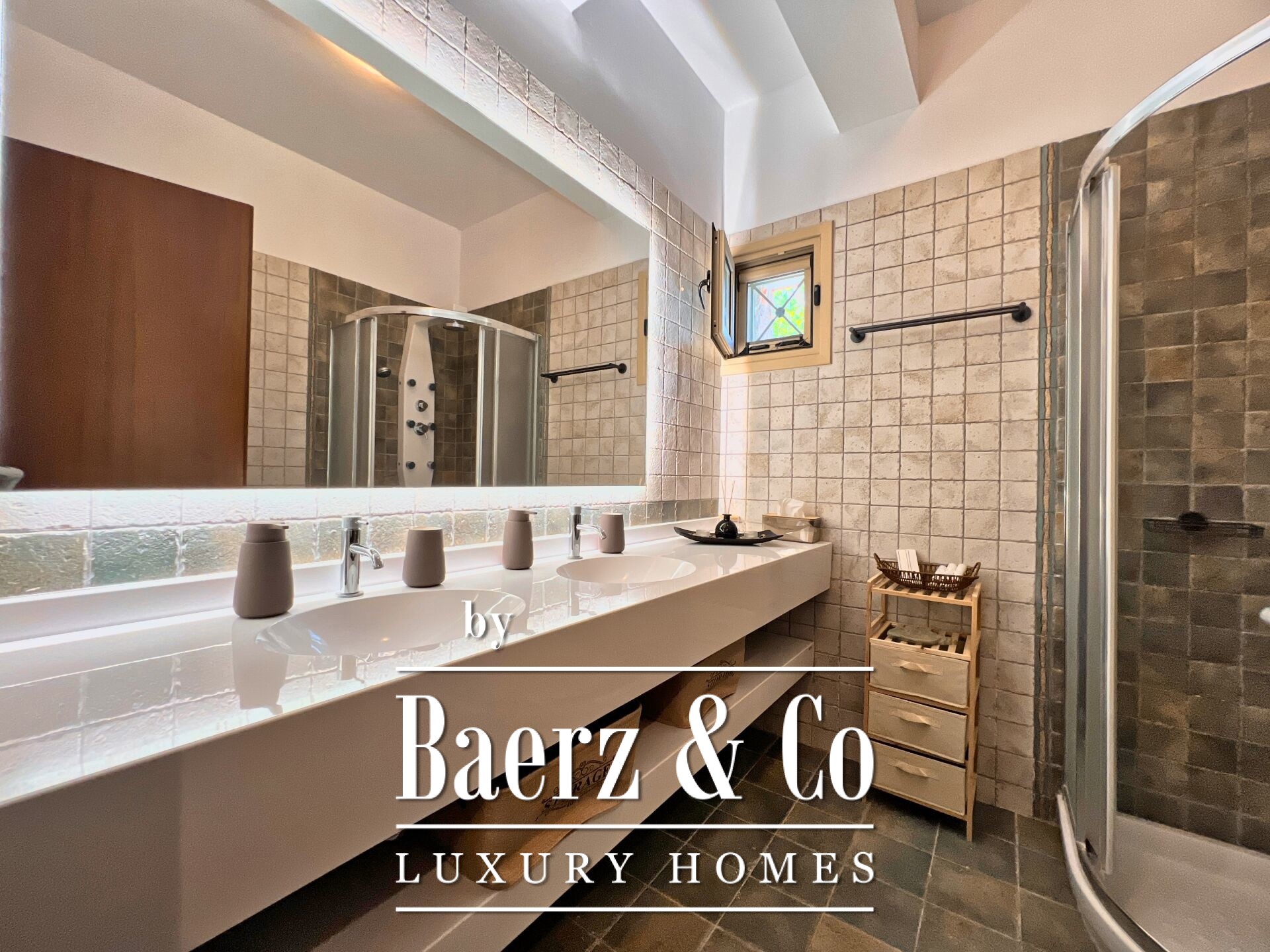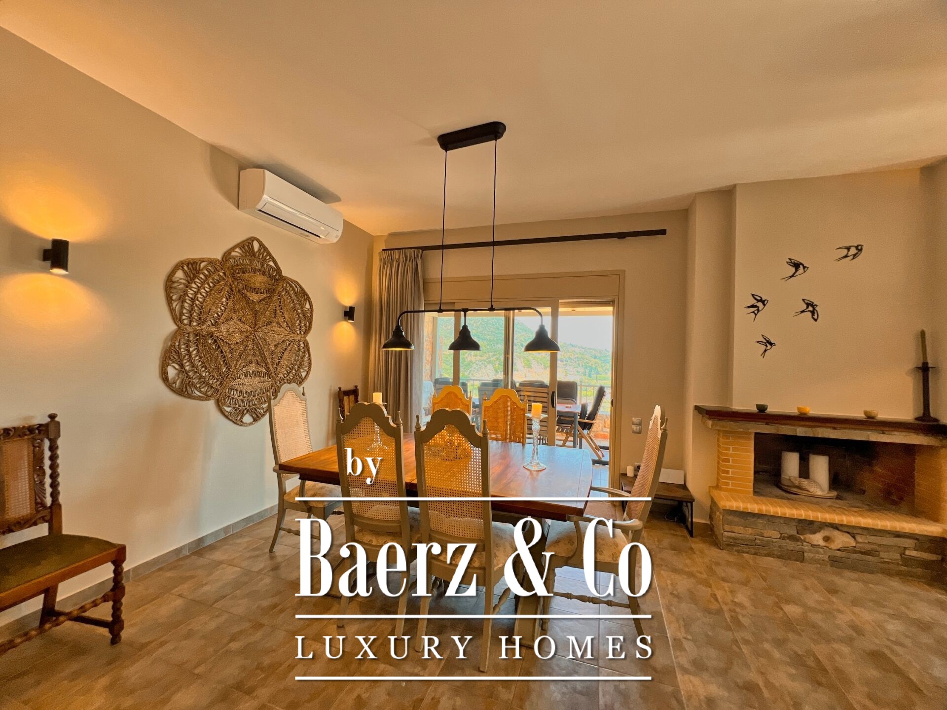 Outdoors, a graceful pool, stone seating areas, sheltered BBQ, and sunbathing terraces establish a rhythm for gatherings or quiet contemplation. The northeast orientation draws in morning light, while landscaped grounds echo the region’s timeless appeal. This luxury villa for sale in Archaia Epidavros is well suited for a discerning primary residence, tranquil summer home, or considered investment in the Peloponnese.