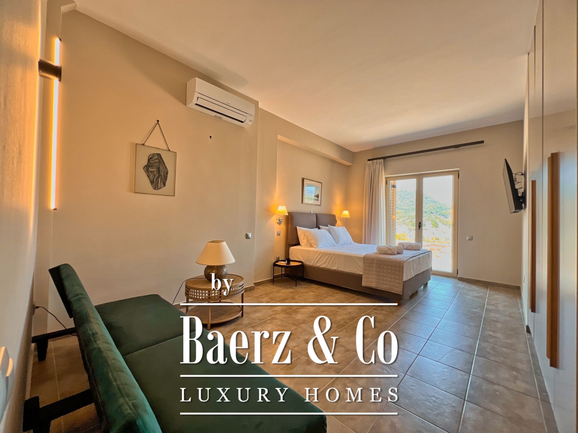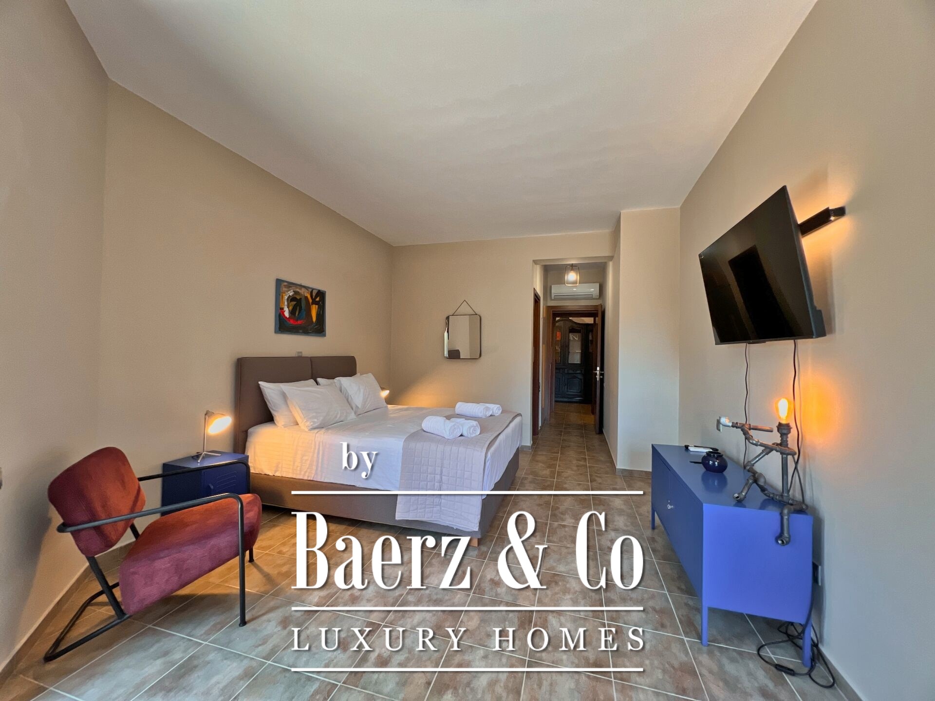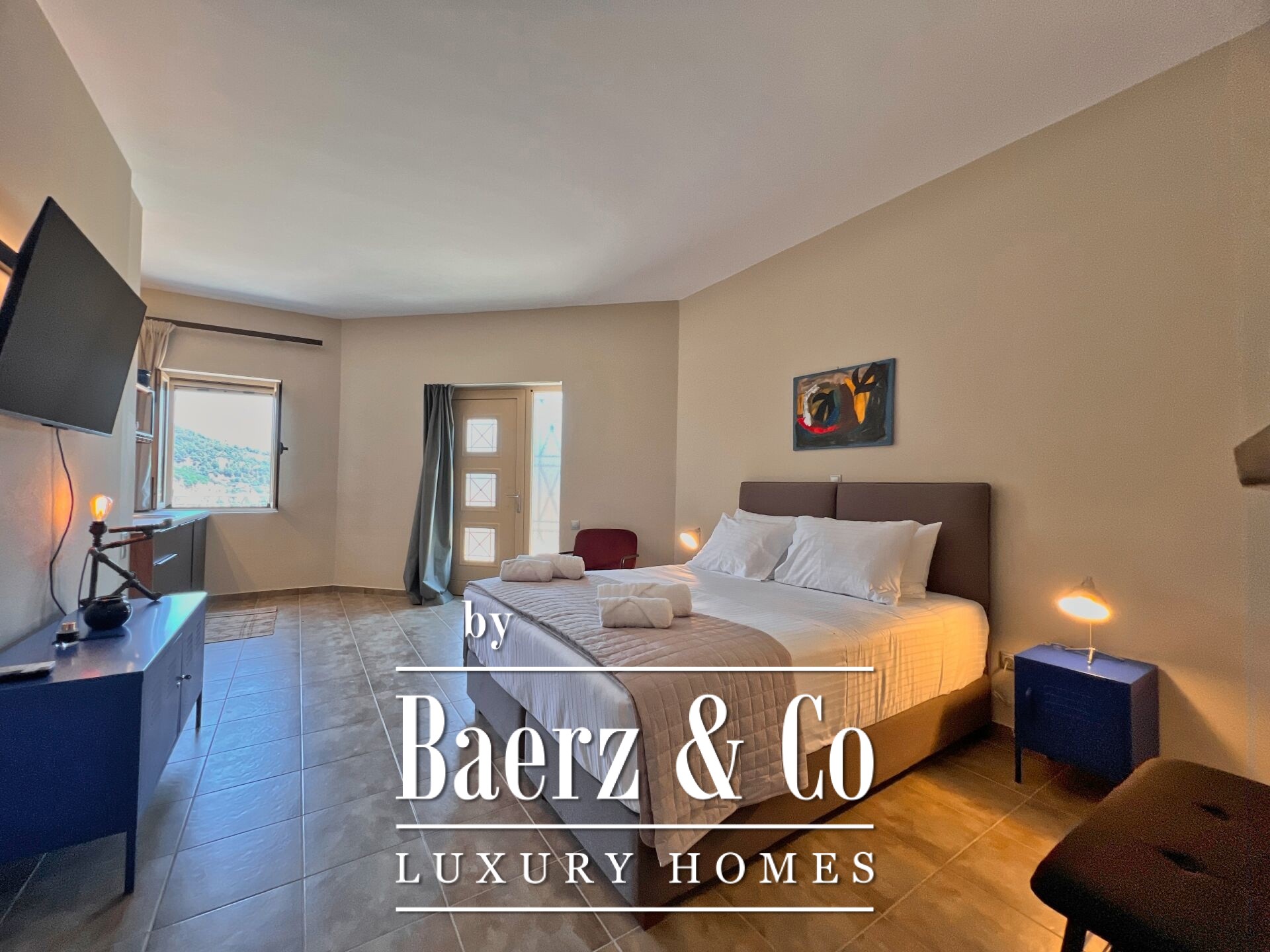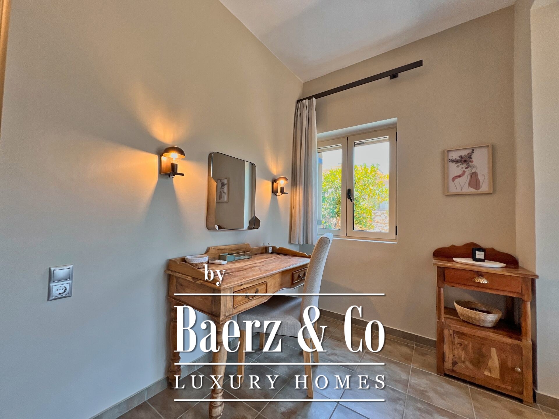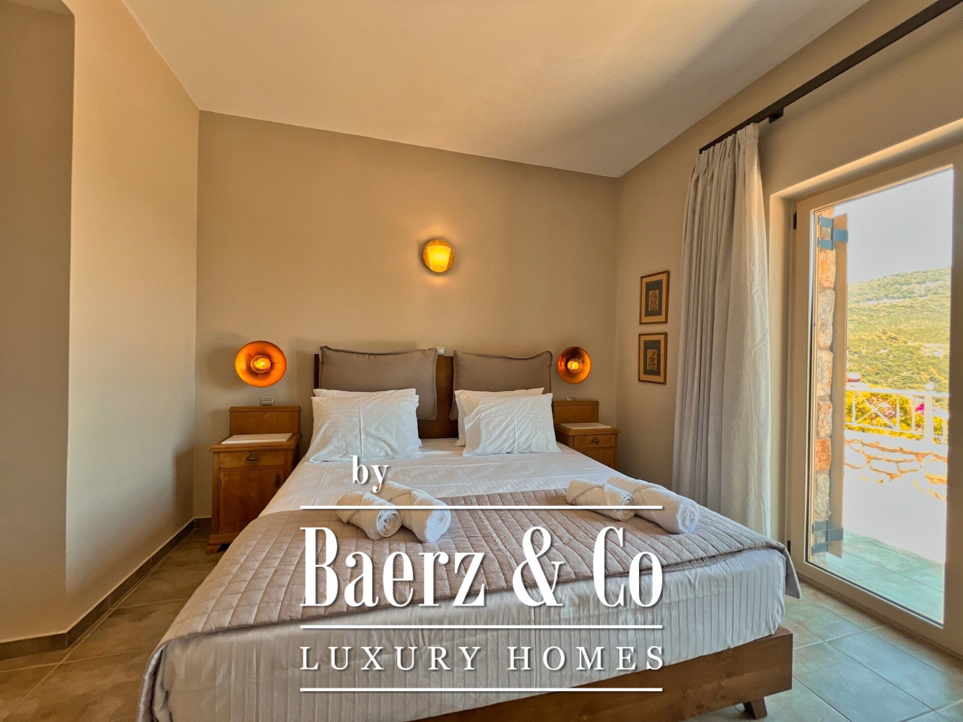 Outdoors, a graceful pool, stone seating areas, sheltered BBQ, and sunbathing terraces establish a rhythm for gatherings or quiet contemplation. The northeast orientation draws in morning light, while landscaped grounds echo the region’s timeless appeal. This luxury villa for sale in Archaia Epidavros is well suited for a discerning primary residence, tranquil summer home, or considered investment in the Peloponnese.
