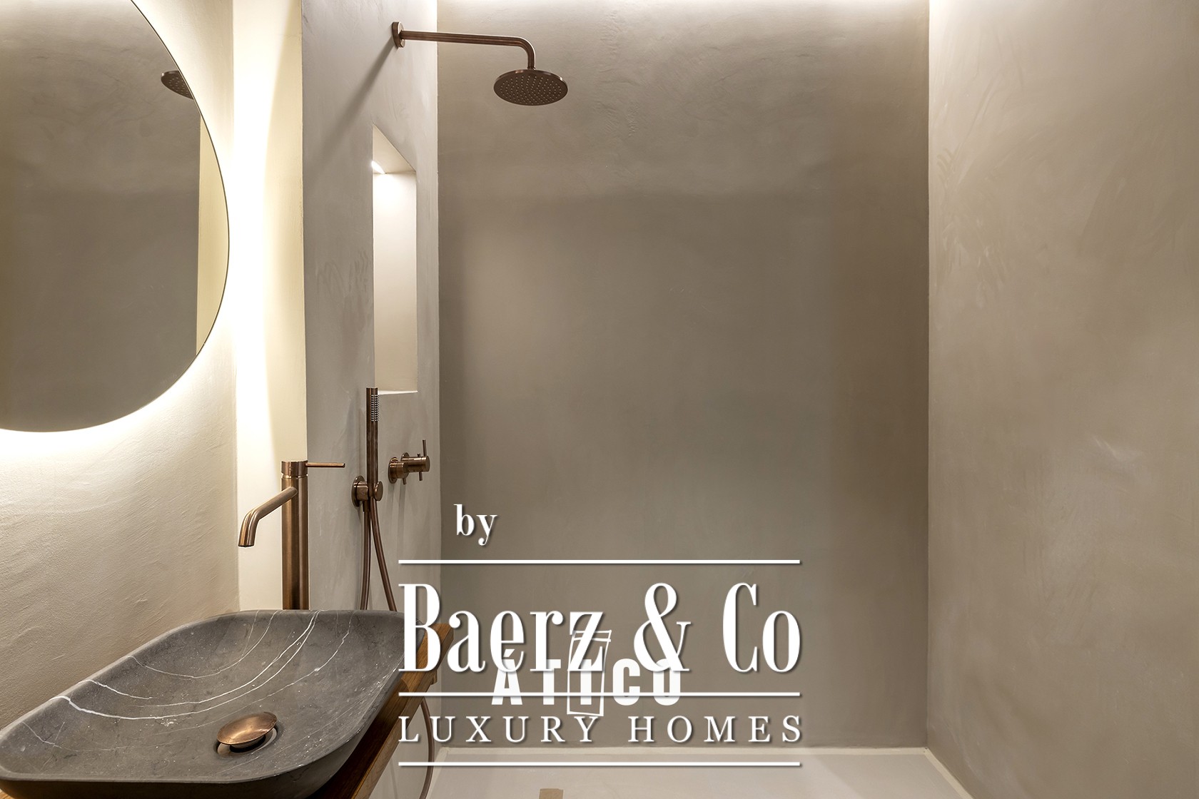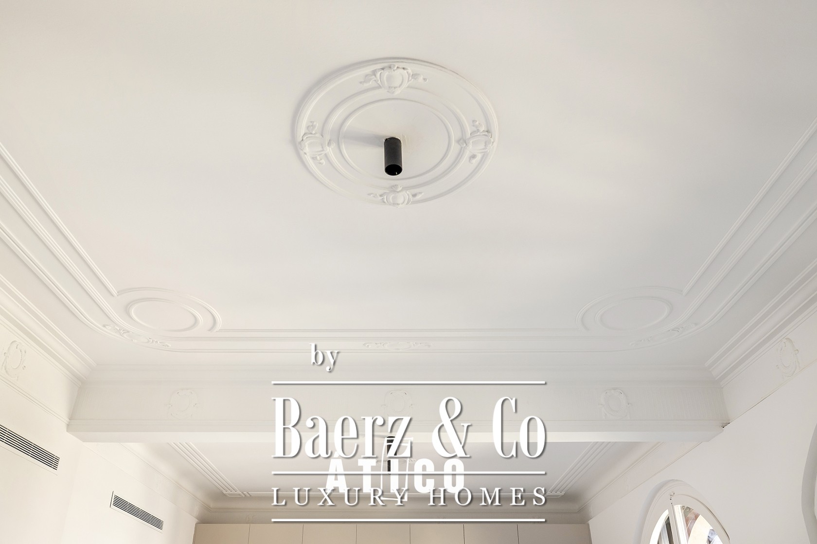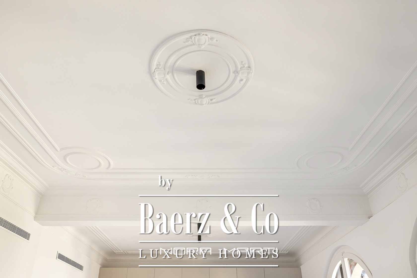 The apartment offers two well-proportioned bedrooms and two bathrooms, with an internal layout that instills a sense of openness and clarity. Restored galleries and windows shape the living experience, drawing in natural light and animating each space with warmth and rhythm throughout the day. Every lighting element has been chosen following an architectural light study, fostering a quietly sophisticated ambience from dawn to dusk.