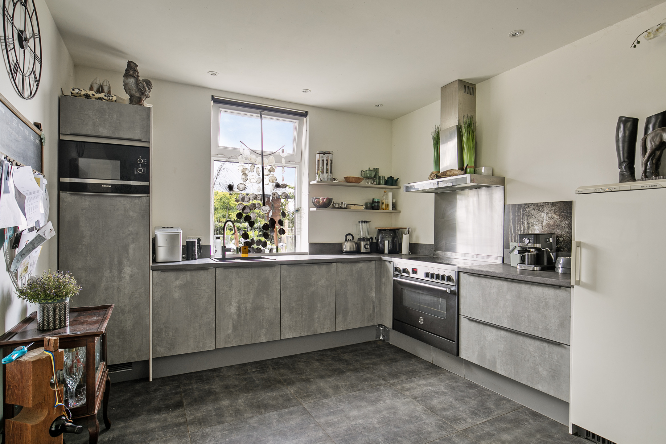 The right-hand section of the house was completely renovated in 2019. This part is arranged on the ground floor with a hall, a living kitchen, a spacious living room, a bathroom, laundry room, toilet room and a cellar cupboard. The hall has a tiled floor, stucco walls and a stucco ceiling. The meter cupboard and a closet with storage space are located in the hallway. The pleasant living kitchen is in open connection with the adjacent living room and is equipped with a corner kitchen layout. This kitchen unit is equipped with a sink, an electric cooker with an oven, a microwave, a dishwasher and a fridge. A large window above the worktop offers a nice view of the accommodation and provides plenty of light. Room-high windows in the side and rear elevations also provide a sea of light in the living room. In addition, a wicket door provides access to the rear garden. The living room is finished with a tiled floor, stucco walls and a stucco ceiling. There is also a large closet wall with sliding doors with plenty of practical storage space. The fully tiled bathroom is fitted with a bathtub, a walk-in shower and a wide washbasin with a storage cabinet. The stucco ceiling has recessed lighting.