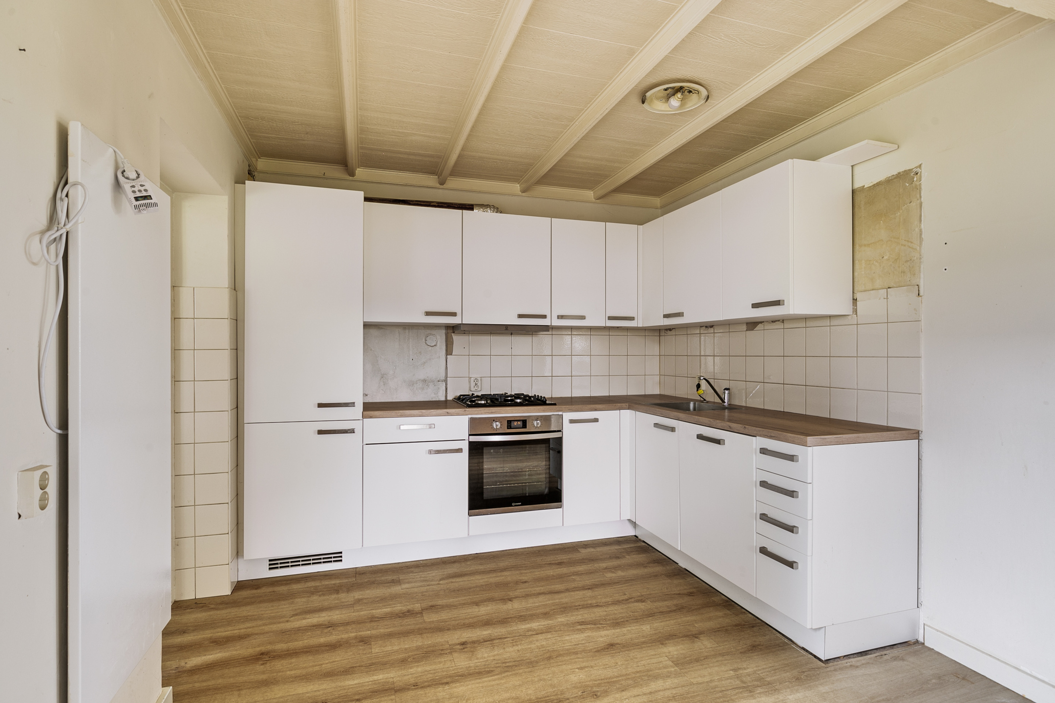 The living room with open kitchen is finished with a laminate floor, partly stucco and partly papered walls and a wooden beamed ceiling, in a light colour scheme. Here, too, several windows provide plenty of light. There is also a fireplace with a gas stove. The corner kitchen unit is equipped with a sink, gas hob, oven, dishwasher and fridge. The practical utility room has vinyl flooring and fully tiled walls. A wicket door provides access to the rear garden and there is a simple kitchenette with a sink and storage space.