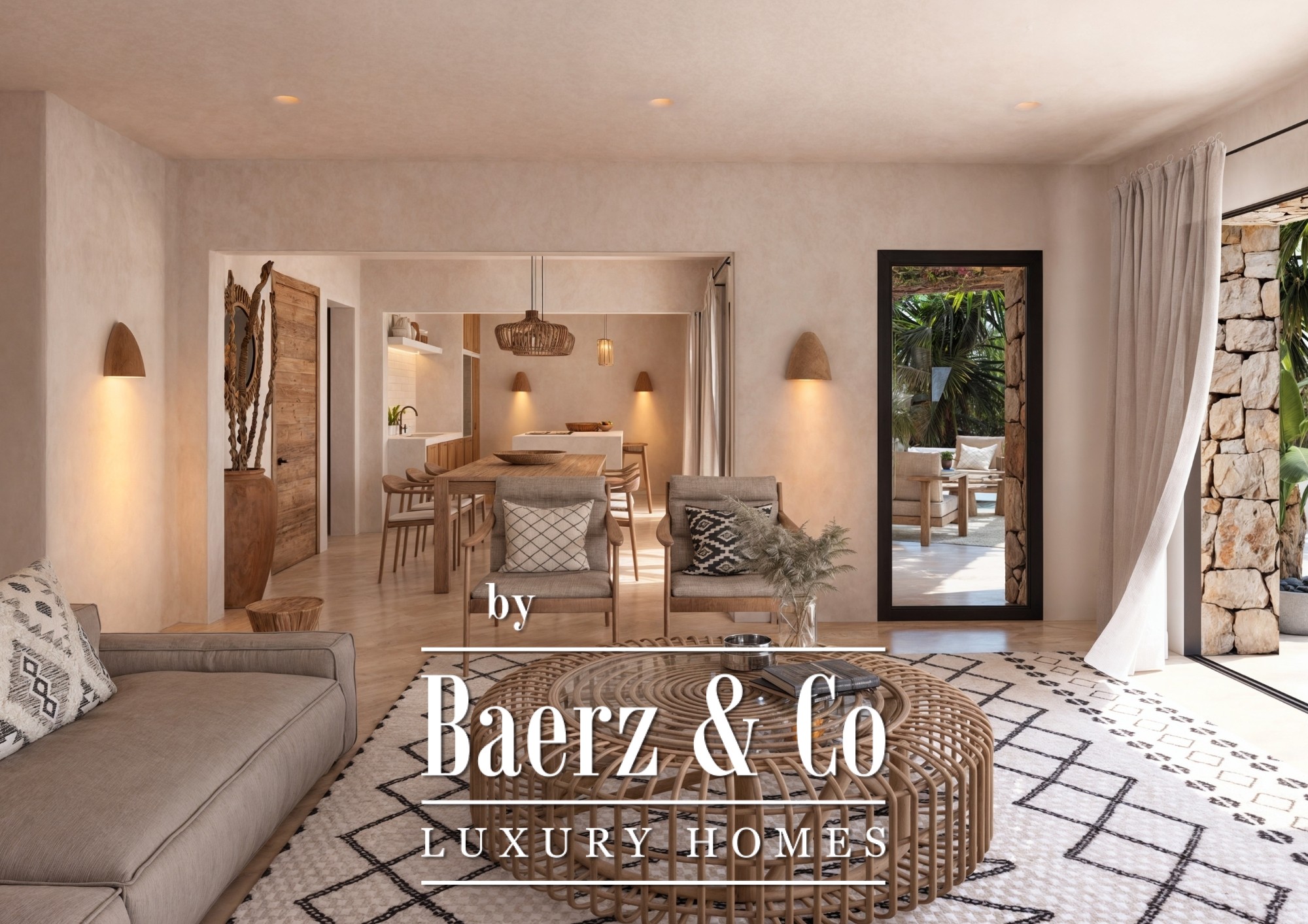 The heart of the residence is a luminous living area anchored by an open-plan kitchen with high-quality appliances. From here, access to the terrace and naya is seamless, leading to a private swimming pool, integrated lounge zones, and an outdoor kitchen where quiet afternoons and convivial gatherings unfold. Four bedrooms are all en-suite, each finished with careful attention to materiality and discretion. Underfloor heating, driven by an energy-efficient heat pump, and silent integrated air conditioning deliver year-round comfort while upholding environmental sensibility.