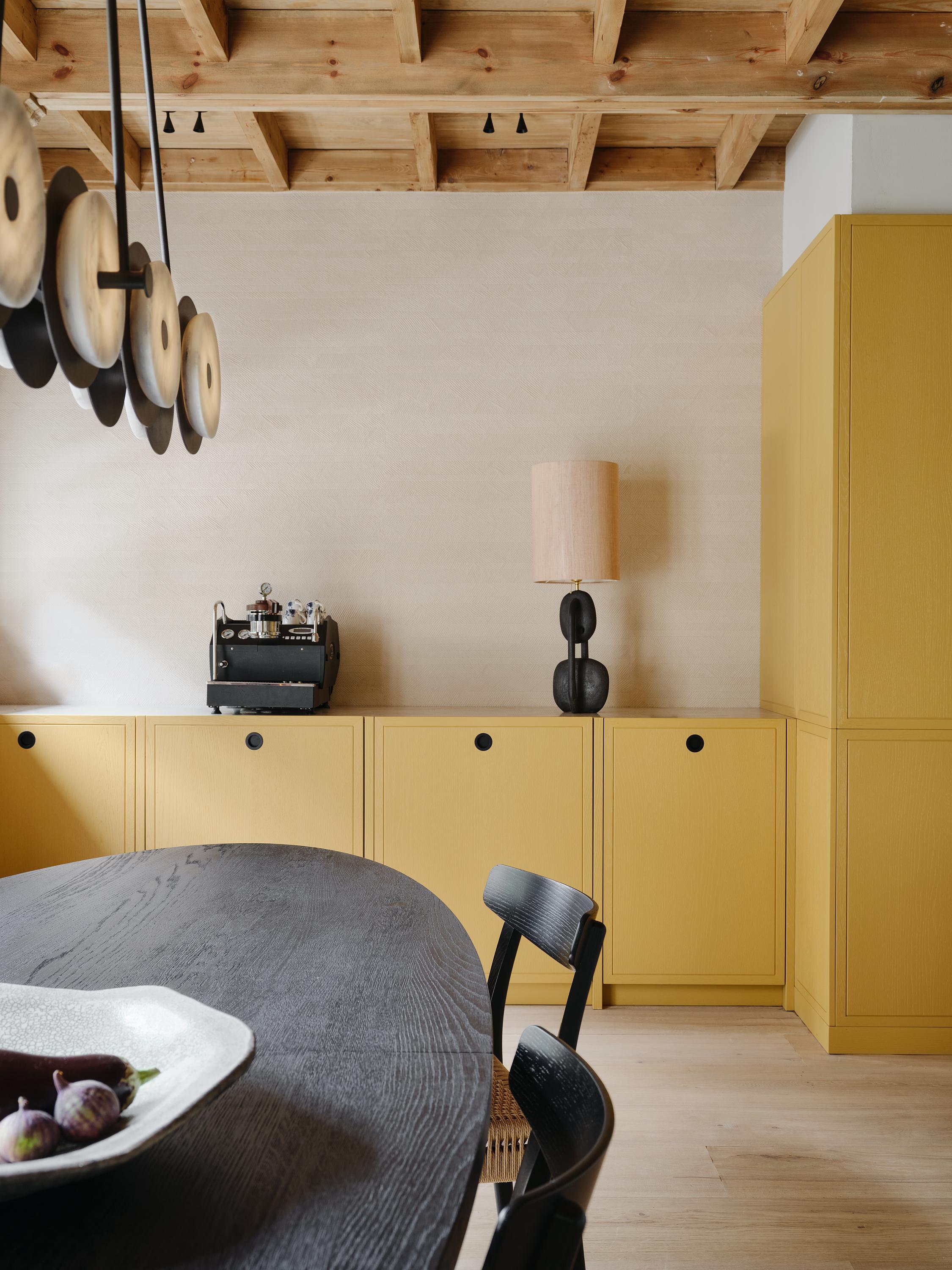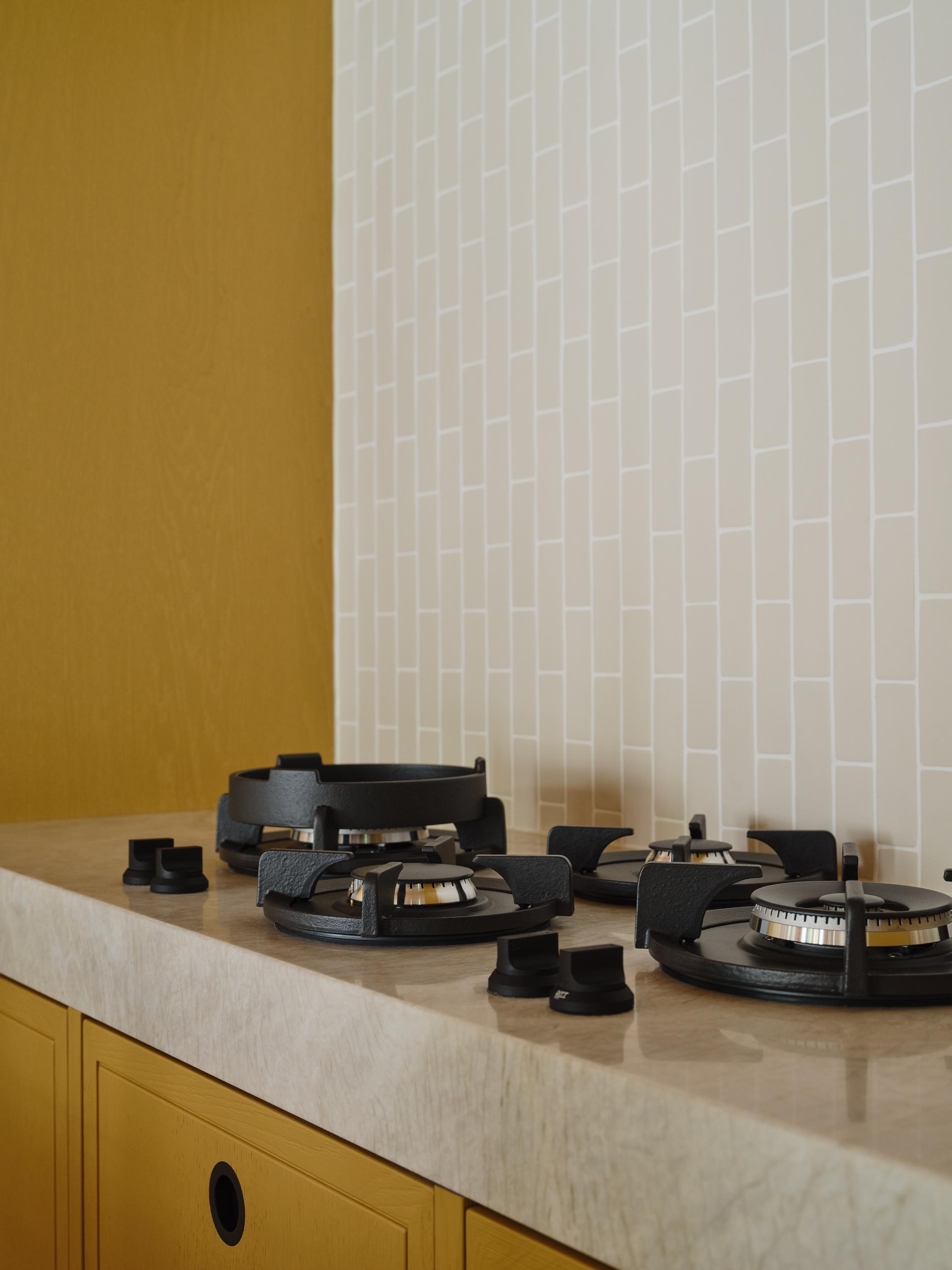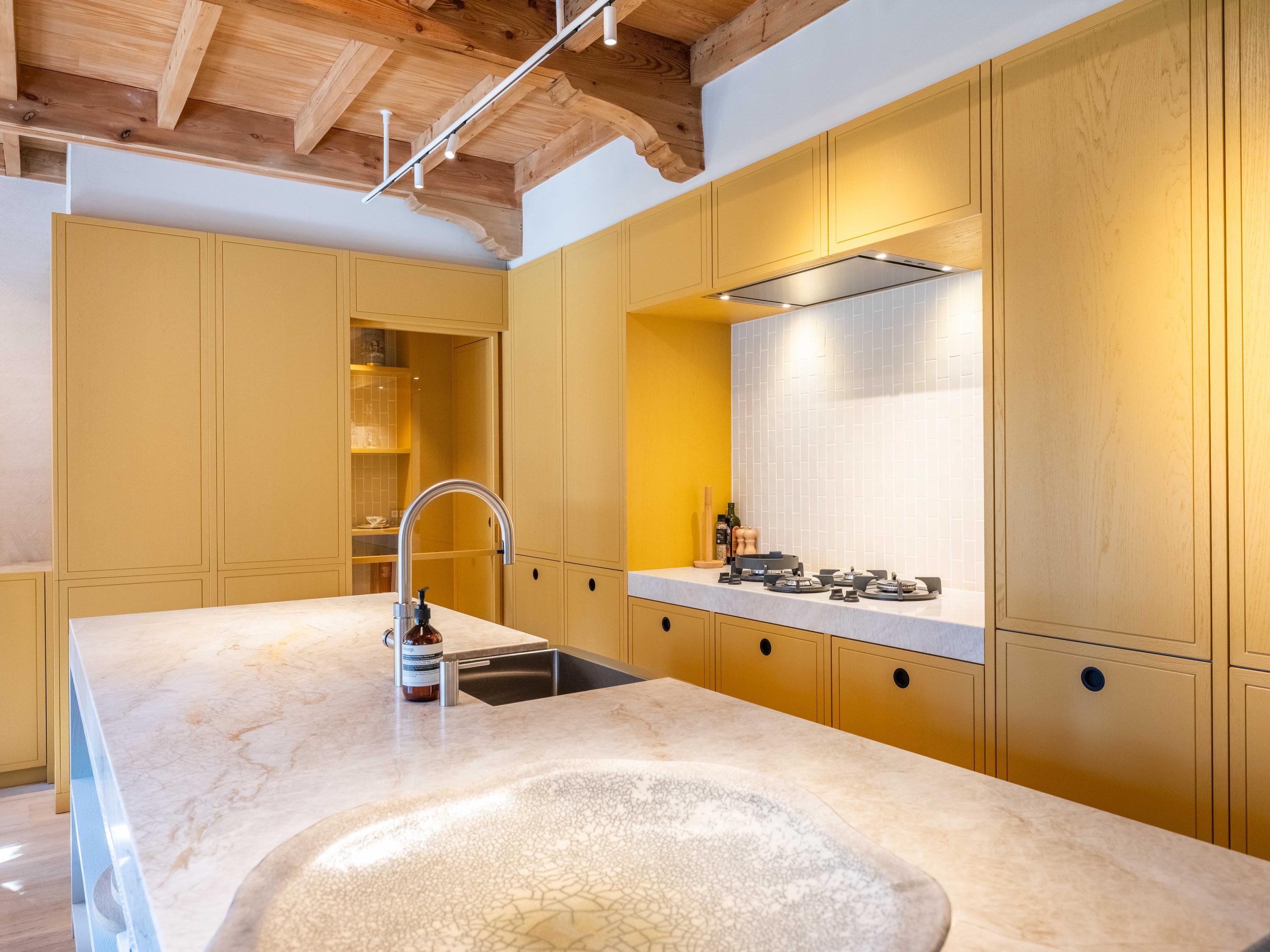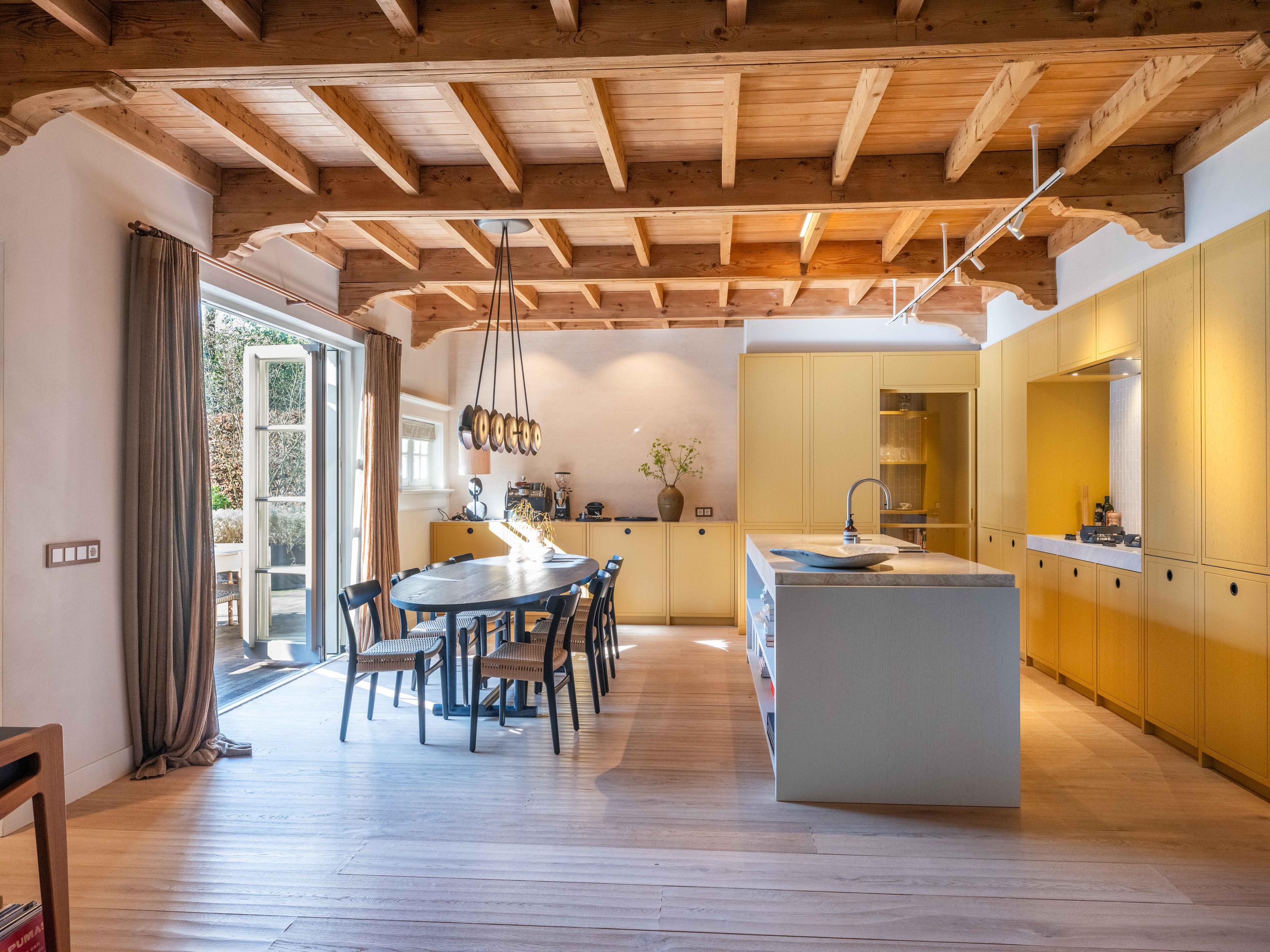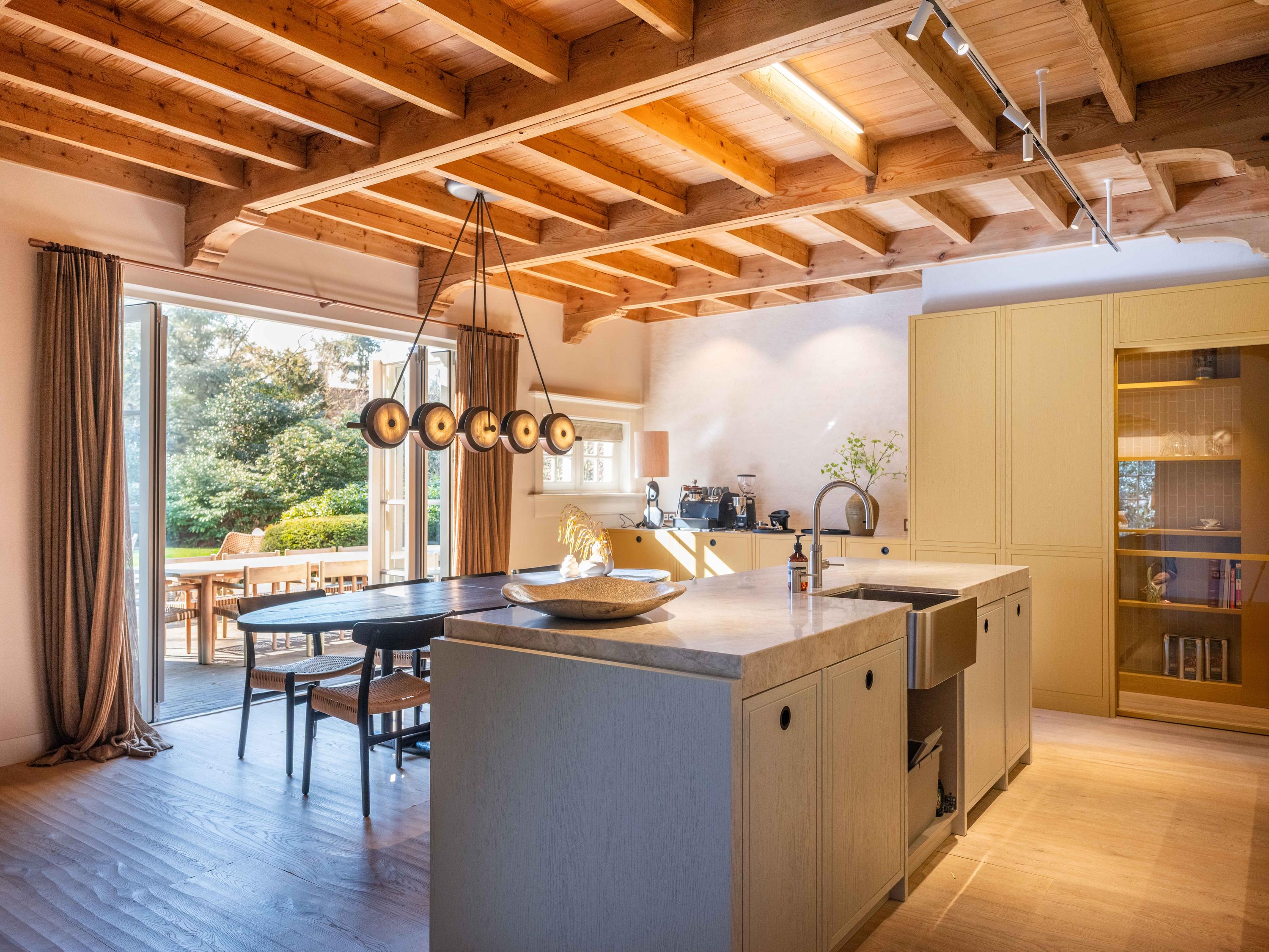 Let’s go inside: the entrance leads to a spacious hall with a cloakroom, a modern toilet and access to the basement. From here, you walk through to the spacious kitchen-diner, the central hub of the home. This features a cooking island, natural stone worktops and high-quality built-in appliances. Thanks to the French doors, there is a direct connection to the outdoors.